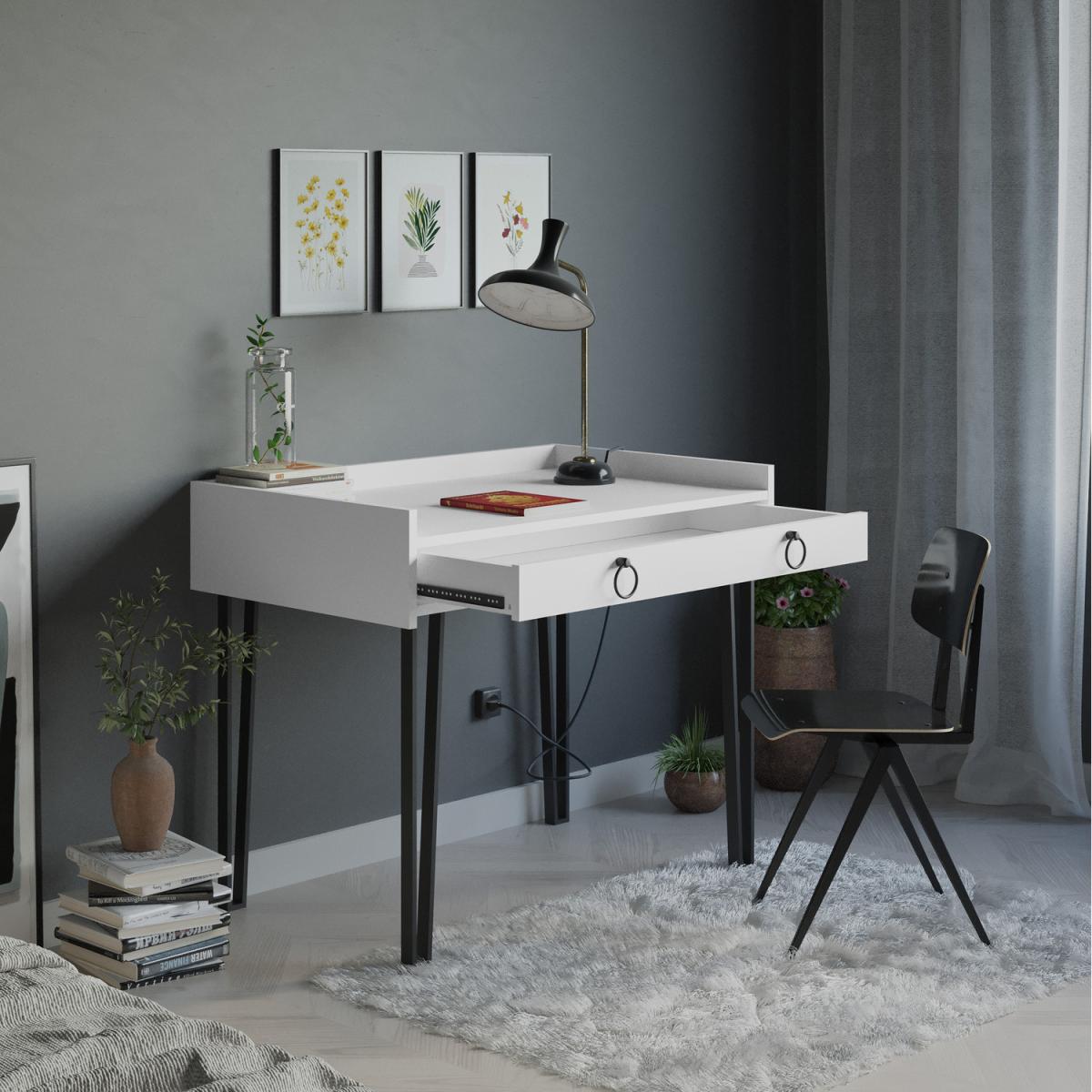 I love this desk because of its sleek, modern design and practical features, like the drawer for organisation and sturdy metal legs that add an industrial edge. It works perfectly in minimalist or contemporary interiors, providing a clean workspace without clutter. For styling tips, consider pairing it with a simple desk lamp and some greenery to soften the look, or add colourful accessories for a touch of personality. Its neutral white finish makes it versatile enough to suit various colour schemes, and the drawer offers handy storage to keep the surface tidy, making it ideal for compact spaces or home offices.