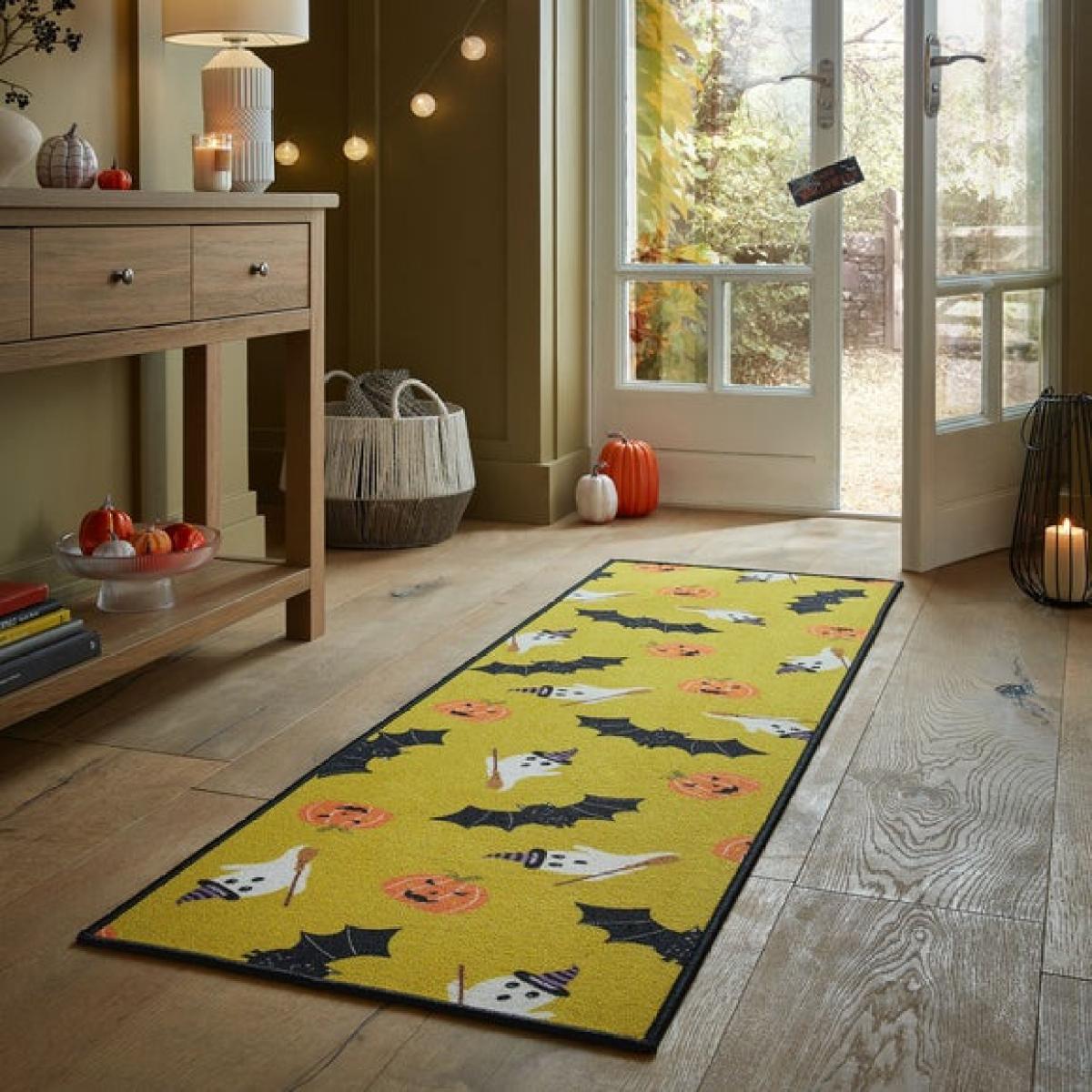 * Machine Washable * Anti-slip Backing * Playful Halloween Character Motif Make a bold entrance this season with the Spooktacular Halloween Washable Runner, designed to bring festive fright to your hallways, corridors, and walkways. Featuring a spooky playful Halloween Characters, it’s the perfect way to add seasonal charm while keeping things stylish and functional. The anti-slip backing ensures it stays safely in place, and the washable surface makes cleanup a breeze. Ideal for high-traffic areas to instantly elevate your Halloween décor. The Rug Pictured is: 60x180cm. Care Instructions: Shake or vacuum to remove and loosen fibres, dirt and debris using a nozzle attachment. In the case of spillage, blot with a clean cloth. Place into the washing machine on a gentle cycle at 30 degrees and air-dry flat. For best results lay flat and reshape as soon as possible. We recommend our small and medium size washable rugs up to 120 x 170 will fit most washing machines sizes between 8 - 10kg. Please check your manufacturer guidelines before washing and do not overload the drum. For Large and High pile washable rugs a laundrette service may be required. Please Note - This rug features a backing made from (PVC/Latex) which can react with certain flooring finishes or chemical cleaning products over time and cause discolouration or staining. Do not place on floors that have recently been waxed, oiled or chemically cleaned. Ensure floors are completely dry before laying down rug. Regularly lift and clean beneath the rug to prevent moisture or chemical build up. If in doubt test in a small area first or use a rug pad to protect the flooring underneath.