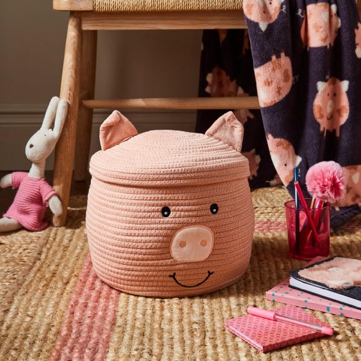 * Adorable Pig design * Lovely gift idea * Perfect for storing all your bits and bobs Keeps clutter in check with a smile thanks to our SPot the Pig Basket with Lid, a delightful storage solution that's as fun as it is functional. With its adorable pig design, it's sure to charm little ones and grown up alike. Perfect for popping away toys, books or all those everyday odds and ends, it makes tidying feel a bit more magical. The handy lid keeps things tucked out of sight while adding to its playful look. Ideal as a lovely gift, especially for children who love animals with personality. Storage with a snout of character.