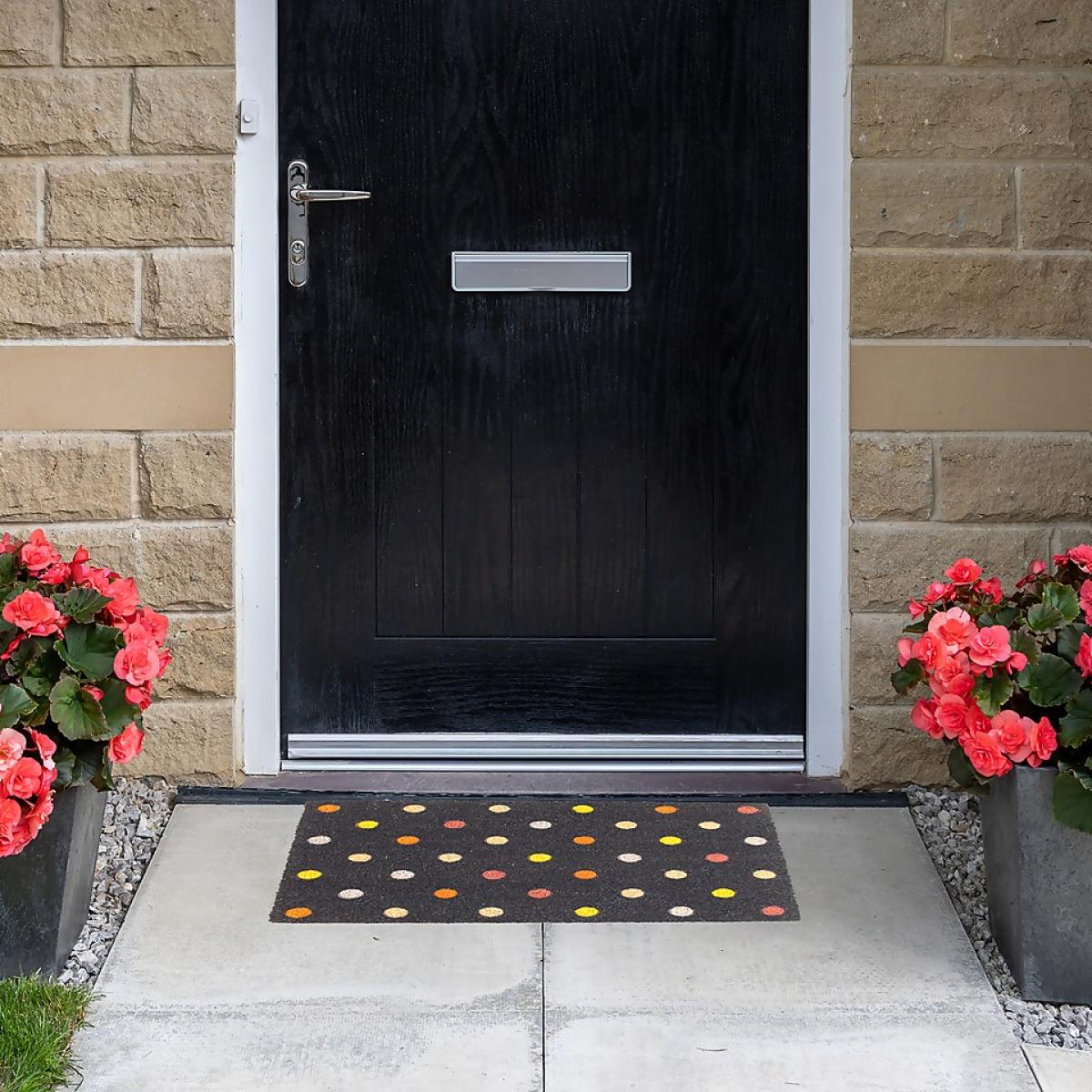 I love how this doormat adds a bit of colour and playfulness to a practical space. Its bold polka dot pattern makes it suitable for a variety of interiors, from contemporary to more eclectic schemes. It works particularly well in neutral or minimalist entrances, providing a lively pop without overwhelming the area. As a styling tip, pair it with simple, sleek door hardware and a tidy porch space to let the pattern really stand out. Its size is versatile and perfect for small to medium doorways, making it a functional yet decorative addition that welcomes guests with a cheerful touch.
