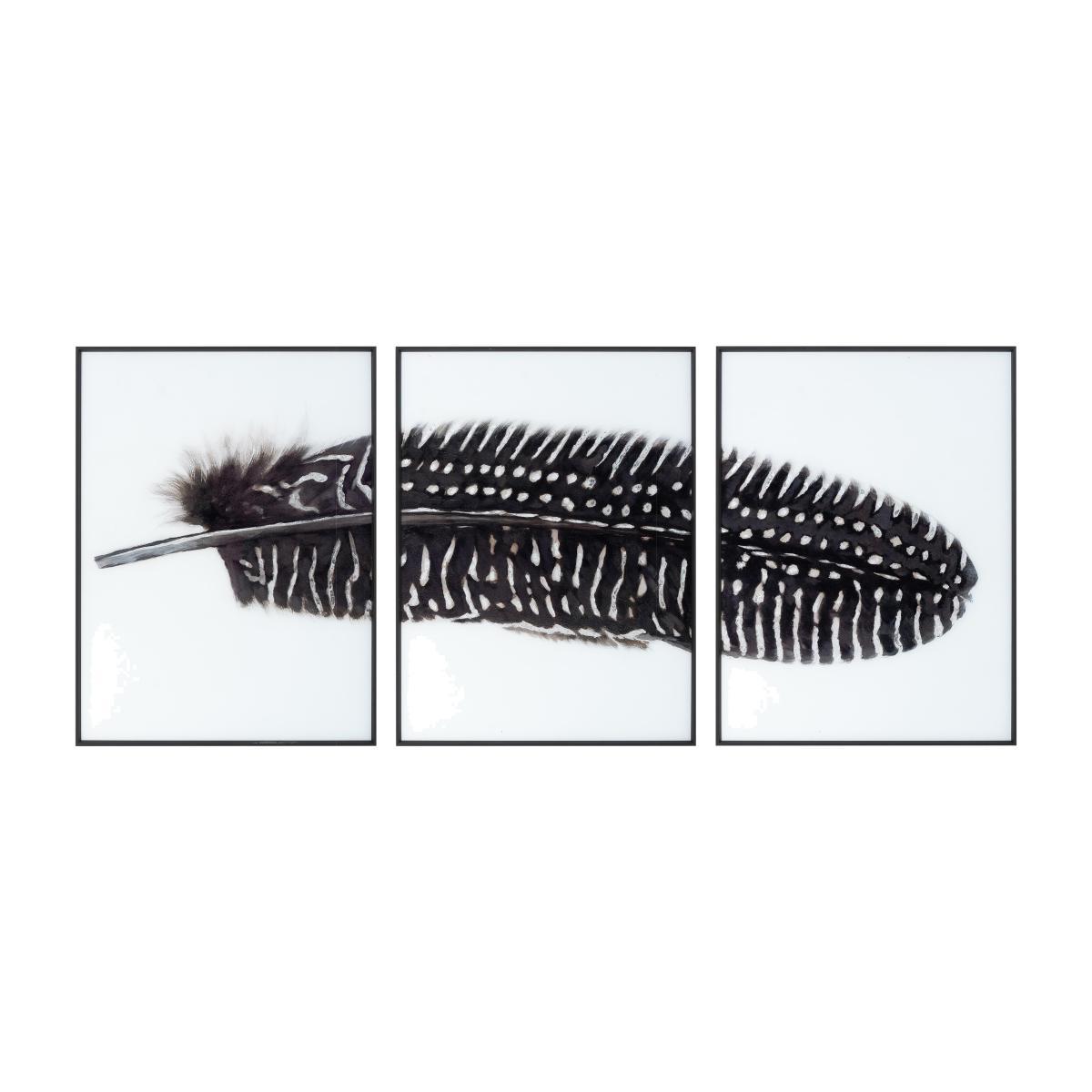 I love this feather-themed set - it’s a subtle yet striking way to introduce monochrome textures into a space. The triptych format works particularly well in contemporary or minimalist interiors, acting as a focal point without overwhelming the room. It’s quite versatile, suited for living rooms, bedrooms, or even hallways, where it can add a touch of natural elegance. Practical styling tips include pairing it with soft textiles like velvet cushions or throws to complement the feather motif, or layering it alongside other black-and-white artwork for a curated gallery wall. Keep framing simple and sleek to highlight the monochrome design and allow the feather details to stand out.