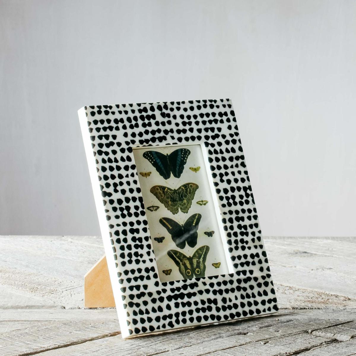 I love the spotty black bone frame for its bold, graphic appeal - it’s perfect for adding a modern edge to a variety of interiors. It works particularly well in minimalist or monochrome schemes, but can also add an unexpected touch of pattern to more eclectic spaces. For styling, try pairing it with other black and white artwork or accessories to create a cohesive look, or let it stand out as a statement piece on a gallery wall. It’s versatile enough to sit on a sideboard, bookshelf, or desk, and works especially well with nature-inspired themes due to the butterfly imagery. Keep surrounding decor simple to let the pattern and the frame itself really pop.