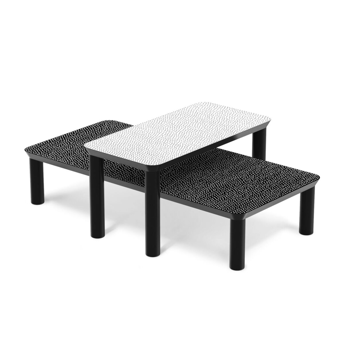 Spotty is a family of graphic, contemporary coffee tables. The thick screen-printed MDF top is decorated with an exclusive polka dot design, hand-drawn by the famous French designer Pierre Charpin. This constellation of points, which is repeated continuously over the entire surface, creates shadow effects and an impression of three-dimensionality. This vibrant surface releases a feeling of tranquillity and well-being. Like stripes, polka dots are part of these timeless prints, able to come down through the years without ageing. Very chic, the black and white pairing fits brilliantly into any setting. Spotty coffee tables stand out with their essential lines and balanced proportions which, like a sober frame, enhance the incredible decor of the top. The four cylindrical solid legs in lacquered beech add perfect stability to the table. Spotty tables are available in different sizes and heights. The tables can be used separately or combined: the different heights let you overlap the tops. Pierre Charpin explains: "I tried to breathe life into this surface, so that it becomes a sensitive presence, which keeps within it all the vibration, the humanity of the drawing made by hand. ".