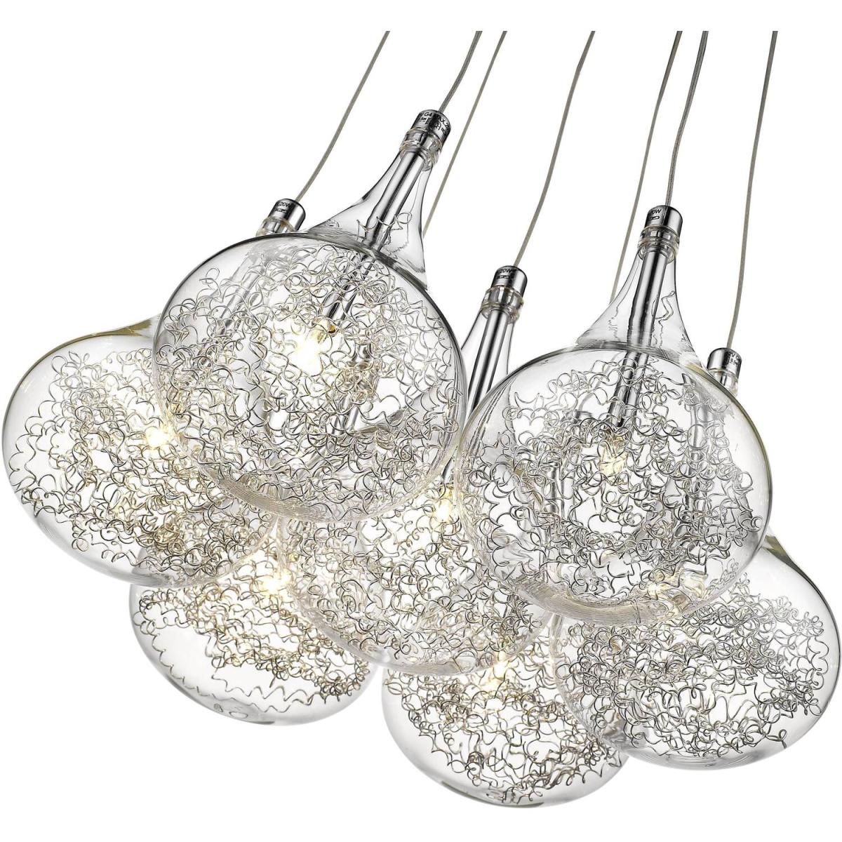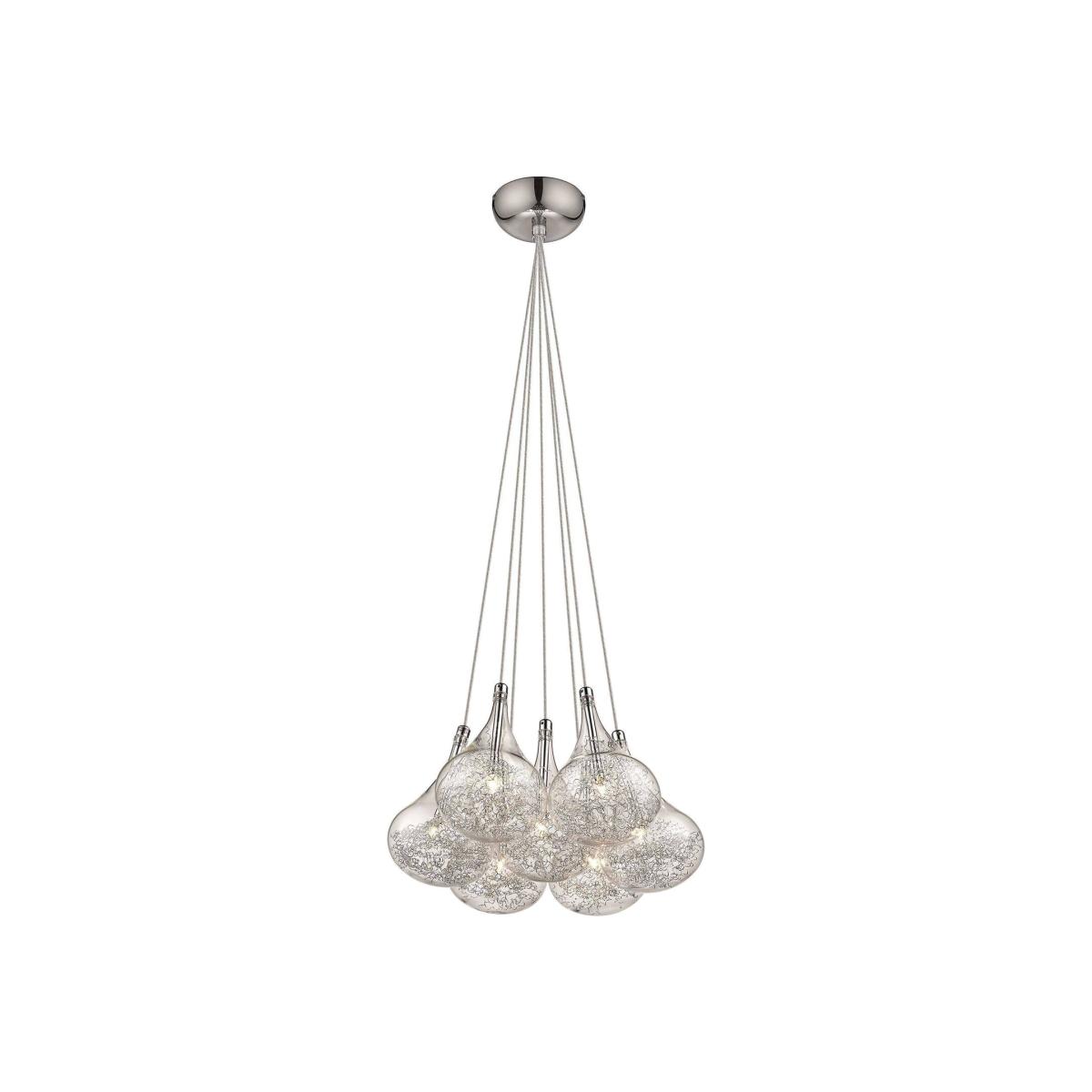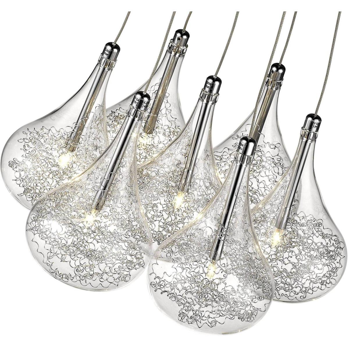 Aluminium, chrome and glass combine beautifully to create a contemporary classic. features spirals of aluminium wire housed in pear-shaped clear glass in clusters of seven or ten. Adjustments can be made to the cable to alter the depth of its fall - perfect above a dining table or as an eye-catching feature in the wider living space. Class one. Two year guarantee, except when mounted within five miles of the coastline.
