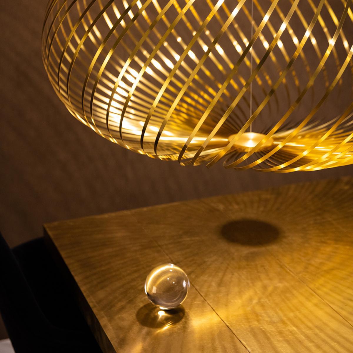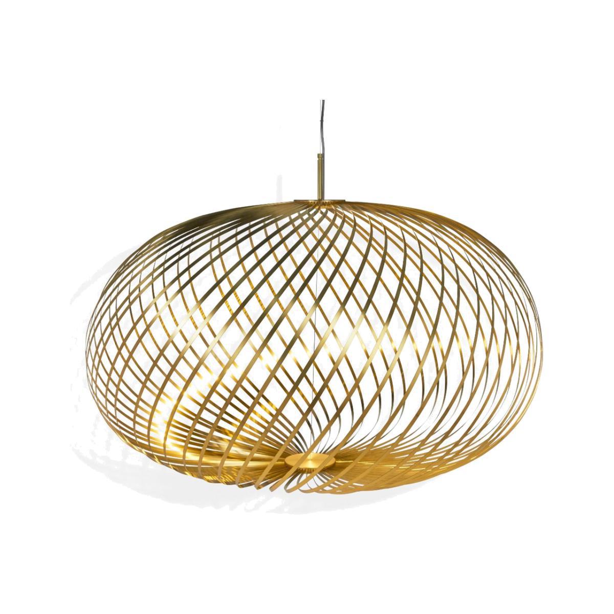Expertly crafted using 60 stainless steel strips, the large Spring Pendant by Tom Dixon is presented here in a contemporary brass finish. Its semi-transparent, flying saucer-like shape adds a creative touch to any space, from kitchens to living rooms, reflecting beautifully through the pliant ribbons of stainless steel. The voluminous nature of the pendant can also be adjusted to various silhouettes and conveniently compacted for stress-free transportation. Founded in 2002 by Tom Dixon, the eponymous brand specialises in the revival of the British furniture industry, working with beautiful raw materials and streamlined silhouettes to create contemporary pieces. Requires: 1x Max 60W bulb (included).