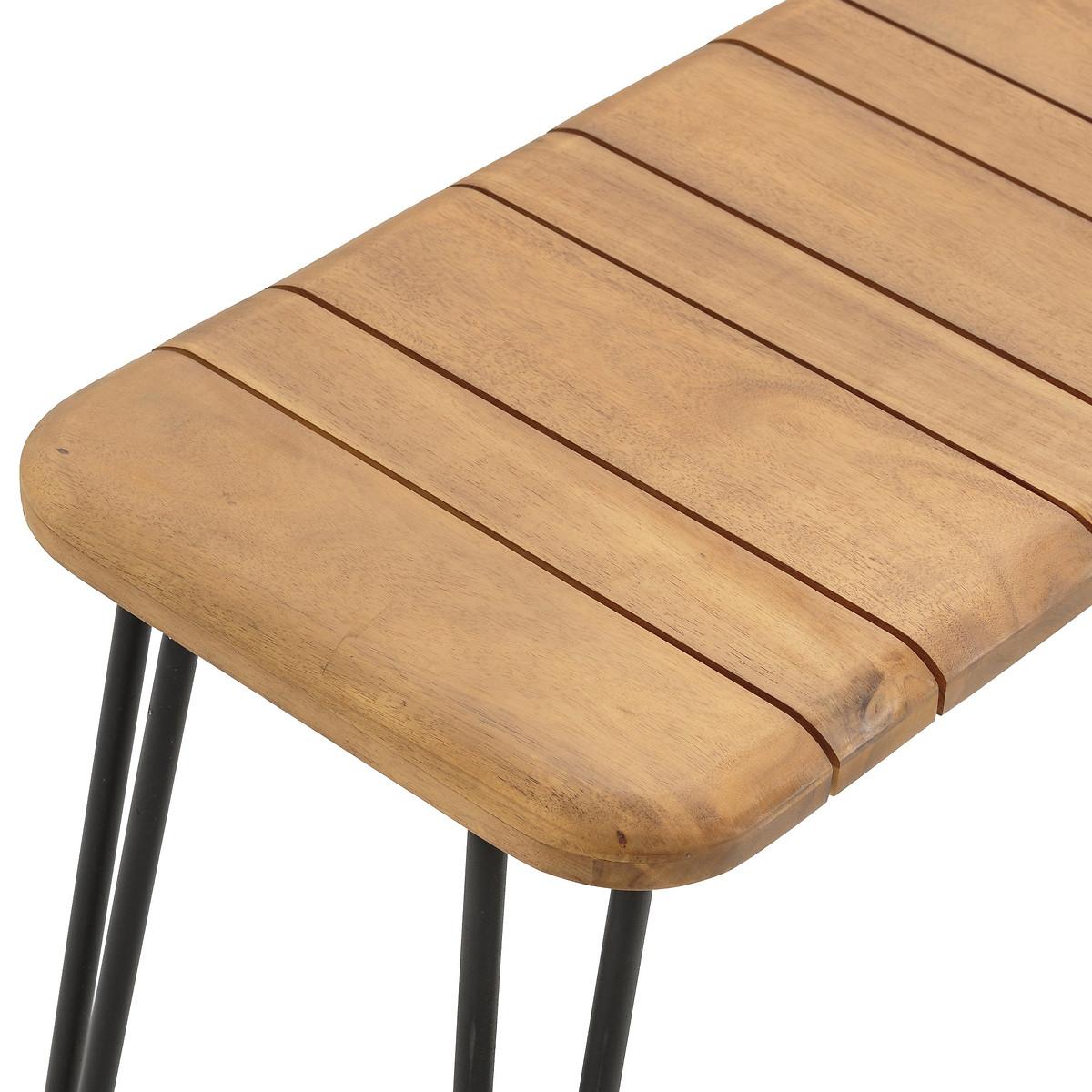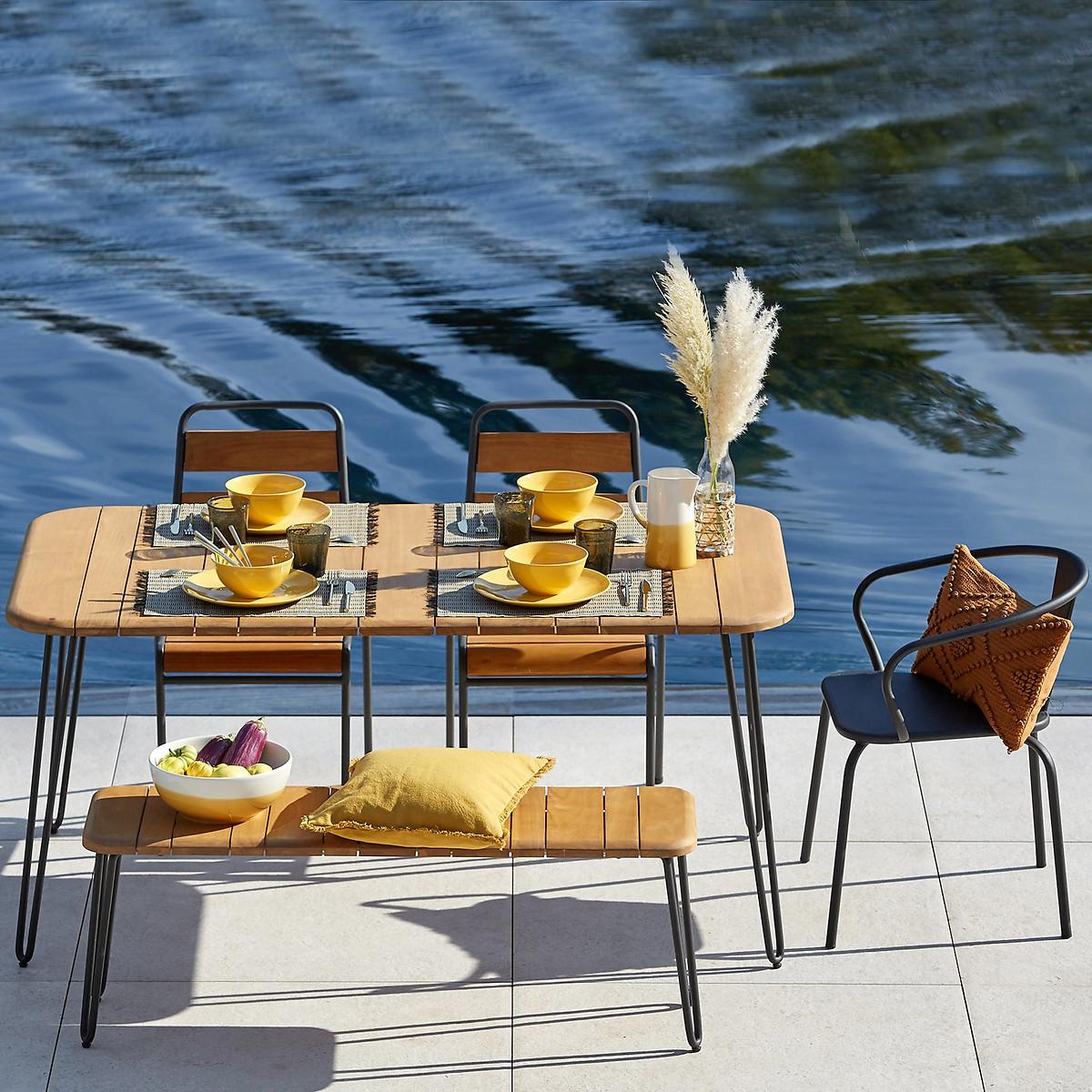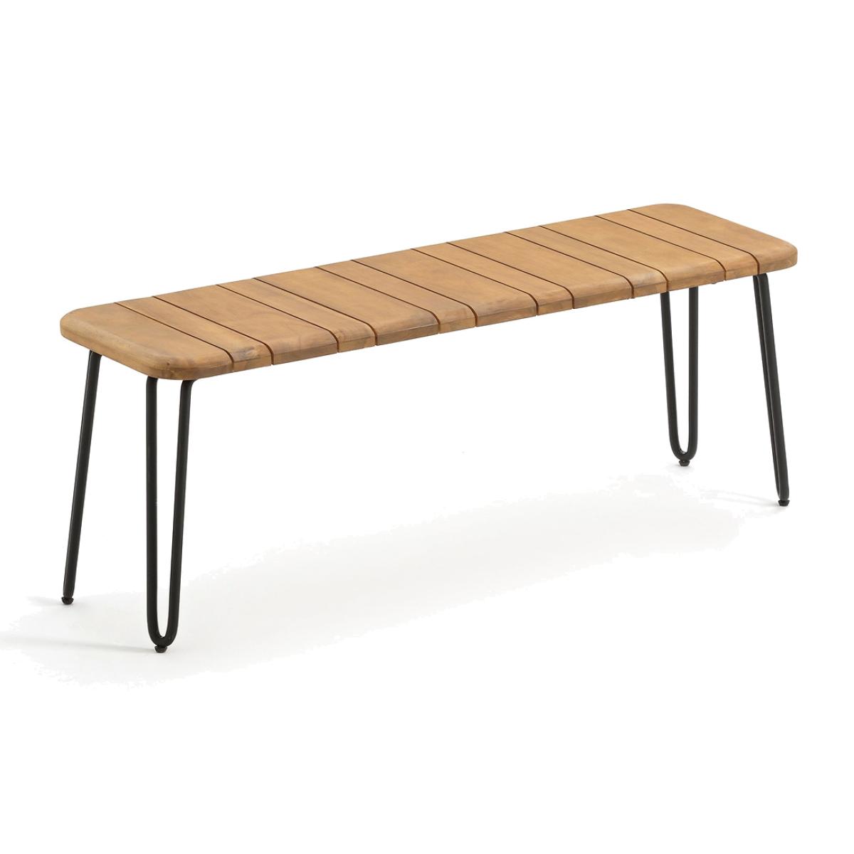 The Spritz garden bench has a space-saving folding base. Its slatted seat with rounded corners and its wired base give it a very modern vintage touch.!Product Details • Folding base with fixing system for the feet. • Acacia slatted seat, oiled finish, teak stained. FSC® certified wood • Wire folding base in black steel, epoxy finish. Quality:Acacia is a wood that offers good mechanical properties such as durability (good resistance to insects and fungi) and weather resistance (alternating dry and wet periods).Dimensions • Length: 120cm • Width 37cm • Height: 45cm • Seat thickness: 3cm/1"Delivery:This product will be delivered assembled (base to be unfolded), to your home by appointment. Note! Please check that all access points are large enough to accommodate your delivery (doors, stairs, lifts). • WOOD FROM SUSTAINABLY MANAGED FORESTS. FSC® certified wood comes from forests that are environmentally, socially and economically well managed. Parcel Dimensions:1 parcel • L128 x H21 x D43cm. • 18kg.