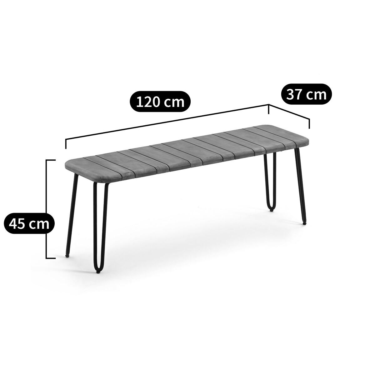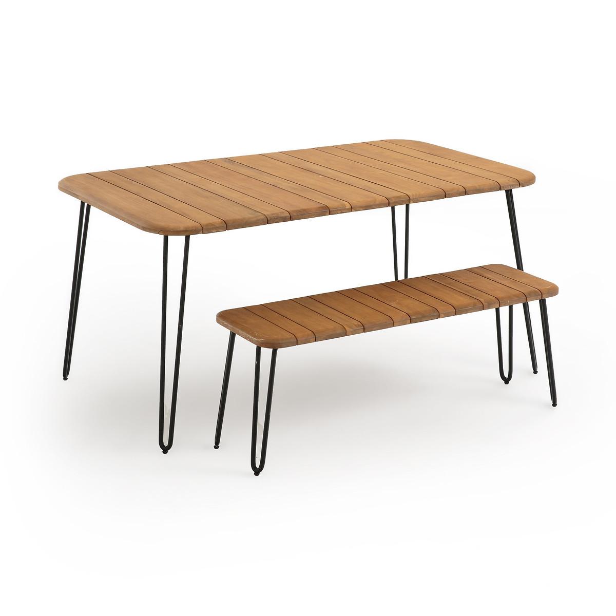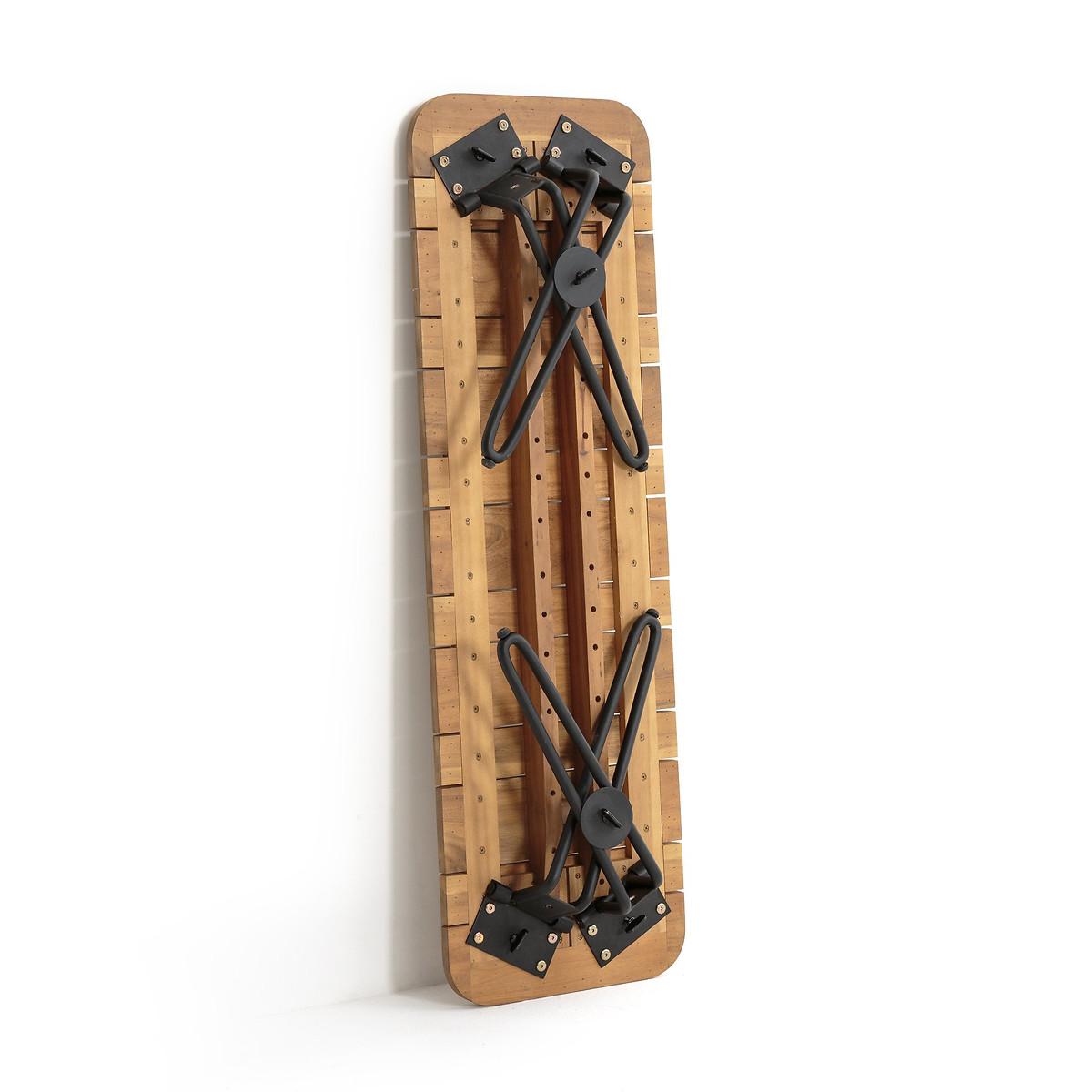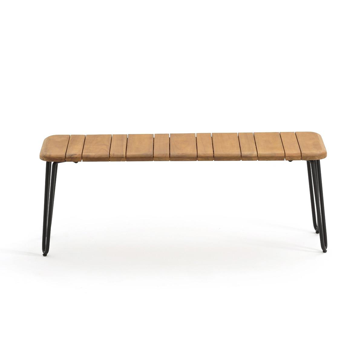The Spritz garden bench has a space-saving folding base. Its slatted seat with rounded corners and its wired base give it a very modern vintage touch.!Product Details • Folding base with fixing system for the feet. • Acacia slatted seat, oiled finish, teak stained. FSC® certified wood • Wire folding base in black steel, epoxy finish. Quality:Acacia is a wood that offers good mechanical properties such as durability (good resistance to insects and fungi) and weather resistance (alternating dry and wet periods).Dimensions • Length: 120cm • Width 37cm • Height: 45cm • Seat thickness: 3cm/1"Delivery:This product will be delivered assembled (base to be unfolded), to your home by appointment. Note! Please check that all access points are large enough to accommodate your delivery (doors, stairs, lifts). • WOOD FROM SUSTAINABLY MANAGED FORESTS. FSC® certified wood comes from forests that are environmentally, socially and economically well managed. Parcel Dimensions:1 parcel • L128 x H21 x D43cm. • 18kg.