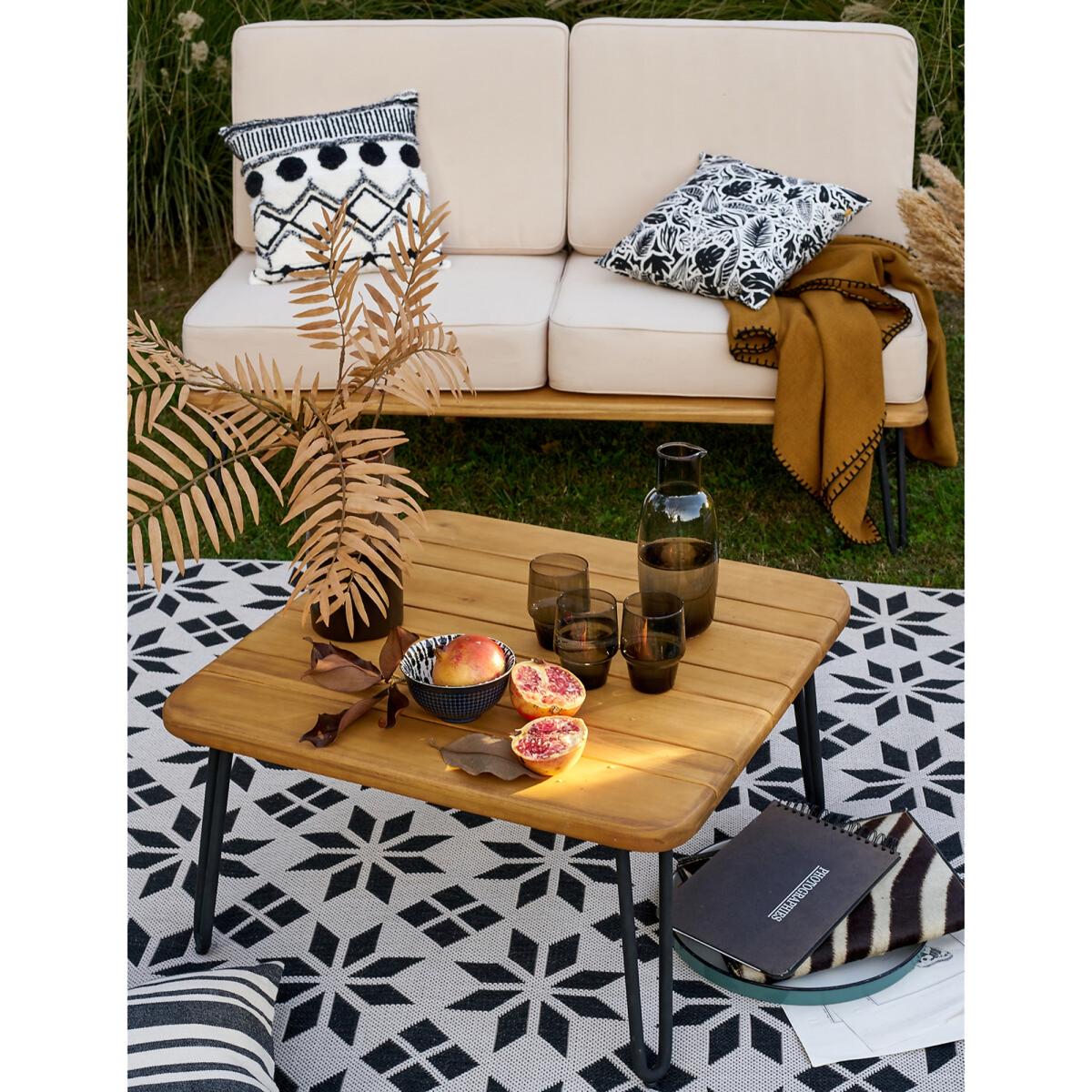 I love this little coffee table for its clean, minimalist aesthetic and versatile design. The natural Acacia wood top adds warmth, making it suitable for both modern and rustic garden spaces. It works particularly well in outdoor seating areas with rattan or metal furniture, where it can serve as a practical centrepiece or display surface. Practical styling tips include pairing it with cosy outdoor cushions or lanterns for an inviting look, and keeping accessories simple to highlight its natural grain. Its compact size makes it ideal for small patios or balcony gardens, providing functionality without overwhelming the space.