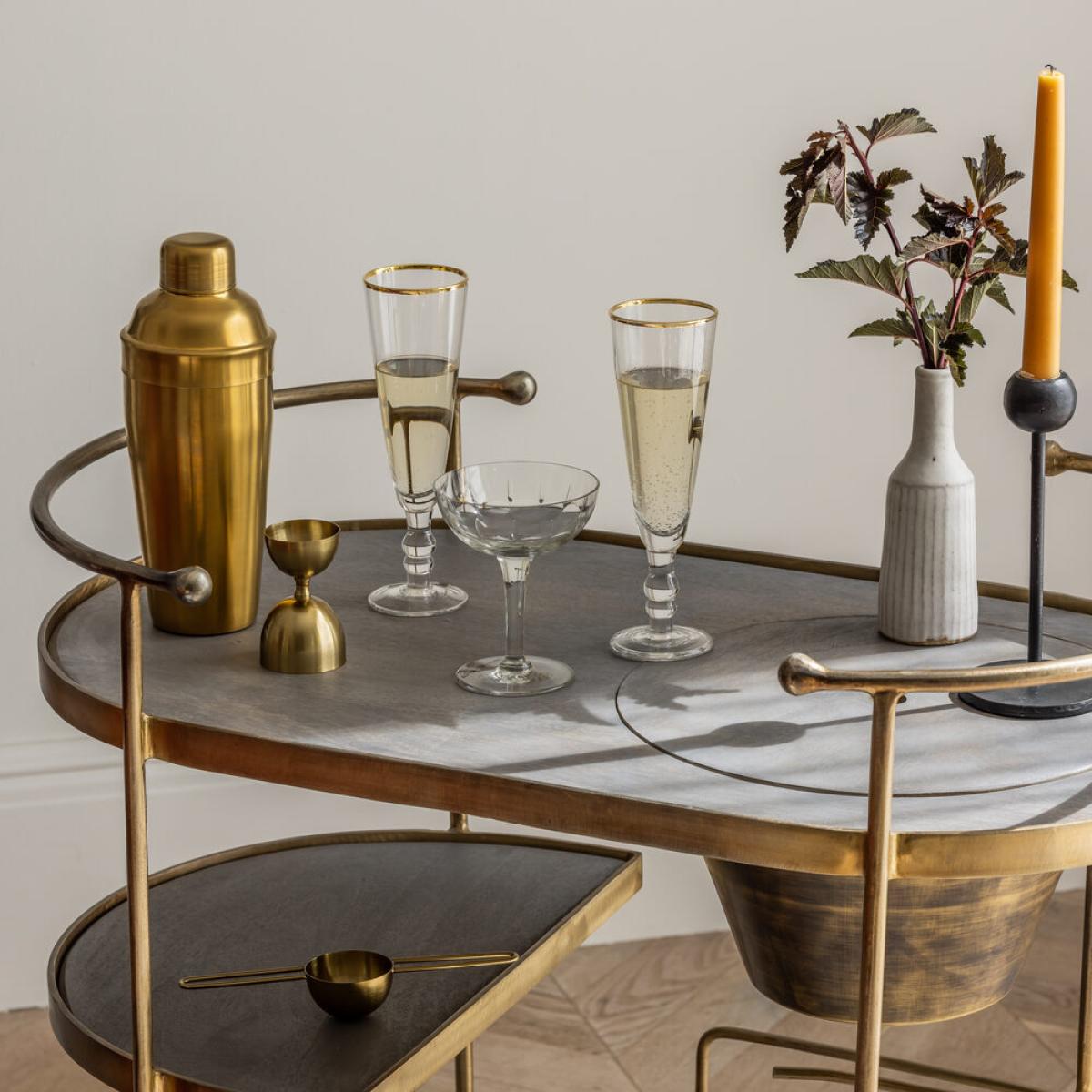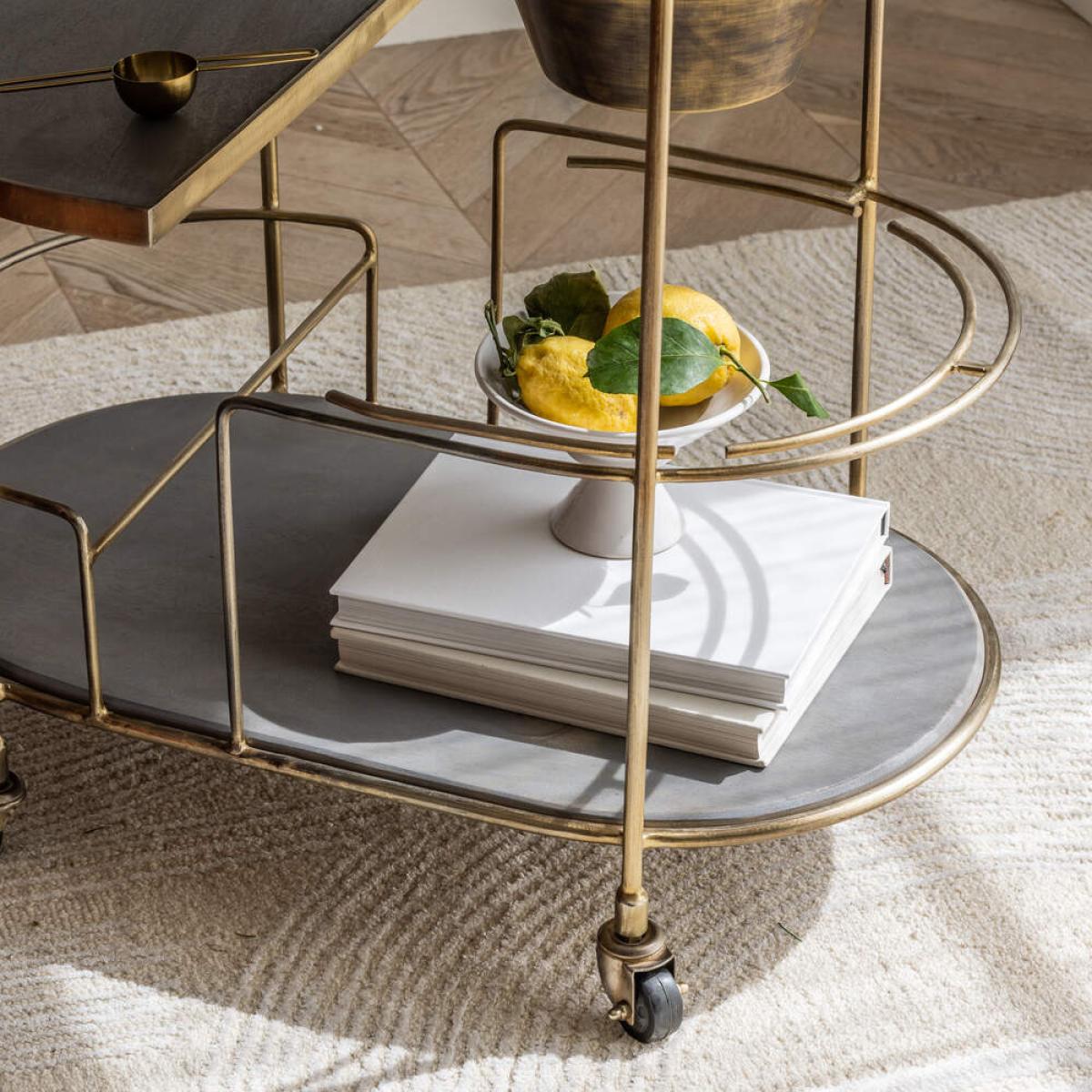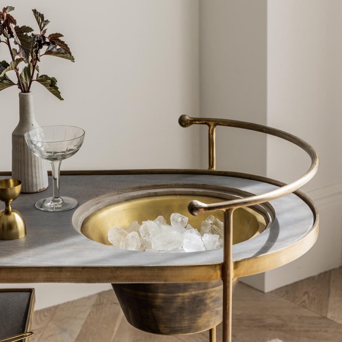 For anyone who loves to entertain, our Spritz Drinks Trolley with Ice Bucket is a practical and easy-to-use serving trolley oozing luxury and glamour. The cool grey wood and brass plated metal design has an art-deco look that fits effortlessly into a mid-century or industrial-style interior while the brass ice bucket makes it so easy to chill champagne, wine or your favourite tipple of choice. The trolley also comes on wheels, so it can be moved into different positions and different rooms when needed.