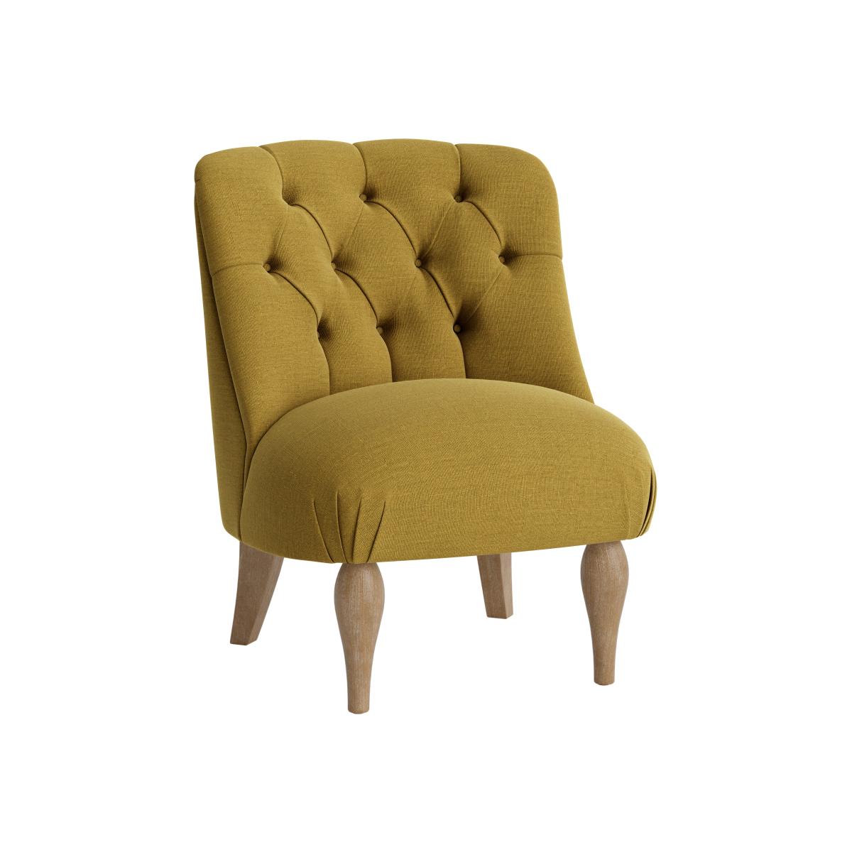 I love this little armchair because its compact design and cheerful colour make it a versatile addition to many interiors. It works particularly well in cosy corners, bedrooms, or as a statement piece in living rooms that need a pop of colour. Its tufted back adds a touch of traditional charm, while the light wooden legs keep it feeling fresh and modern. Styling tip: pair it with textured cushions or a small side table to create an inviting nook, or use it to add colour and personality to neutral spaces. Its size makes it practical for smaller rooms or as an accent piece without overwhelming the space.