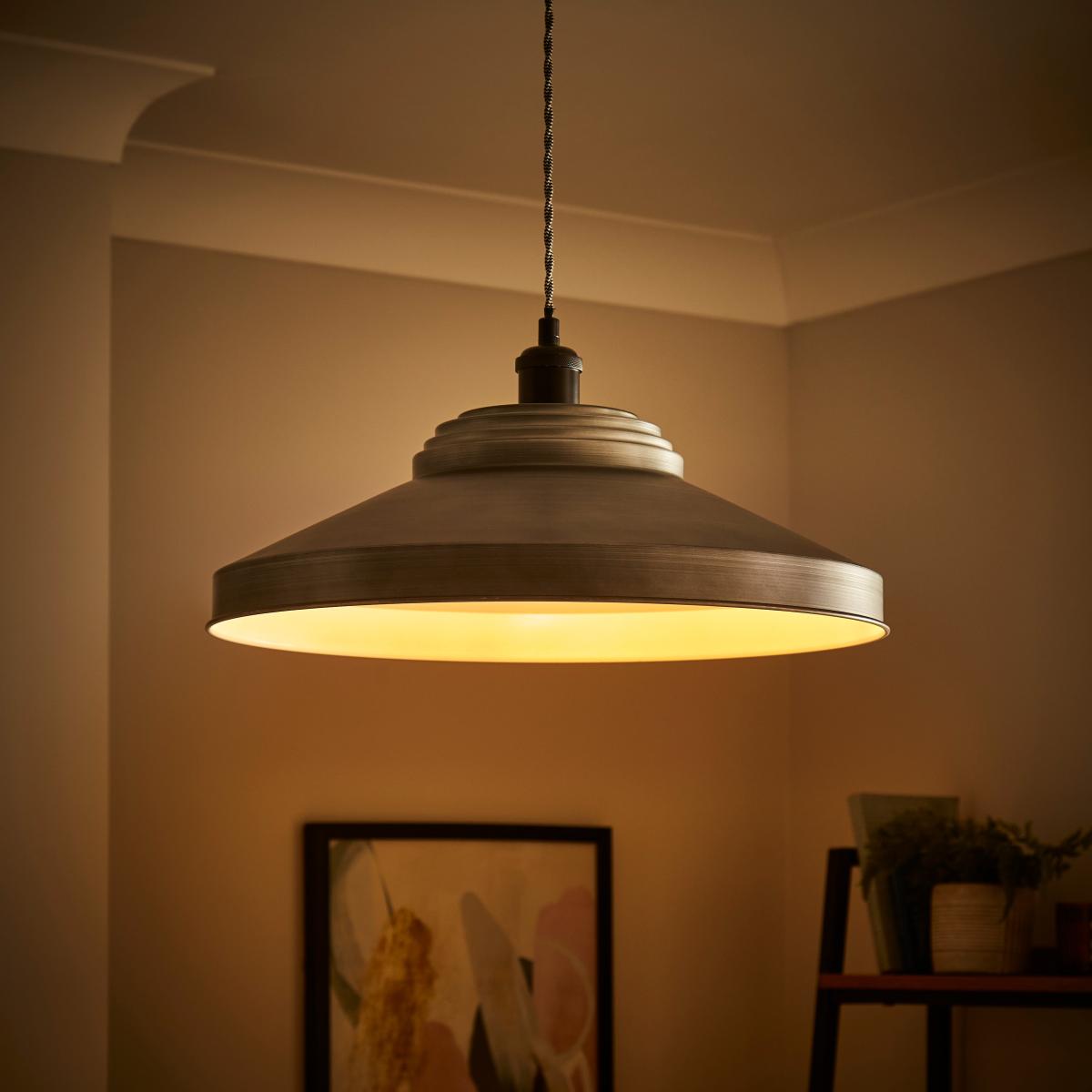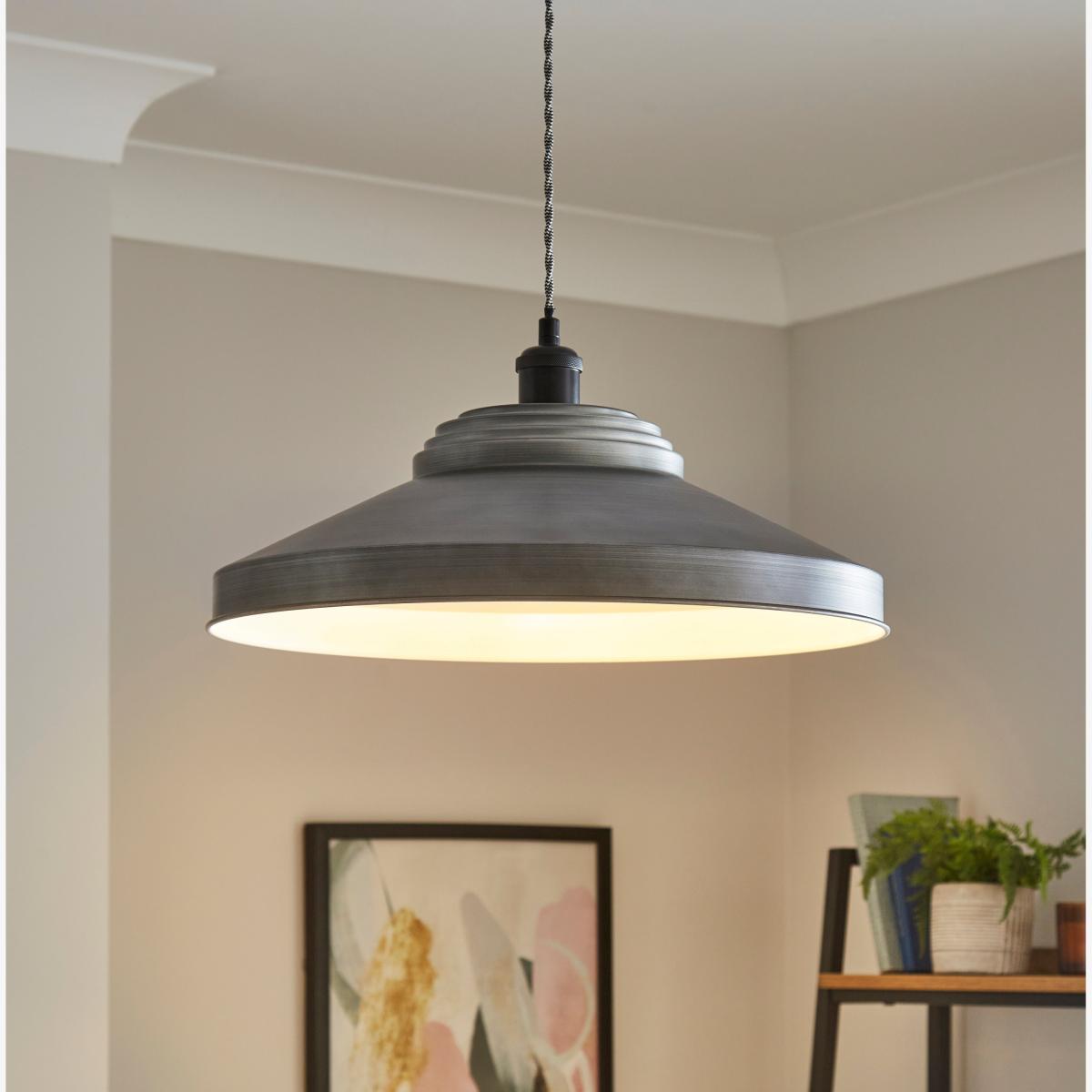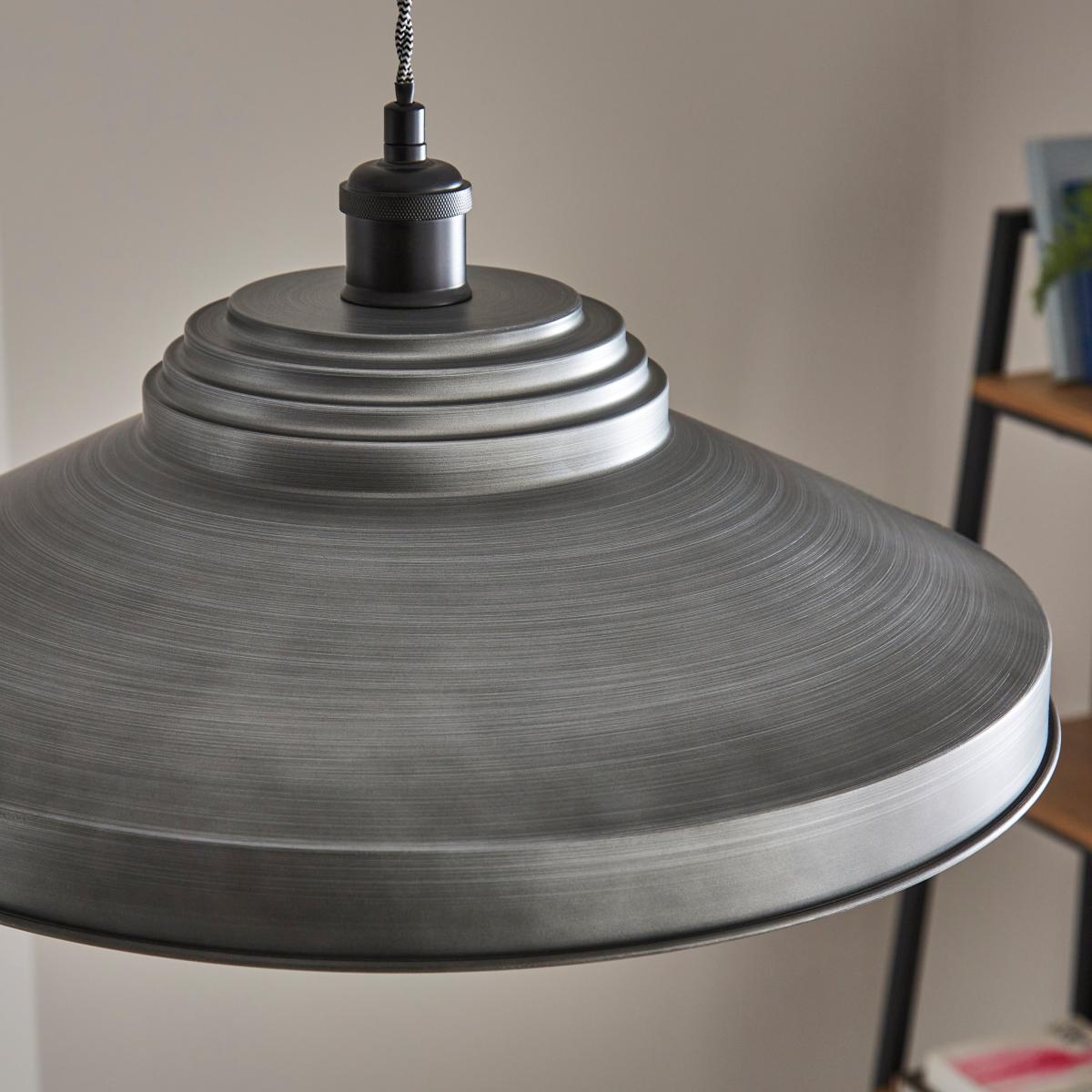 * Striking Industrial Shape* Brushed Pewter Finish* Multiple Sizes Available* Easy Fit - No Electrician Required! Illuminate your space with the Spun Metal Easy Fit Pendant. The striking industrial shape and brushed pewter finish create a bold aesthetic. Choose from multiple sizes and enjoy the ease of installation – no electrician needed!