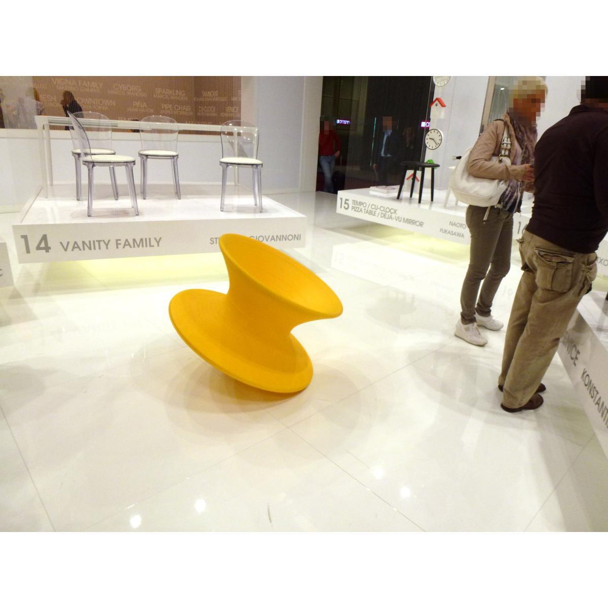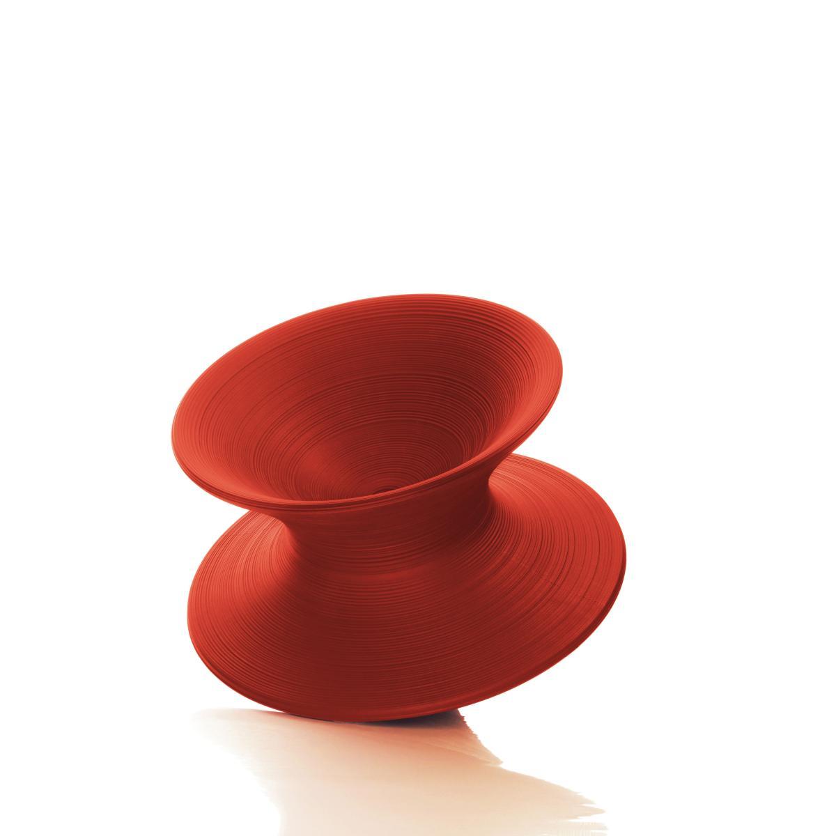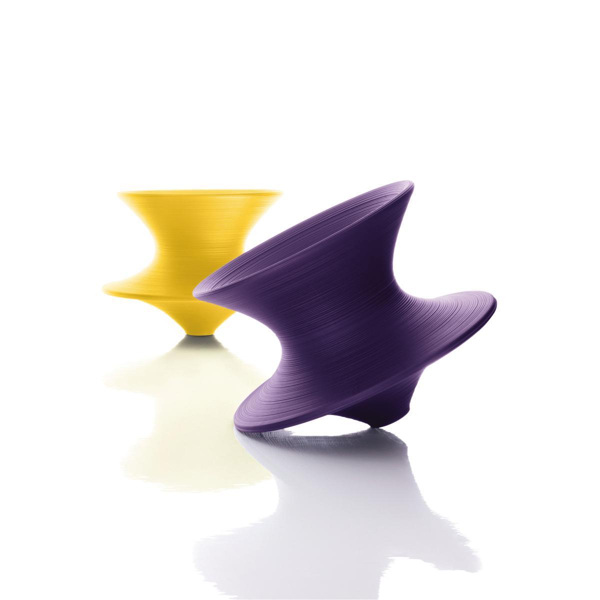 Thomas Heatherwick has produced a startling twist on conventional furniture design: a functional chair formed from a single profile rotated through 360 degrees. Aptly titled Spun, it transforms the domestic seat into a beautifully rendered spinning top. The appeal was to create a design using rotational symmetry while asking the simple question - could a functional chair be formed from a single profile rotated through 360 degrees. Spun displays Heatherwick's flair for challenging rules and teasingly plays with the notion of a static piece of sculpture becoming a playful piece of design. When upright Spun is a sculptural vessel and it is only when it is lent on its side that the playful possibilities of its form come to light, Spun allows the sitter to swivel in a circular rocking motion, including being able to rotate in a complete circle.