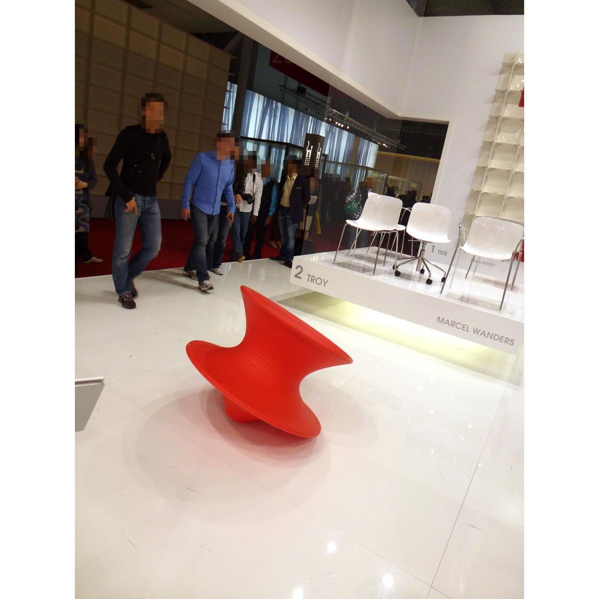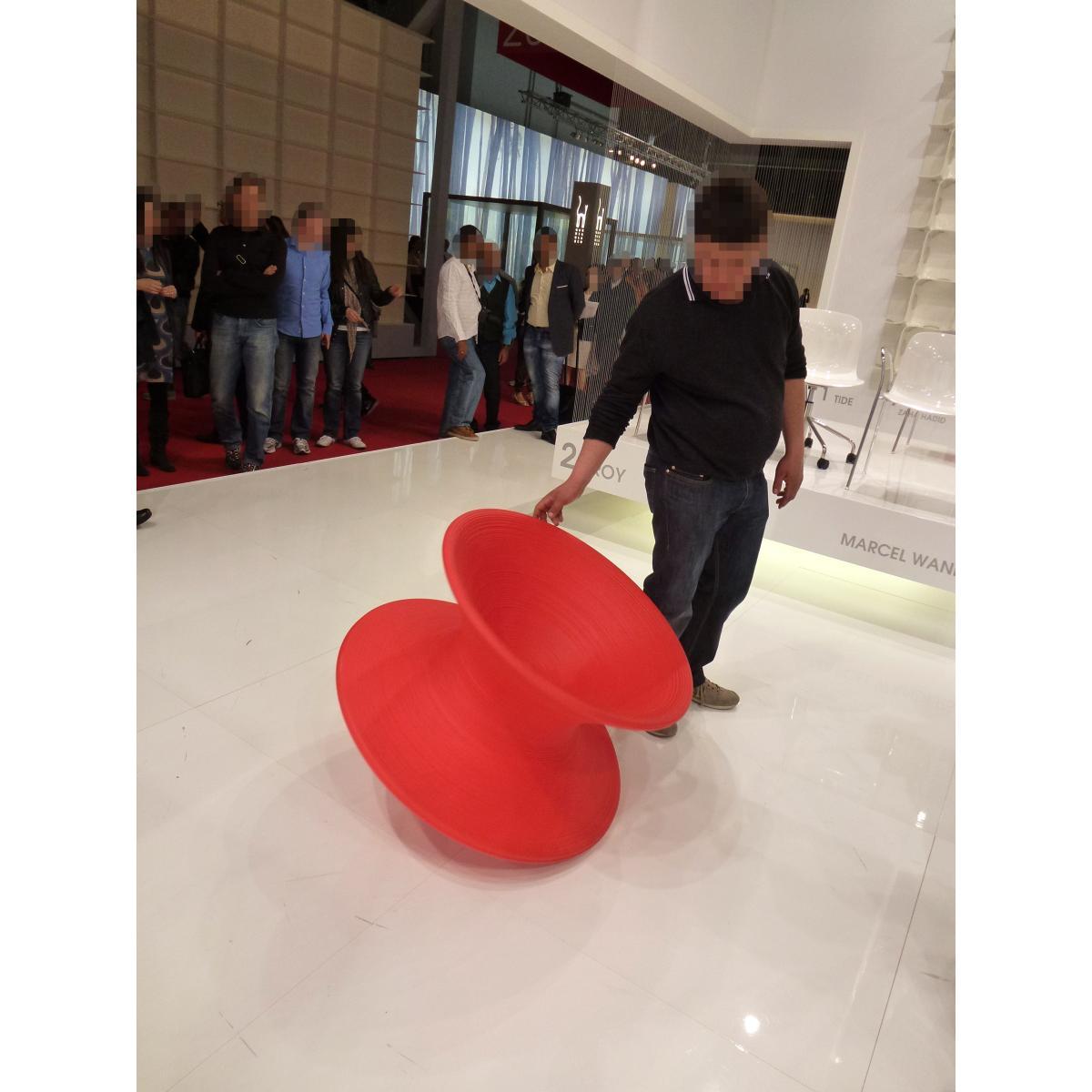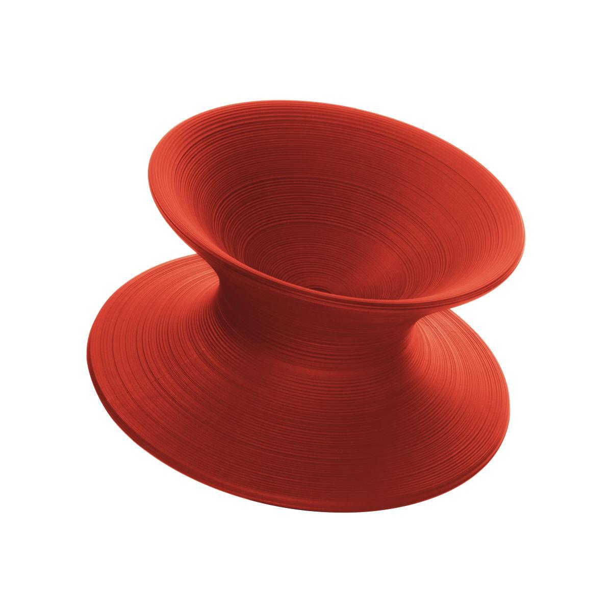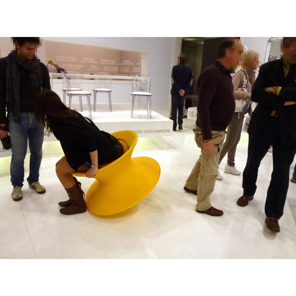Thomas Heatherwick has produced a startling twist on conventional furniture design: a functional chair formed from a single profile rotated through 360 degrees. Aptly titled Spun, it transforms the domestic seat into a beautifully rendered spinning top. The appeal was to create a design using rotational symmetry while asking the simple question - could a functional chair be formed from a single profile rotated through 360 degrees. Spun displays Heatherwick's flair for challenging rules and teasingly plays with the notion of a static piece of sculpture becoming a playful piece of design. When upright Spun is a sculptural vessel and it is only when it is lent on its side that the playful possibilities of its form come to light, Spun allows the sitter to swivel in a circular rocking motion, including being able to rotate in a complete circle.