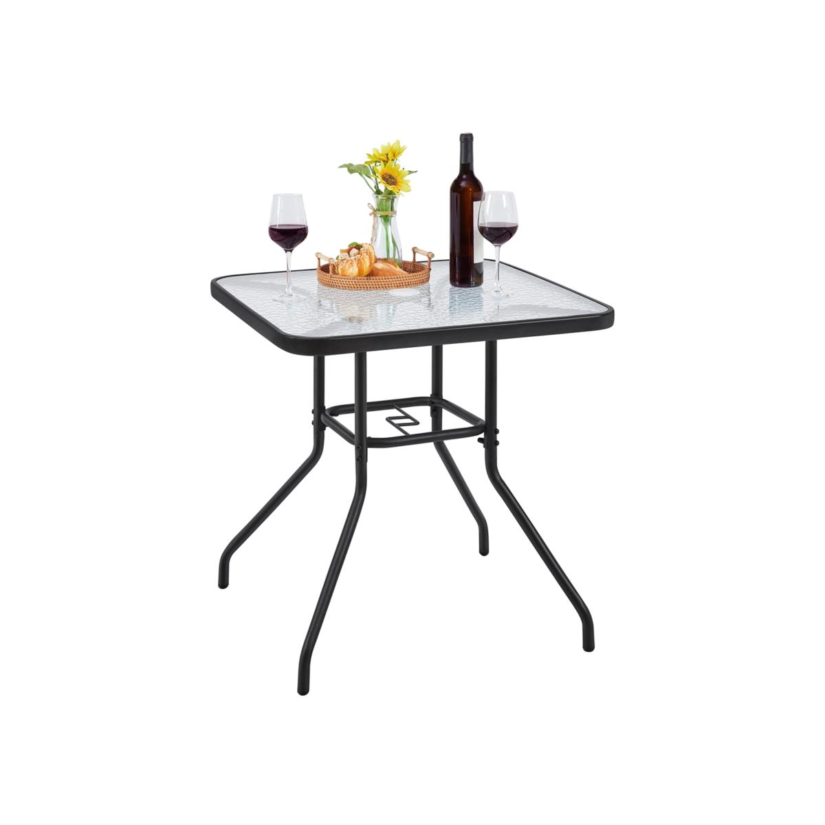 This square patio bistro table combines tempered glass with a matte metal frame for a simple yet elegant look. Designed for two to four people, it's ideal for afternoon tea, snacks, or casual brunches. The table features rounded edges and a central umbrella hole for easy shade. With strong materials and a three-layered structure for stability, it complements any outdoor space and requires minimal upkeep. Square Bistro Table Tempered Glass Top - White