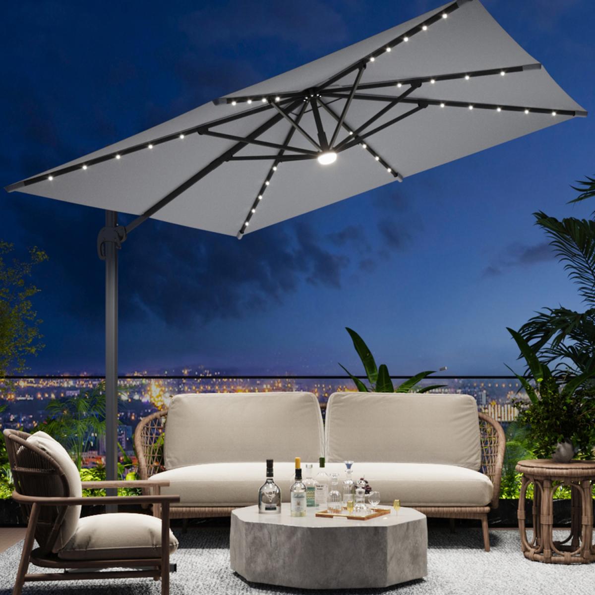Relax in style and comfort with the Garden Sanctuary Cantilever Parasol. Expertly crafted with a durable metal frame, this square parasol is ideal for providing shade on bright, sunny days. The weather-resistant polyester canopy is built to withstand the elements, making it perfect for year-round outdoor use. A smooth crank mechanism and adjustable handle allow you to easily set your preferred angle for shade. The 360-degree rotating base means you can change its direction effortlessly without moving the entire structure. Each rib is fitted with solar-powered LED light beads, bringing a warm and inviting glow to your evenings outdoors.