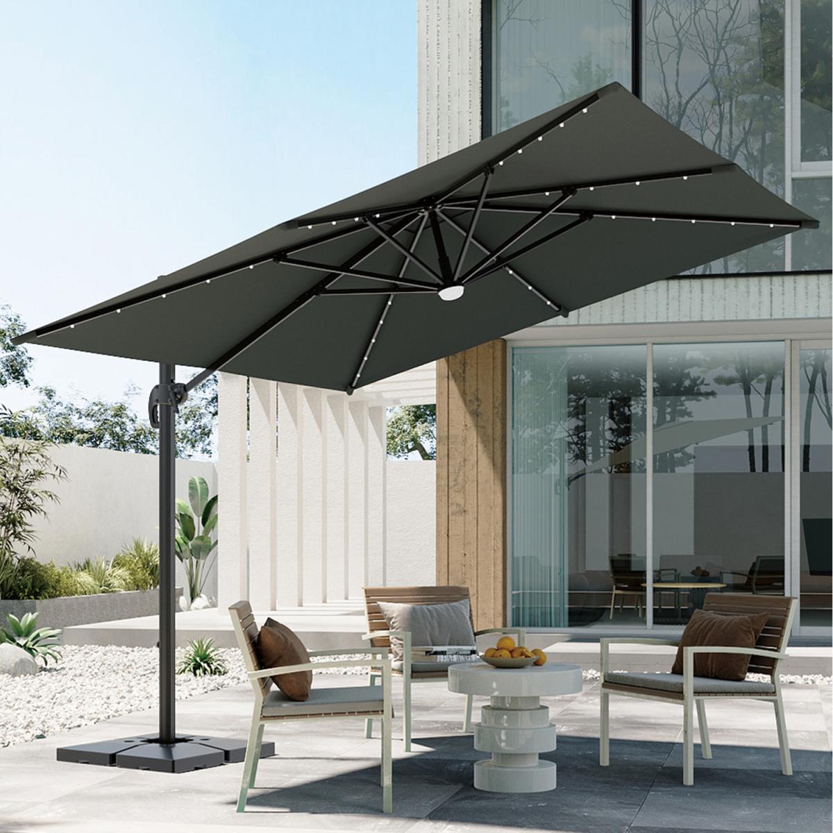 Stay protected from the sun and rain with this cantilever parasol. Built with a sturdy metal frame, this square parasol offers shade on hot, sunny days. Its weatherproof polyester canopy ensures it withstands various weather conditions, making it ideal for outdoor use. The easy-to-use crank mechanism and adjustable handle allow you to customise the angle of the shade effortlessly. With a 360-degree rotating base, you can adjust its direction without needing to move the entire parasol. You can choose from a range of fixed base options to ensure the parasol remains stable, tailored to your needs. Each rib is fitted with solar-powered LED lights, and together with the solar panel on top, this parasol provides illumination for your evenings. It's perfect for creating a comfortable atmosphere in outdoor seating areas, letting you enjoy quality time with ease.