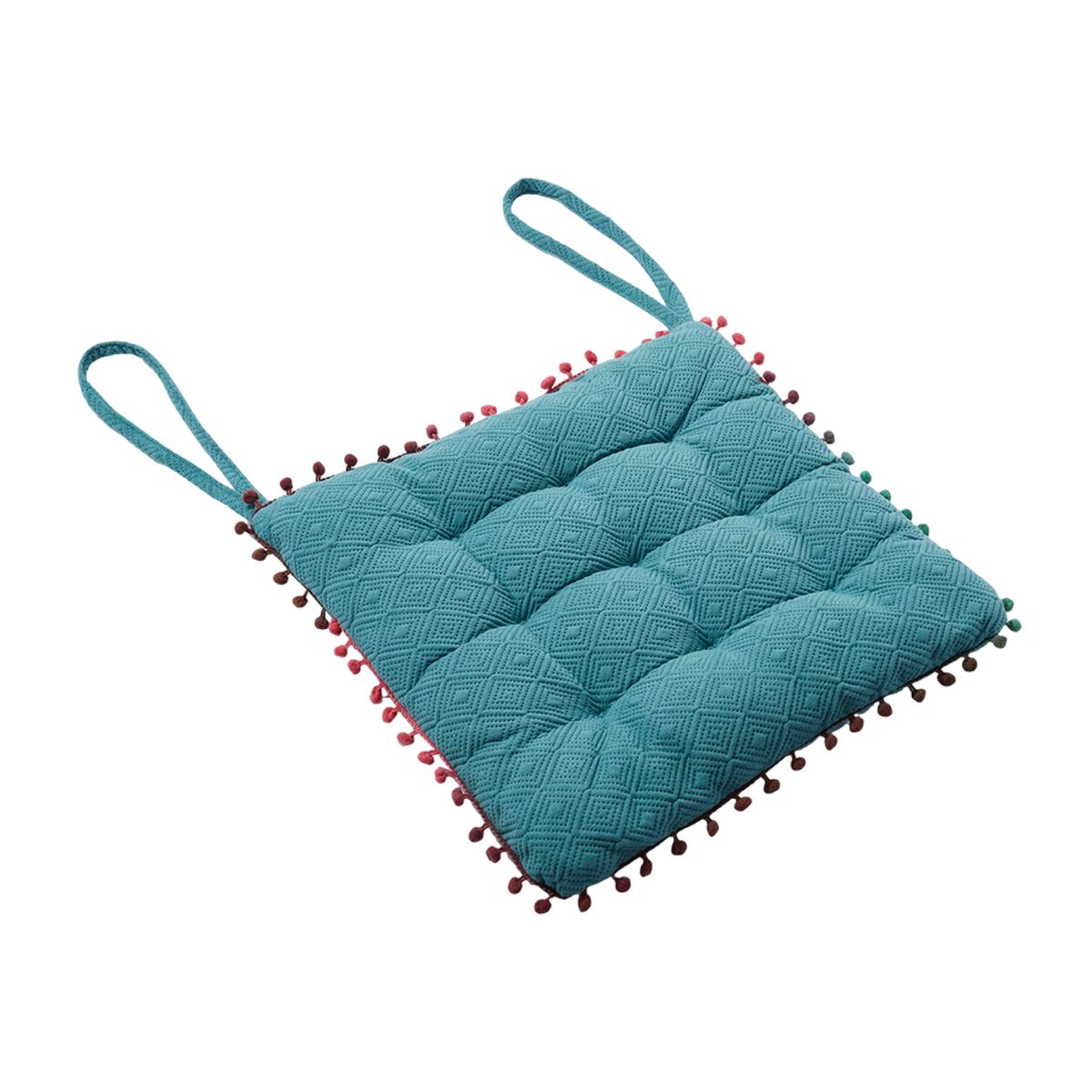 Instantly revitalise your dining chairs with this charming seat cushion. Featuring a simple solid colour design, this cushion combines playful details with practicality. Subtle texturing across the vintage-inspired surface adds visual interest and a pleasing tactile quality. Surrounding the edges are vibrant pom-poms, infusing a lively atmosphere that instantly breathes new life into ordinary chairs. Perfect for family gatherings or casual dining, this cushion transforms any meal into a joyful occasion.
