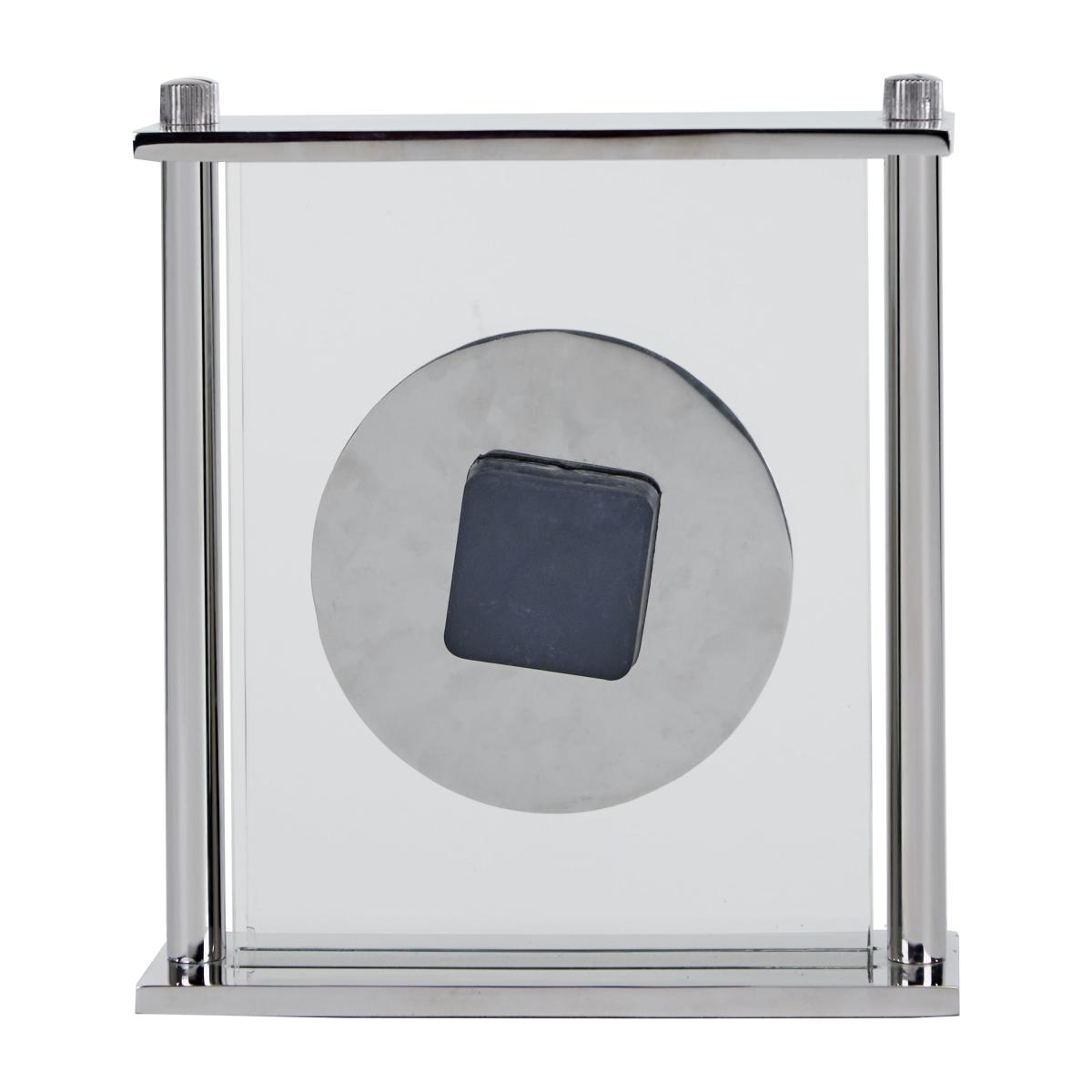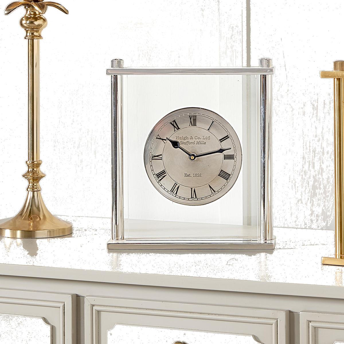 * Square framed mantel clock* Ideal desk accessory* Transparent design* Roman numeral figures* Classic styled hands* Silent movement* Requires 1 x AA battery (not included)* Available in a nickel or gold colour option Enhance your mantelpiece, desk or sideboard with this eye-catching and functional time keeping solution. Balancing functionality and decoration for a truly impressive piece, this table clock features a free-standing design, classic styled hands and roman numeral figures, for an exceptional design with transparent elements to bring clarity and elegance.