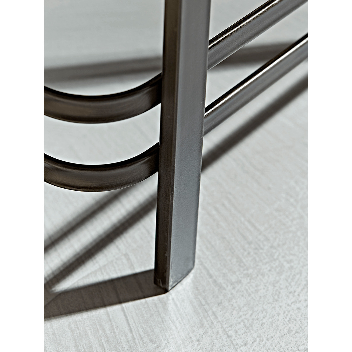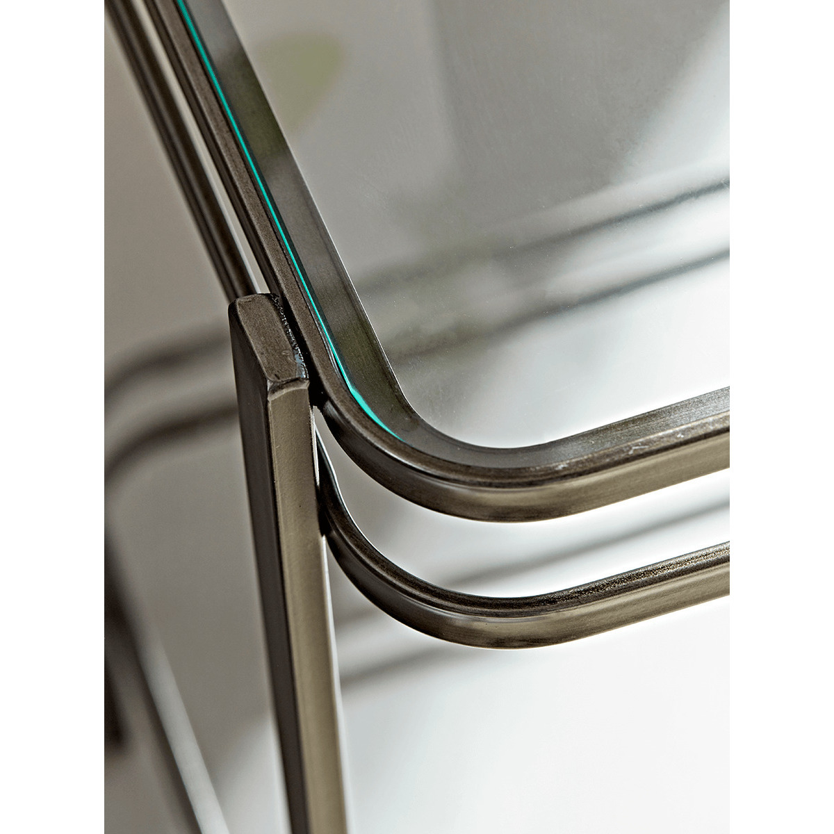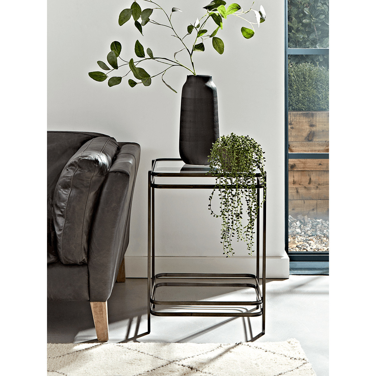 Simple and elegant, with a dark steel frame and single glass panel to the top, our industrial style side table will add minimal style to your space. Each piece features light distressing to the frame for a touch of factory chic.