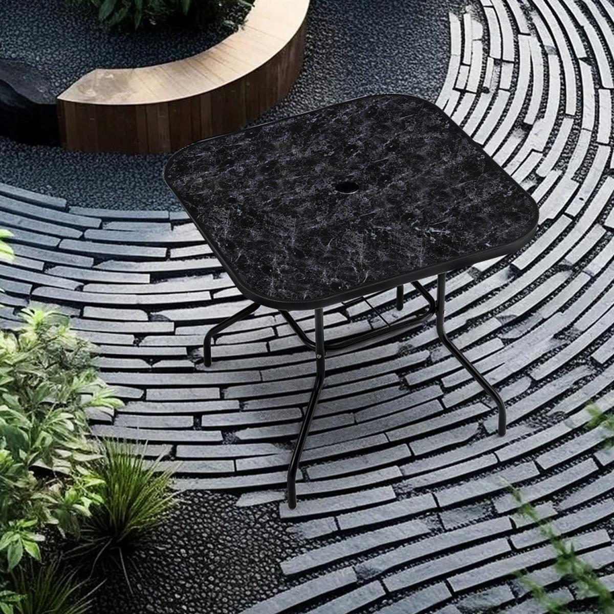 Elevate your moments with Livingandhome's Square Marble Tempered Glass Garden Table. Enjoy refreshing mornings or evenings at this marble coffee table, crafted from heat-resistant, explosion-proof tempered glass. The realistic marble texture adds sophistication, blending style with minimalism. The built-in parasol hole provides sun and wind protection for undisturbed outdoor enjoyment. Choose from various sizes to suit your space, and indulge in the sleek design featuring a tempered glass tabletop for easy maintenance, rounded corners for safety, and a rust-proof, durable black metal base for long-lasting use