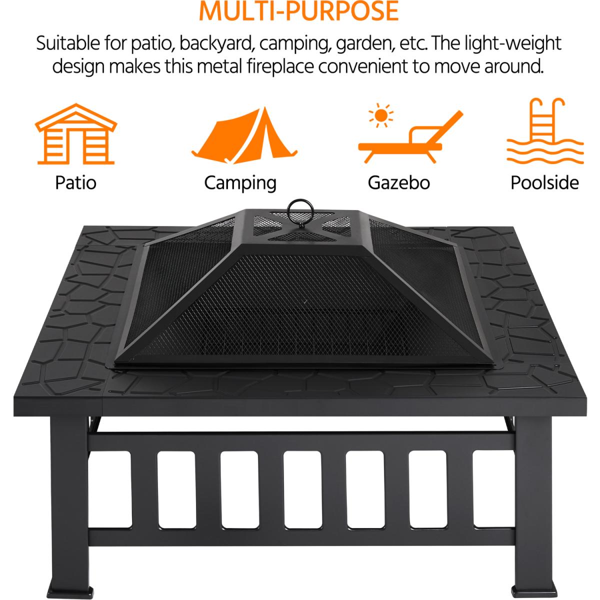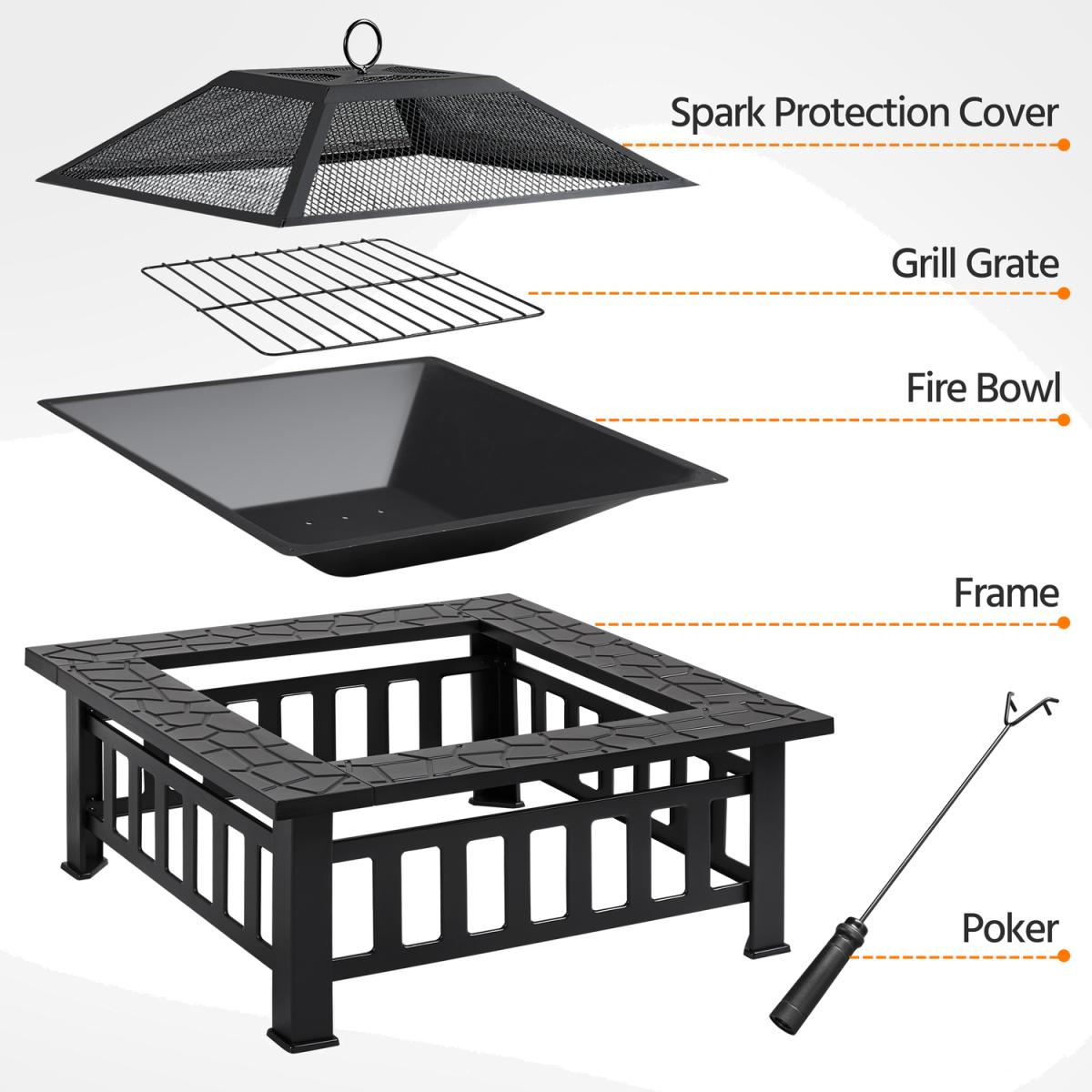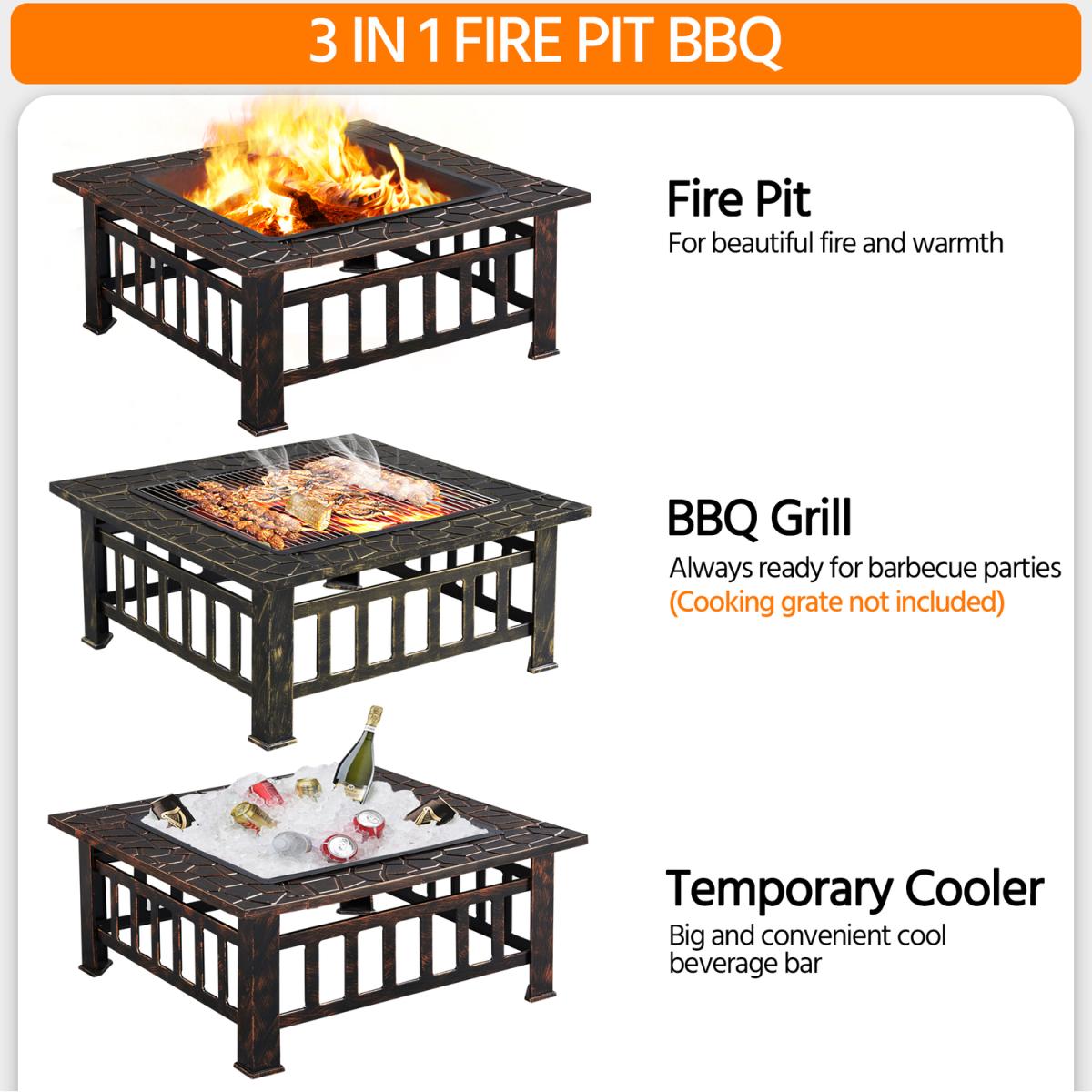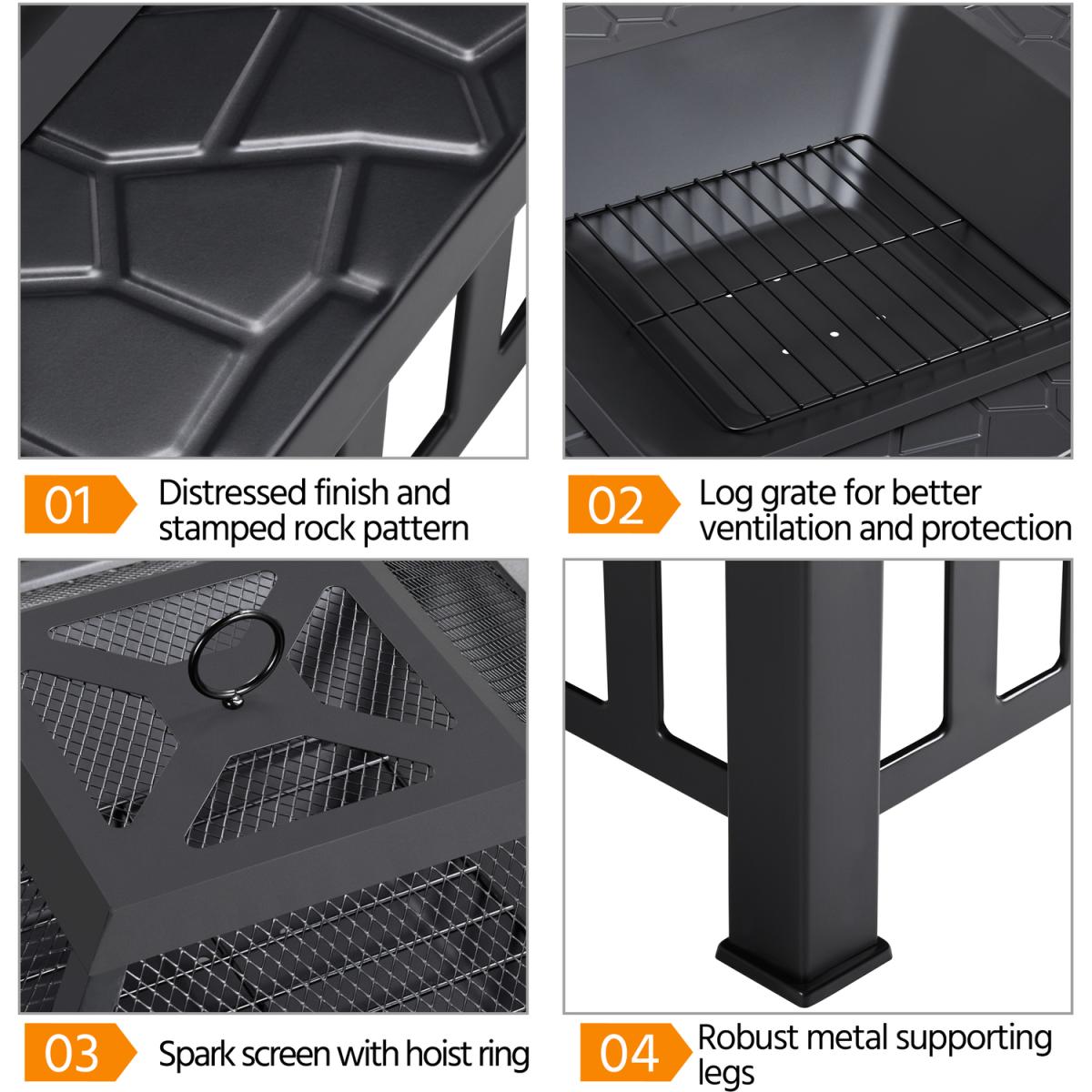 This practical piece serves perfectly as an aesthetic fire pit, a barbecue grill topped with a cooking grate(not included), or a temporary outdoor ice bucket for cooling drinks. H and the elements. A wide and deep fire bowl accommodates more logs and the 6 ventilation holes at the bottom increase airflow. For your safety, this fire pit has a spark screen and a poker to help you control fire and move the lid from a safe distance. Easy assembly is required.