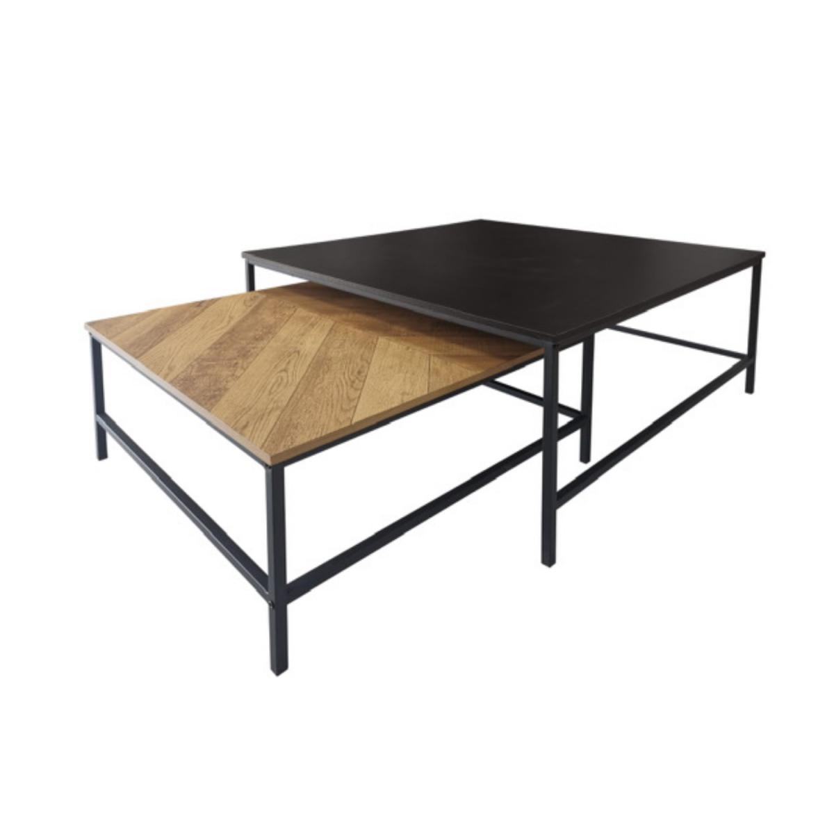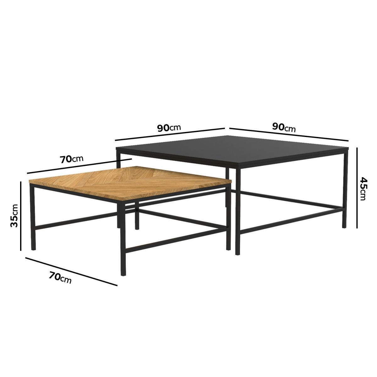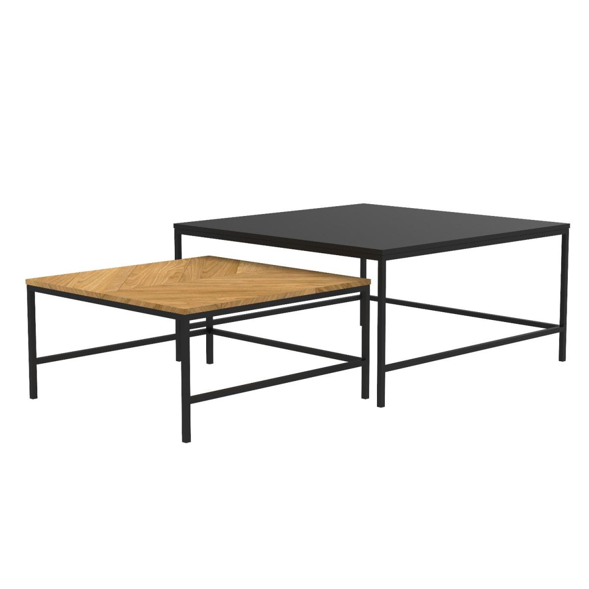 Features we love Set of two modern coffee tables in contrasting colours. Includes one all black table and one oak-effect table. Oak-effect table is finished with chevron detailing. Nesting coffee tables are both sleek and functional. Black powder-coated metal frame completes the look. Matching items are available in the Telsa range Need to know. Large table dimensions. W90 x D90 x H45 cm Small table dimensions. W70 x D70 x H35 cm Weight. 17kg Number of tables. 2 Colour. Natural oak and black Material. Oak paper foil MDF and metal Finish. Paper foil top and powder-coated legs Assembly required. Yes.