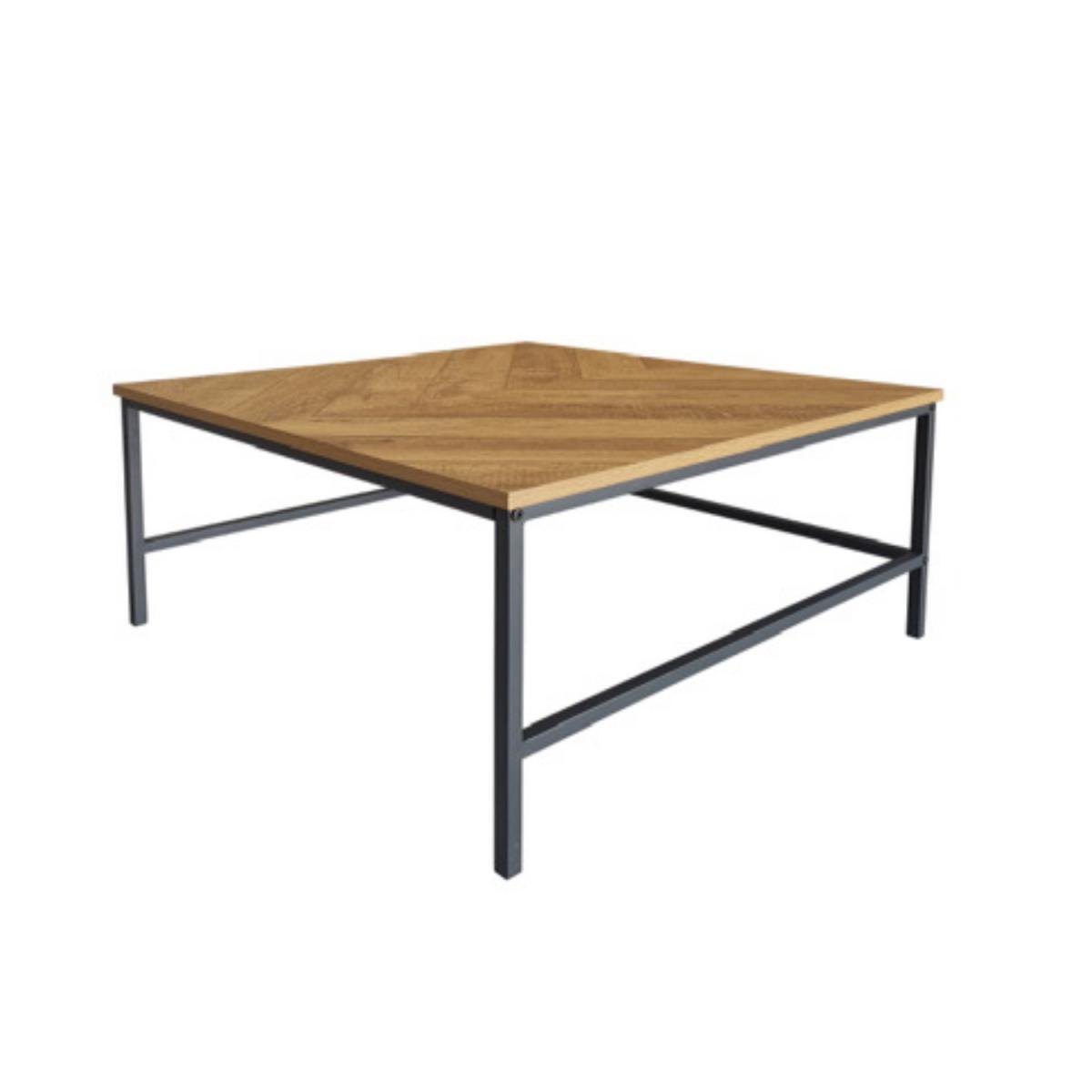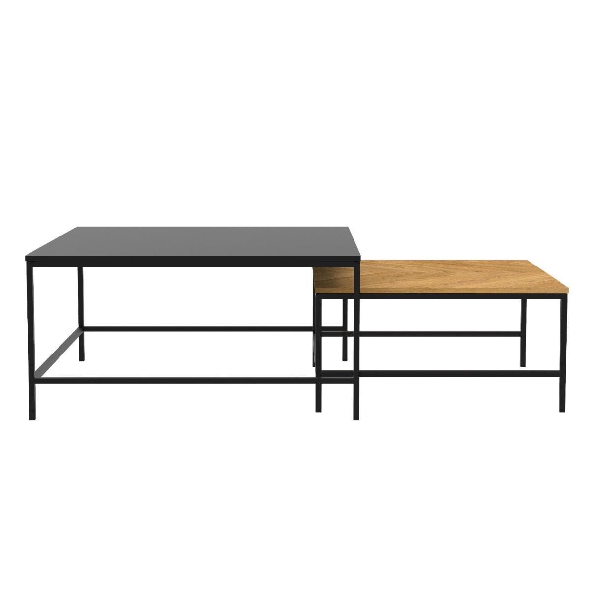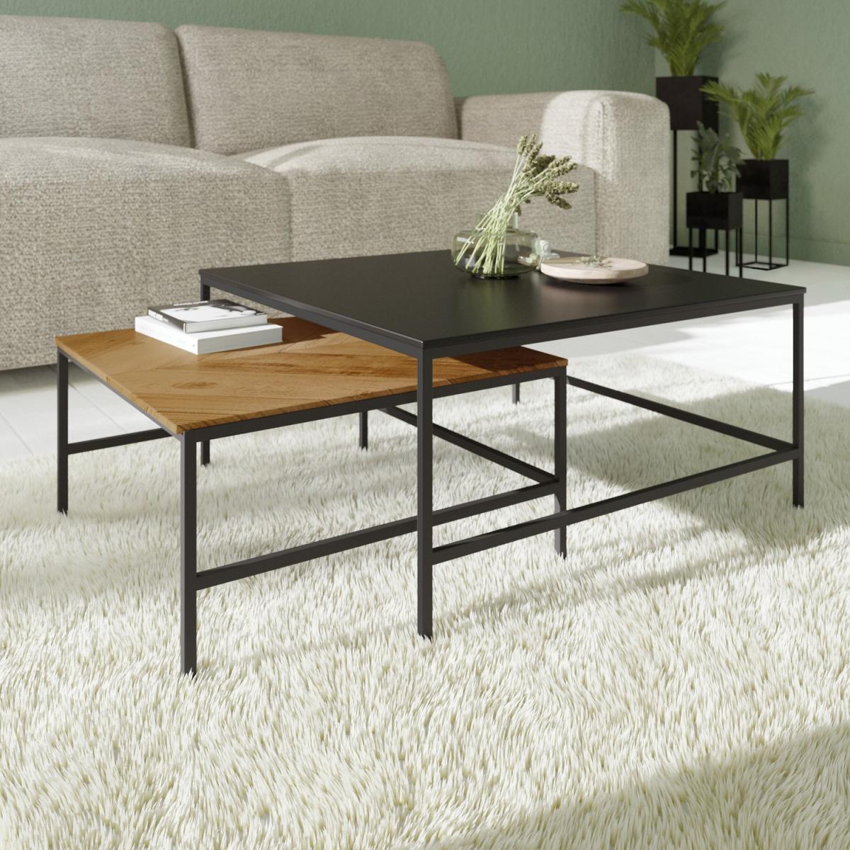 Features we love Set of two modern coffee tables in contrasting colours. Includes one all black table and one oak-effect table. Oak-effect table is finished with chevron detailing. Nesting coffee tables are both sleek and functional. Black powder-coated metal frame completes the look. Matching items are available in the Telsa range Need to know. Large table dimensions. W90 x D90 x H45 cm Small table dimensions. W70 x D70 x H35 cm Weight. 17kg Number of tables. 2 Colour. Natural oak and black Material. Oak paper foil MDF and metal Finish. Paper foil top and powder-coated legs Assembly required. Yes.