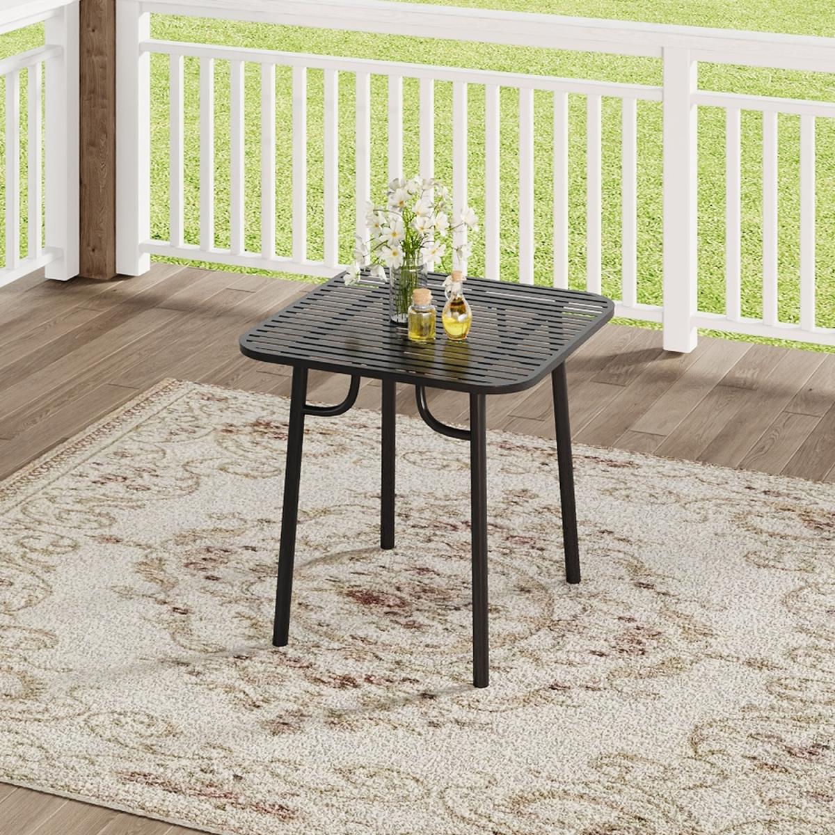 Ideal for compact patios and contemporary gardens, this Komore Outdoor Garden Metal Table is perfect for enjoying a relaxed afternoon or evening. Constructed from high-quality metal with a rust and corrosion-resistant powder coating, it is built to withstand the elements while retaining its appeal. The modern slatted tabletop, supported by four sturdy legs, allows rainwater to drain easily and seats up to four people comfortably. Lightweight and easy to reposition, it is a great option for outdoor gatherings and casual dining.