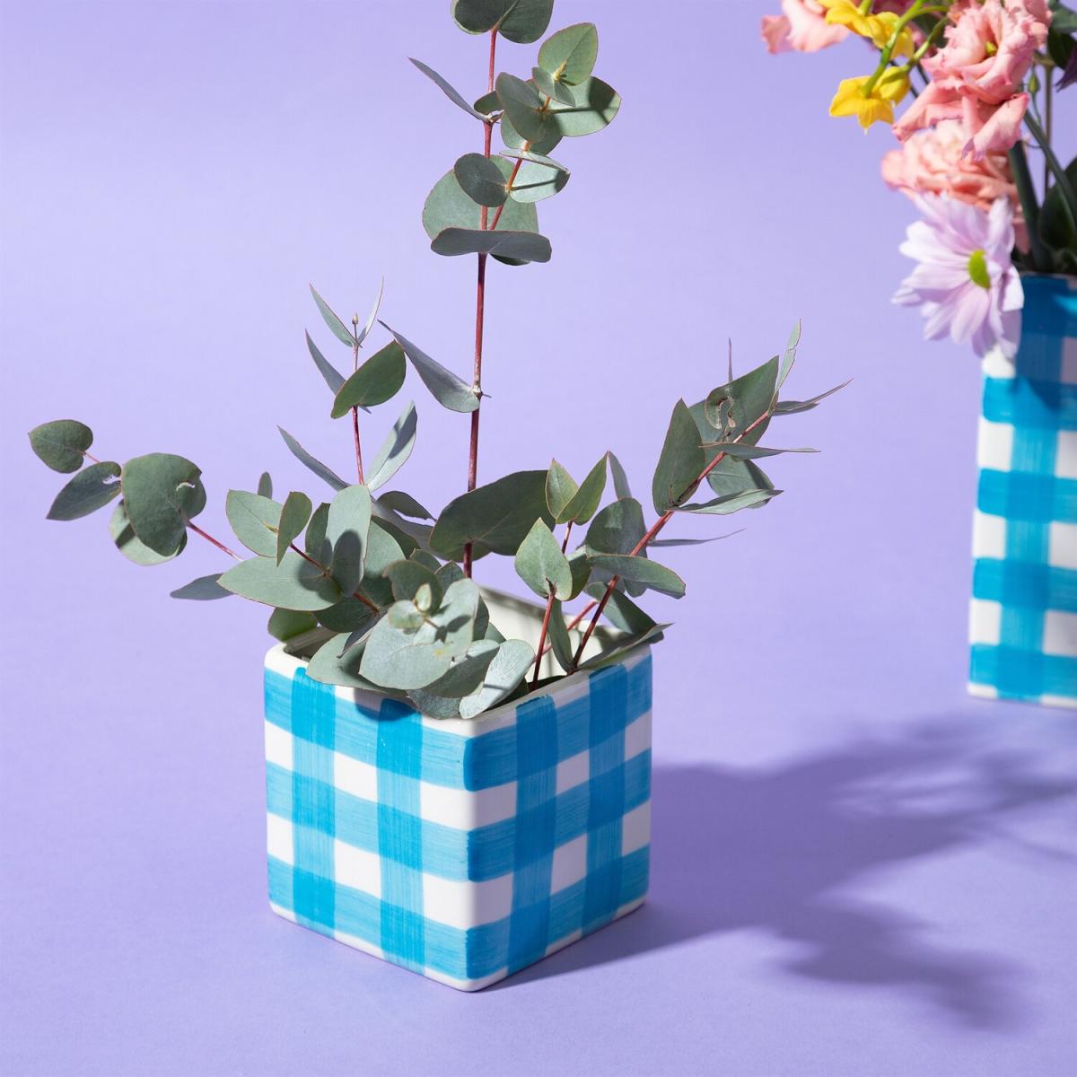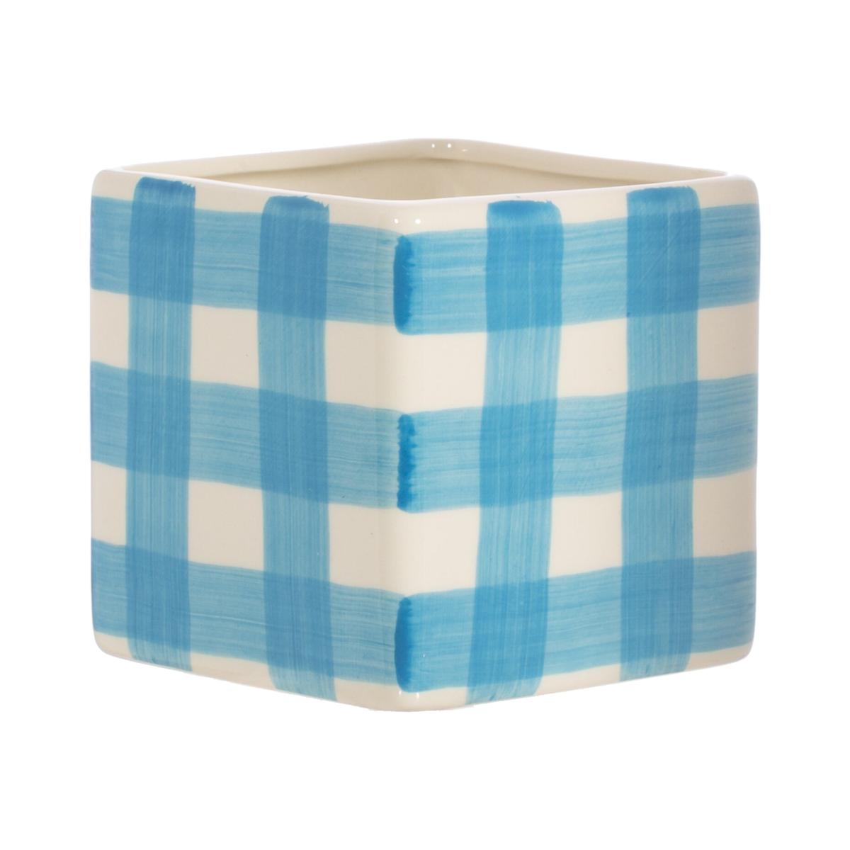 This square plant pot is perfect to house small indoor plants. Made from stoneware. Each pot has a bright checked pattern. Use anywhere in the home as a table centrepiece, windowsill or on a side table.