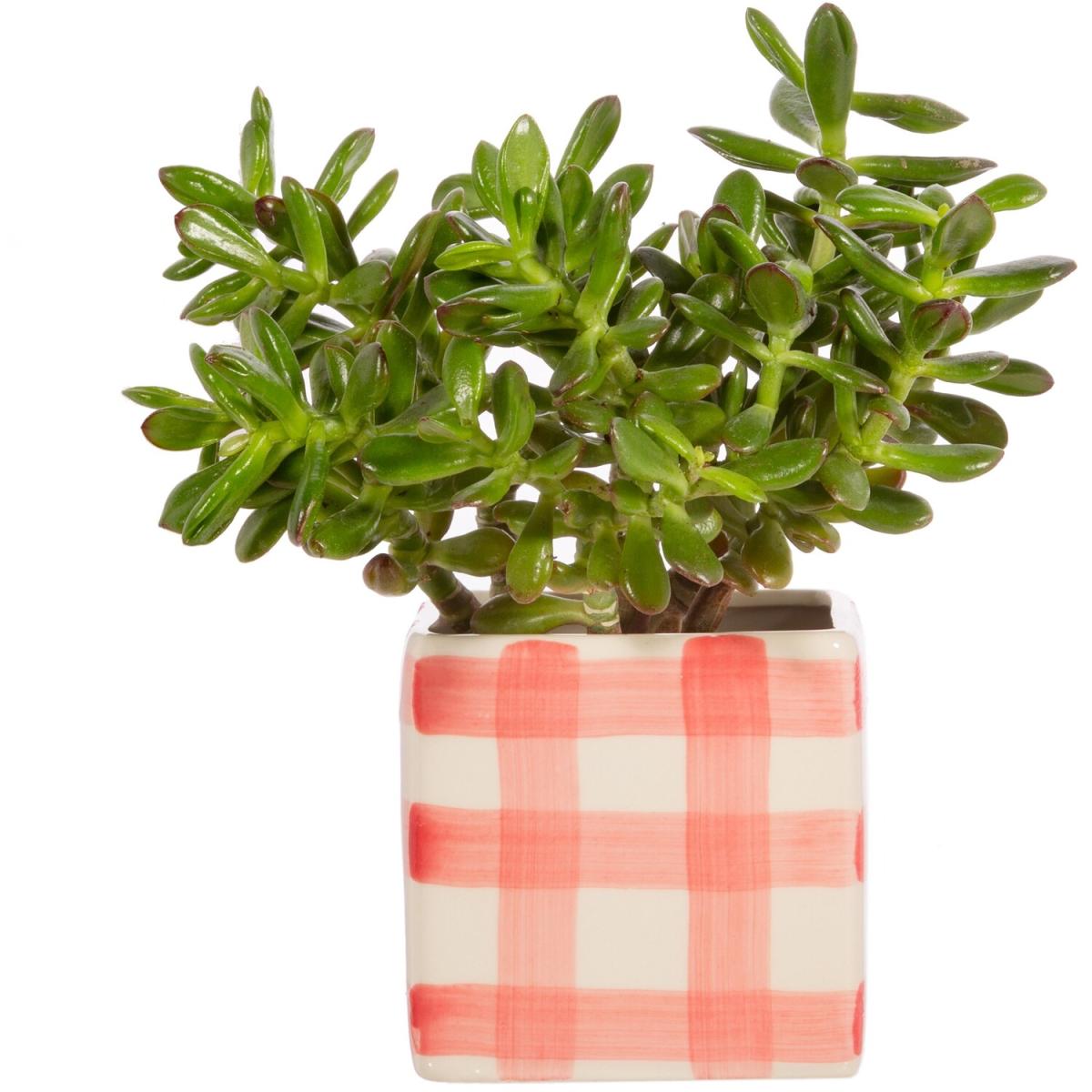 This square plant pot is perfect to house small indoor plants. Made from stoneware. Each pot has a bright checked pattern. Use anywhere in the home as a table centrepiece, windowsill or on a side table.