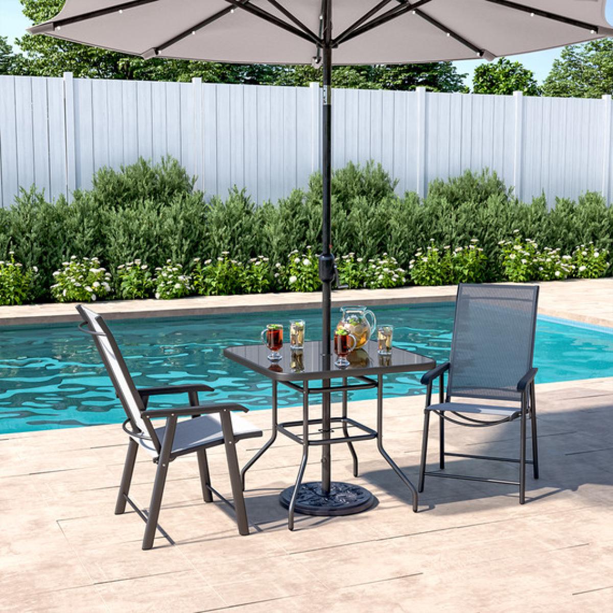 I’m a fan of how this black square set brings a crisp, contemporary feel without overwhelming smaller outdoor or dining spaces. The slim metal frame and weather-proof fabric chairs work equally well in urban balconies, minimalist kitchens or laid-back terraces. For practical styling, dress it up with a couple of patterned cushions in muted tones and a small potted plant or lantern centrepiece. An outdoor rug can help define the area, while a lightweight throw ensures your guests stay comfortable as the evening cools.