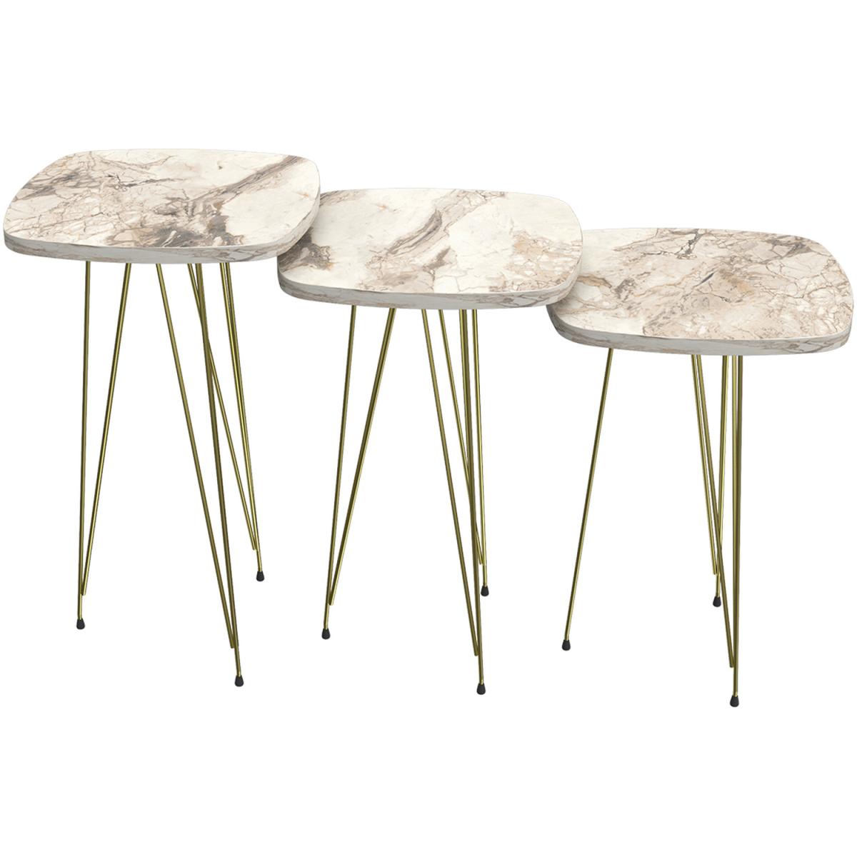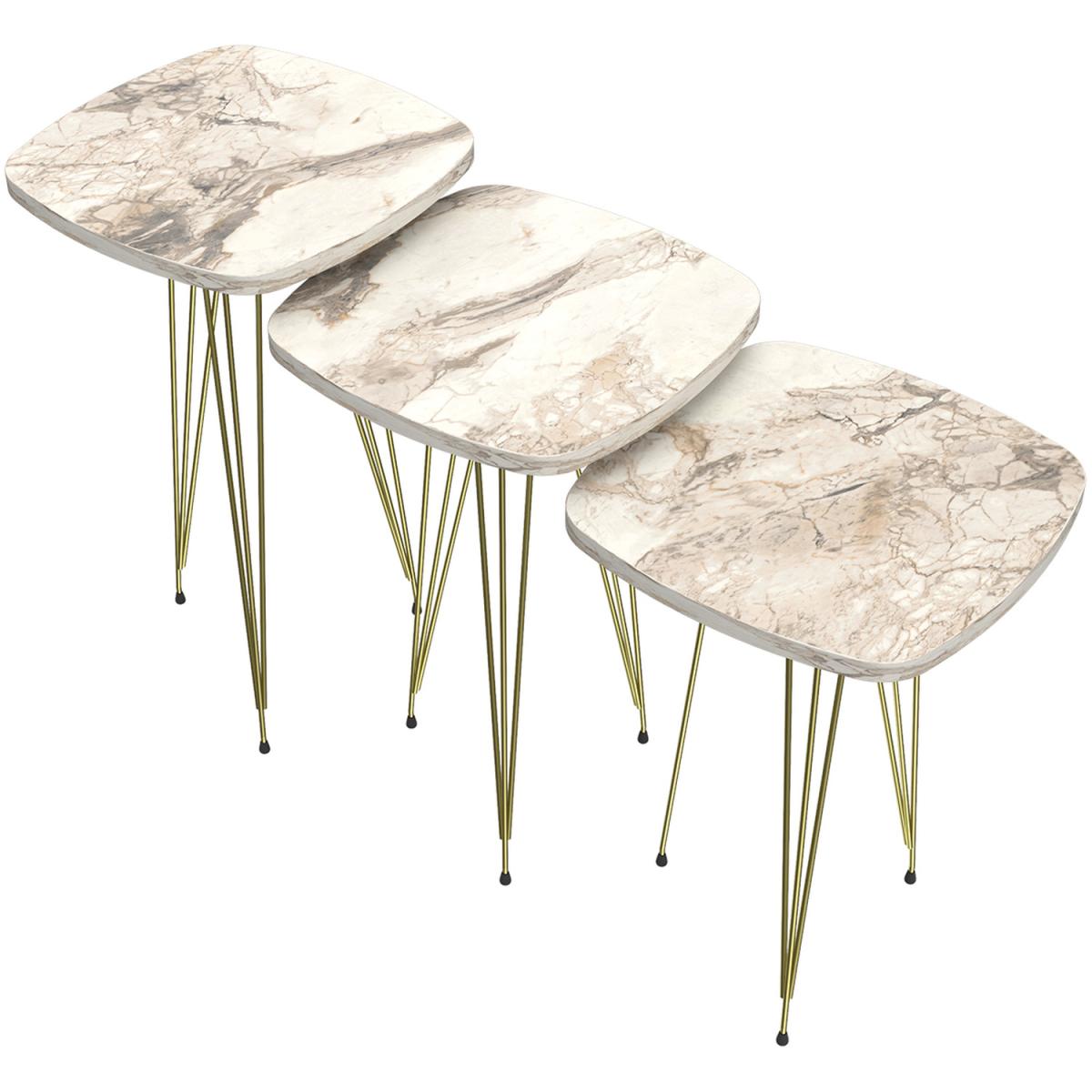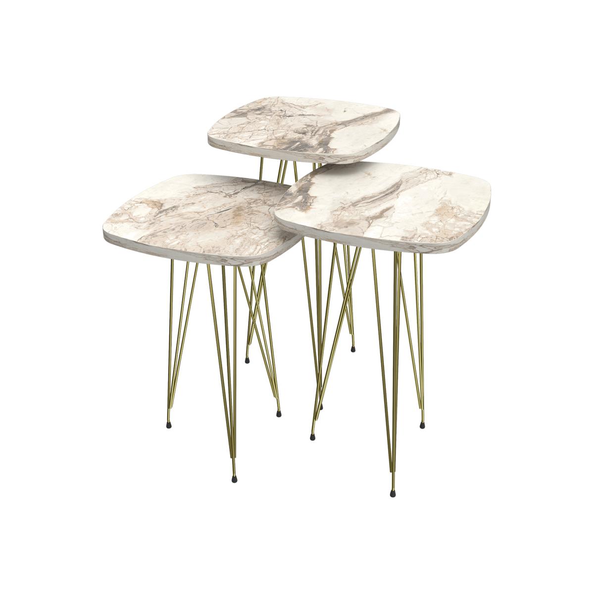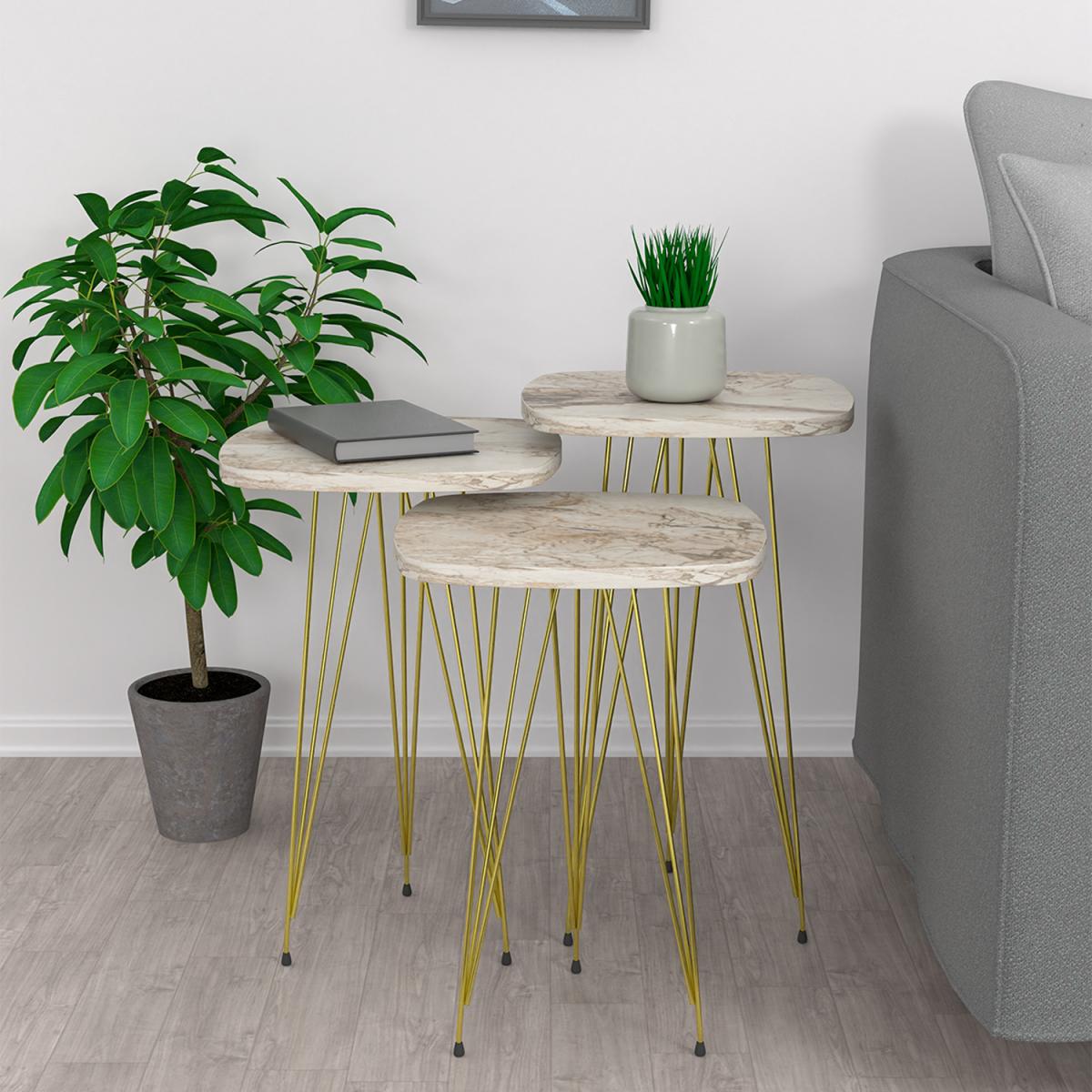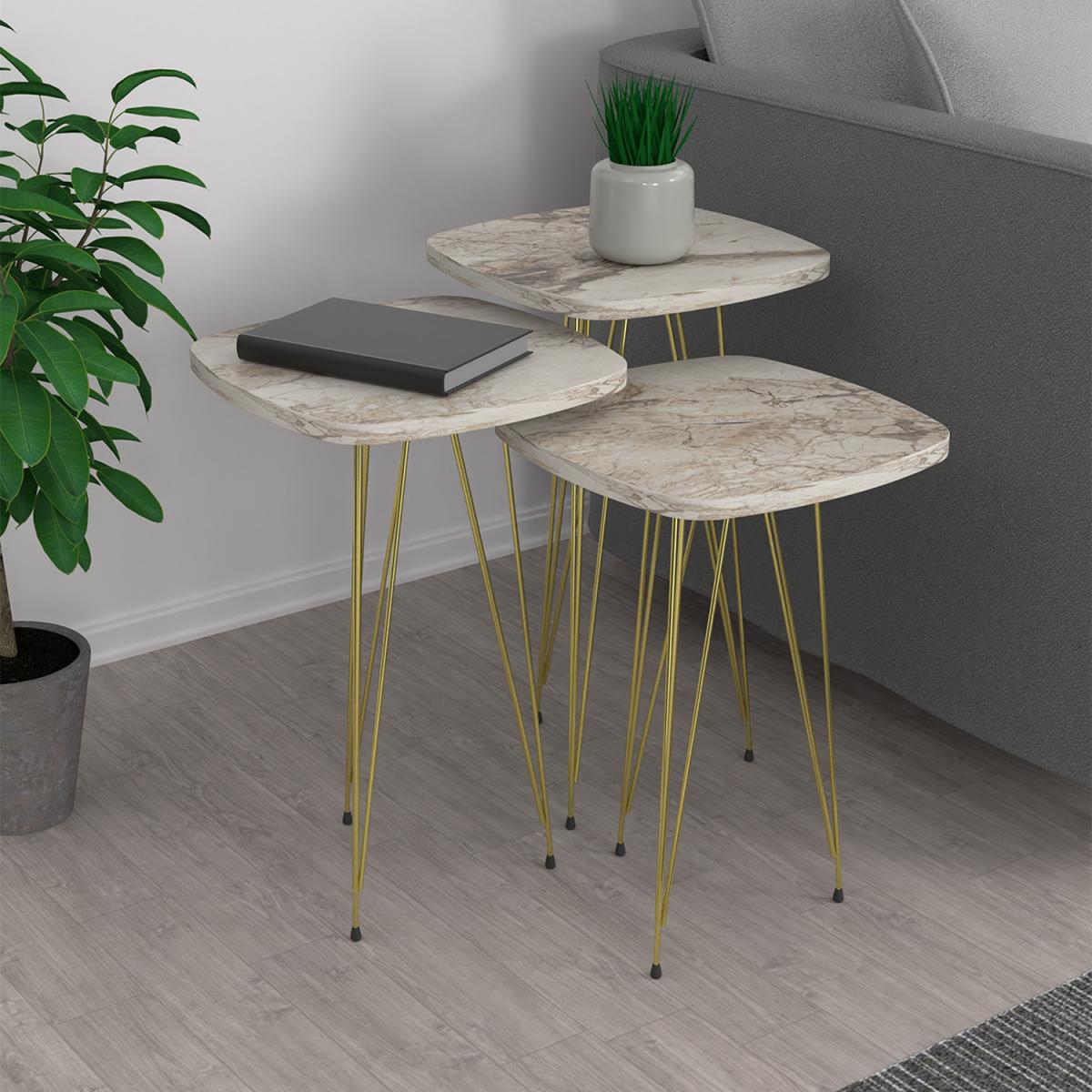 Bring a streamlined modern style to your seating ensemble with this retro side table. The set includes 3 nesting tables which are ideal for using separately or stack together in different occasions. However, the small table can also fit neatly under the larger table for easy storage, making this a great furniture set for a small space. They can also be used as bedside tables, side tables, end tables, square coffee tables, telephone tables or nightstands making them a versatile living room furniture set. Square design can be placed in corners to save space. Quick and easy to assemble, just screw the legs to the table tops, all you need is a screwdriver. Can be used as a set or split up and placed individually. Made with Laminated Particleboard and metal legs, looks elegant and durable. Multi-purpose End Table:Compact size, space-saving and lightweight design, this set of end tables is easy to move. Edge design can prevent potential damage and injuries. Made of Marble Veneer and sturdy Laminated Particleboard with 3 metal gold metal legs, it is durable enough to meet long-term needs. Also, it is practical for you to store things and save space. Featuring sturdy metal legs, these tables are built to last and will be a practical addition to your home for years to come. Table legs with floor protection, an anti-slip plastic pad on the bottom of the coffee table legs makes it more stable and prevent noise and scratch to the floor.