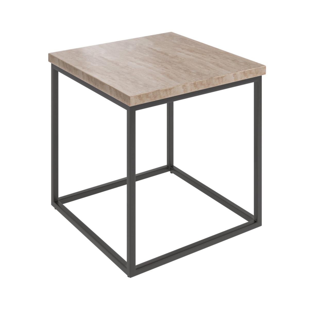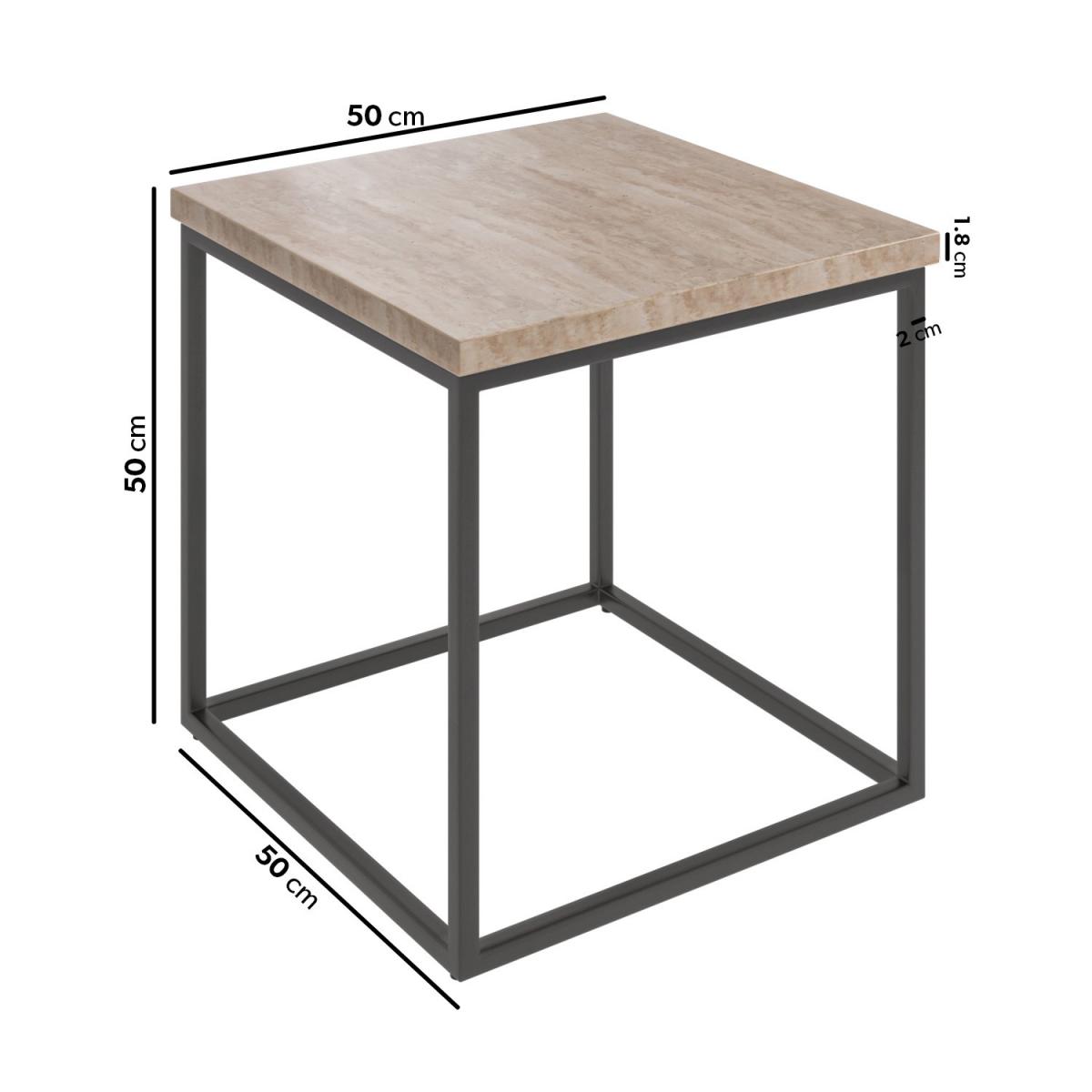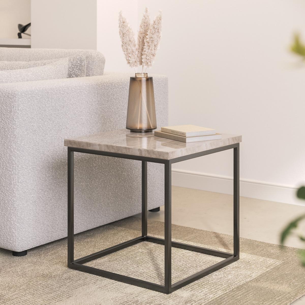 All about me Give your living space a contemporary lift with this Demi side table. Its stunning beige travertine effect top and contrasting pewter metal base give it an industrial aesthetic that's so on-trend. Place at the side of you for instant access, or brighten up a dark corner with the addition of a lamp or floral arrangement. Need to know Product dimensions: W50 x D50 x H50 cm Product weight: 7kg Maximum load weight: 100kg Colour: Beige (tabletop) and pewter (frame) Finish: Lacquered (table top) and powder-coated (frame) Material: MDF with paper foil (table top) and metal (frame) For use: Indoors Assembly required: Yes Packaging dimensions: W62 x D62 x H15.5 cm Packaging weights: 8.5kg