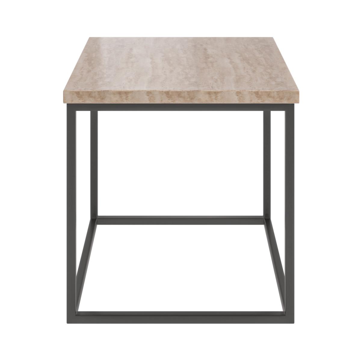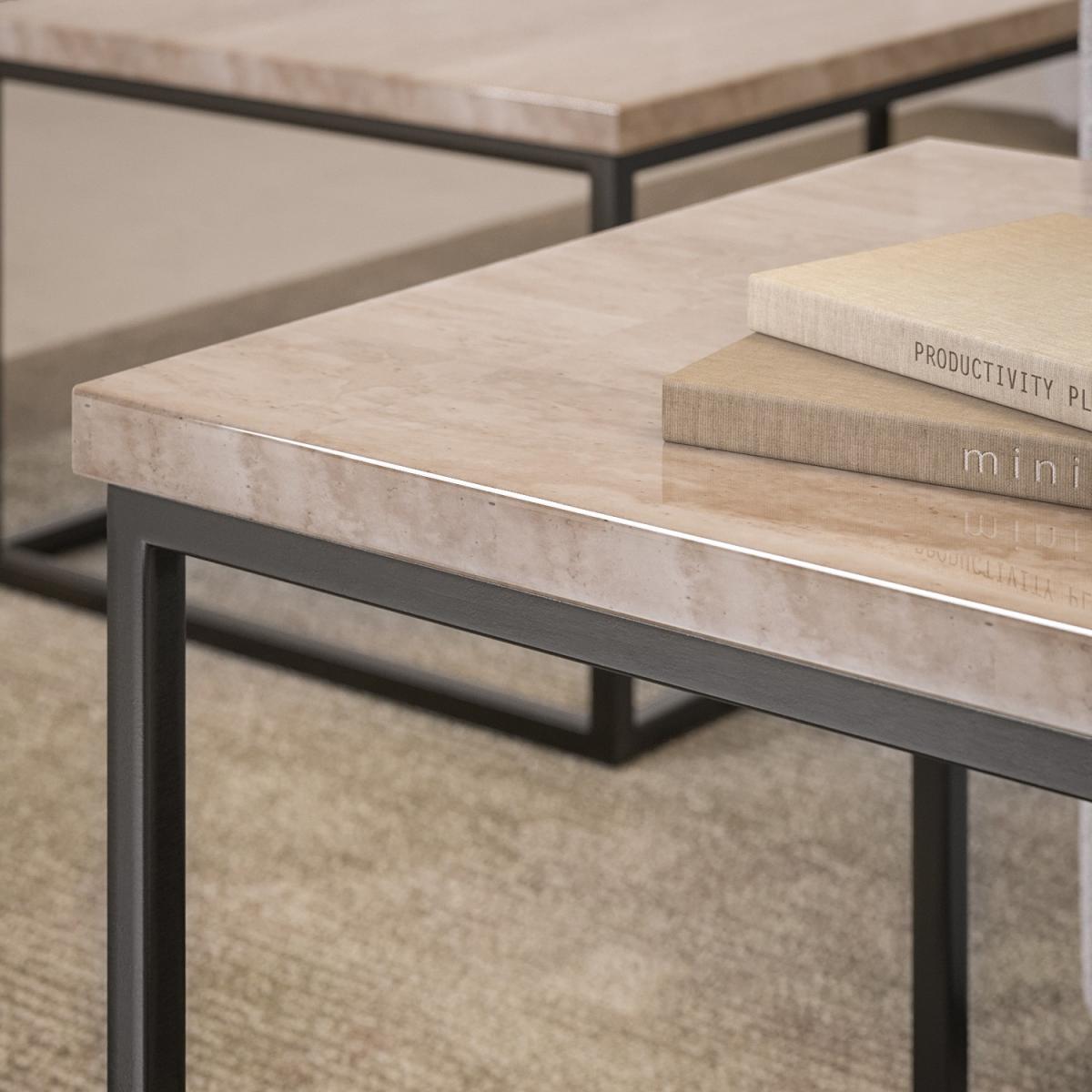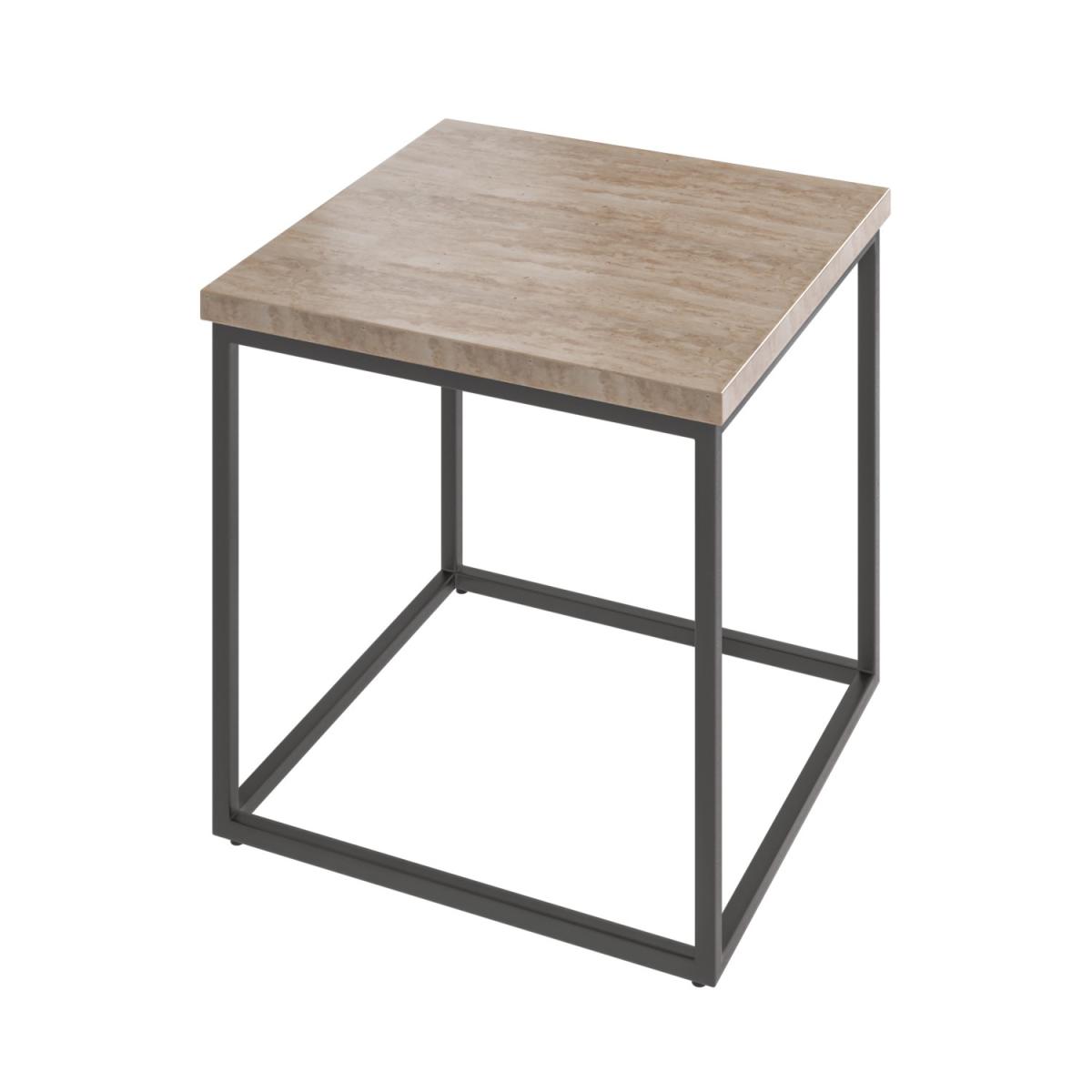 All about me Give your living space a contemporary lift with this Demi side table. Its stunning beige travertine effect top and contrasting pewter metal base give it an industrial aesthetic that's so on-trend. Place at the side of you for instant access, or brighten up a dark corner with the addition of a lamp or floral arrangement. Need to know Product dimensions: W50 x D50 x H50 cm Product weight: 7kg Maximum load weight: 100kg Colour: Beige (tabletop) and pewter (frame) Finish: Lacquered (table top) and powder-coated (frame) Material: MDF with paper foil (table top) and metal (frame) For use: Indoors Assembly required: Yes Packaging dimensions: W62 x D62 x H15.5 cm Packaging weights: 8.5kg