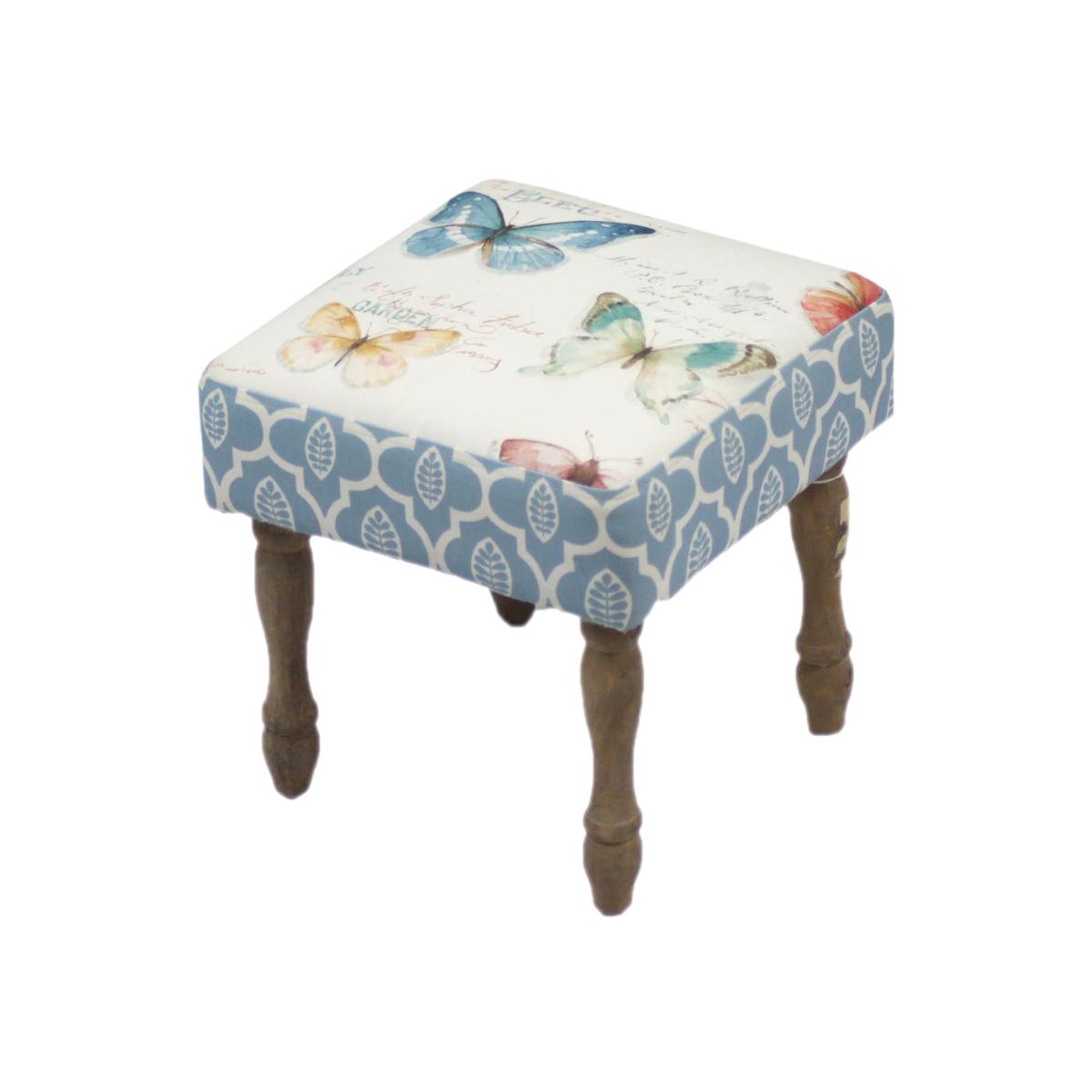 I love this little blue chair because it effortlessly adds colour and charm to a variety of interiors. Its compact, square shape makes it quite versatile - perfect as an accent piece in a bedroom, dressing room, or even a cosy corner in a living space. The butterfly print gives it a playful, yet refined feel, so pairing it with neutral or pastel tones allows it to stand out without overwhelming the room. Practical styling tips include using it as a footrest, a side table for a tray, or even as a statement piece to introduce colour in a minimalist setting. Its wooden legs add a touch of elegance and contrast beautifully with the fabric, making it suitable for both traditional and contemporary styles.