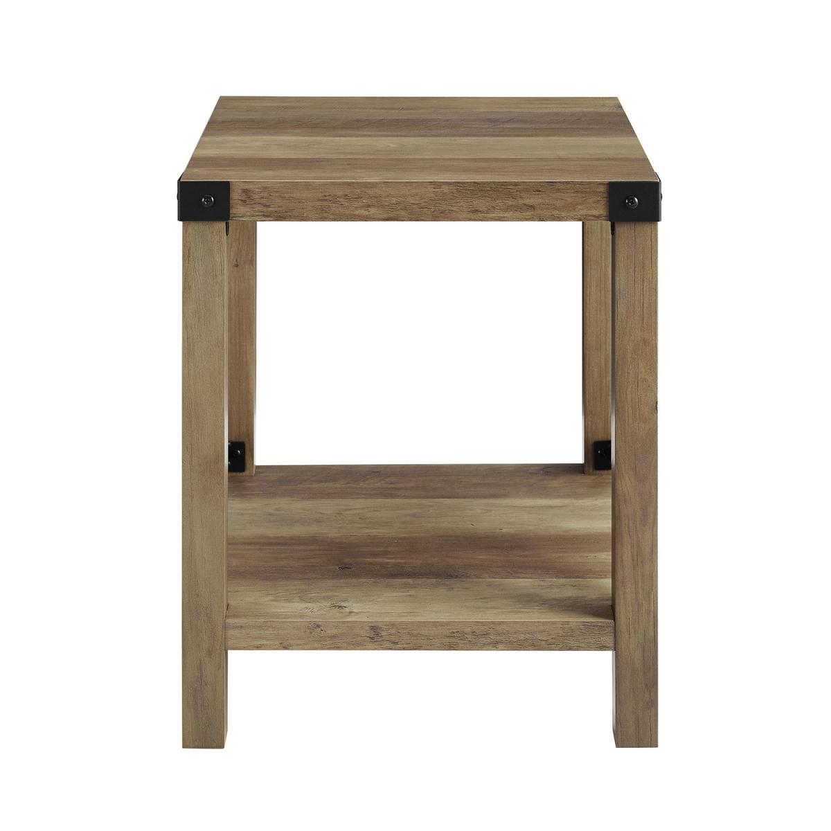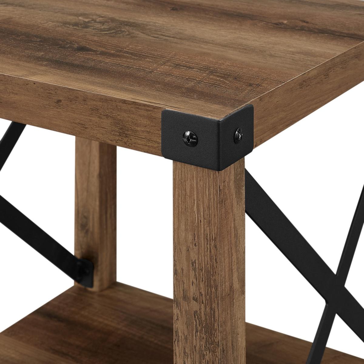Perfect your living room with this urban industrial side table featuring a metal x-shaped frame. This rustic styled accent table gives an industrial look to any room in your home. With accents of metal throughout starting from each table top corner to the x design on the two sides of the table. These black painted metal pieces work against the solid design, while the built-in shelf and table top provide function.