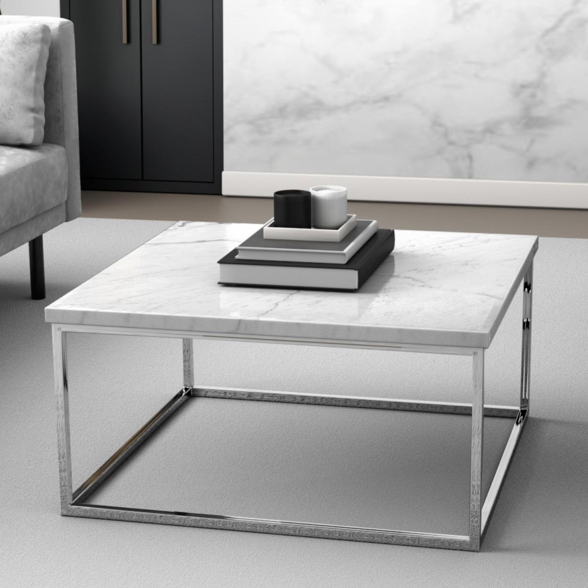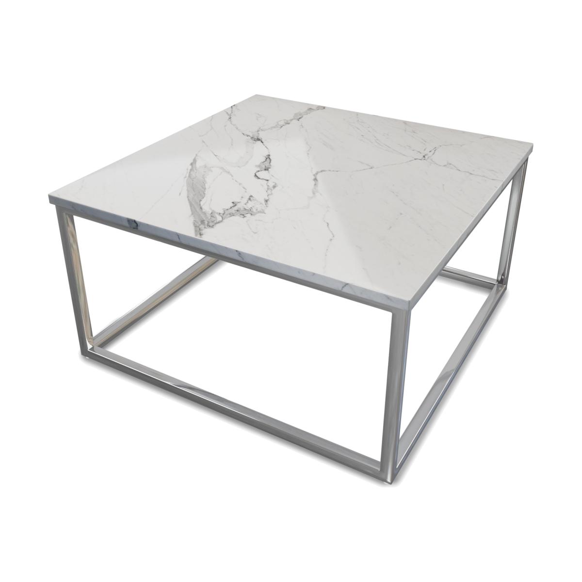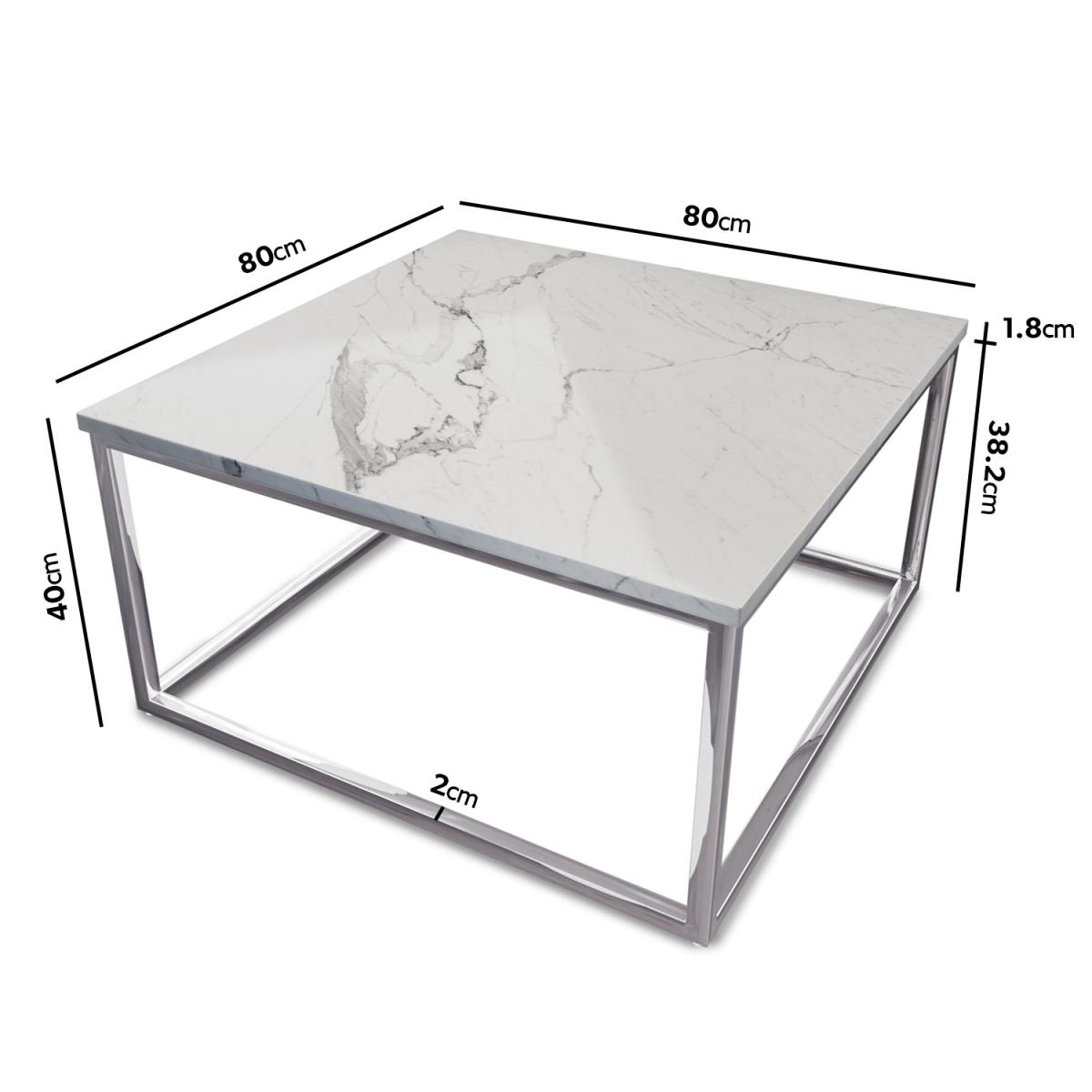 Features we love Square coffee table with marble effect top Open chrome base creates the illusion of space Modern design complements any living room. Durable lacquered finish offers style that lasts. Matching pieces available just search Demi. All about me. This small and handy coffee table is the perfect addition to any living room. With a lacquered marble design it’s modern contemporary feel will suit a wide range of spaces. The open square chrome base creates the illusion of space and also offers a handy space to put folded throws/blankets. Discover the matching pieces in the range online too the matching side table or console table would be an excellent fit with this coffee table. Need to know. Dimensions. H40 x W80 x D80cm Weight. 13kg Colour. White Finish. High gloss lacquer and polished stainless-steel Material. MDF and stainless-steel Assembly required. Yes..