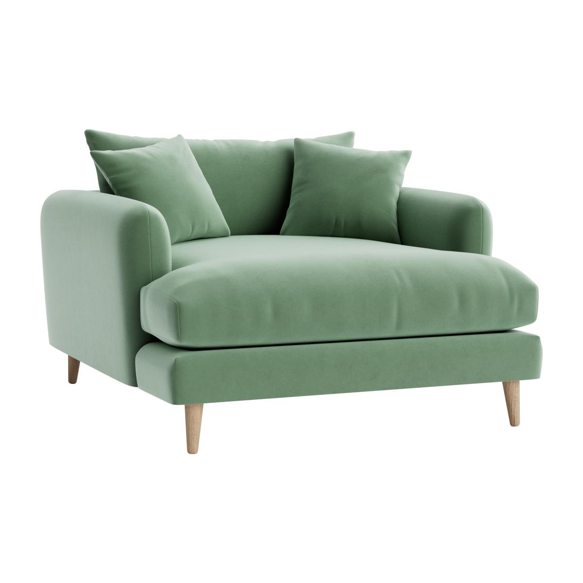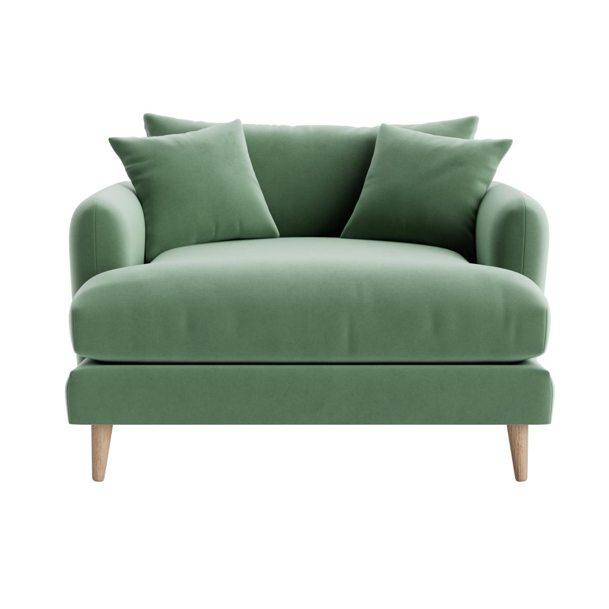 I love the squishmeister for its versatile and inviting design; it’s perfect for both cosy living rooms and more modern, minimal interiors. Its soft green hue adds a fresh, calming touch that works well with neutrals and earthy tones, making it a great statement piece without overpowering the space. Styling tip: it pairs beautifully with layered textures like plush throws and decorative cushions in complementary shades. For practical styling, try placing it against a lighter wall to make the colour pop, or anchor it with a patterned rug to add visual interest. Its plush seat and relaxed form make it ideal for lounging, while the simple wooden legs keep it looking sleek and contemporary.