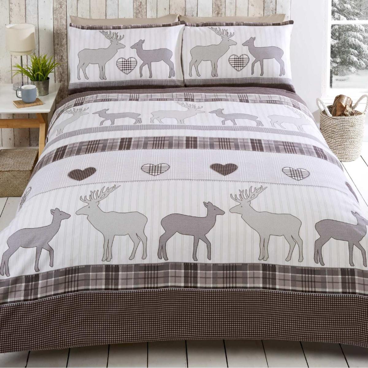 This winter bedding design features on trend stags mixed with traditional tartans. This duvet cover set is fully reversible and is printed on 100 brushed cotton.