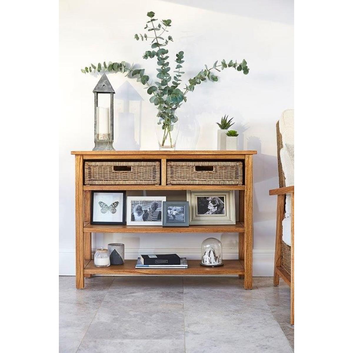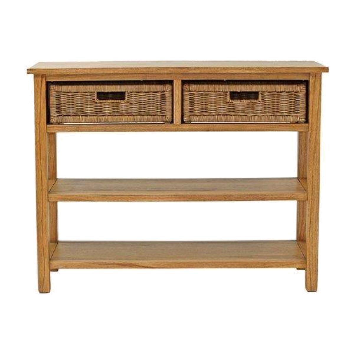 I love this table for its natural, versatile look and practical design. It works particularly well in interiors with a coastal, Scandinavian, or rustic vibe, thanks to its warm wood tone and woven baskets which add texture. It’s great for hallways or entryways where you need storage for keys and mail, but it can also be styled as a sofa table with decorative lamps or plants for a more relaxed look. Practical styling tips include keeping the top surface clear for daily essentials and using the baskets for smaller items like loose change or correspondence. It’s a functional piece that combines simplicity with charm, making it easy to incorporate into various interior styles.