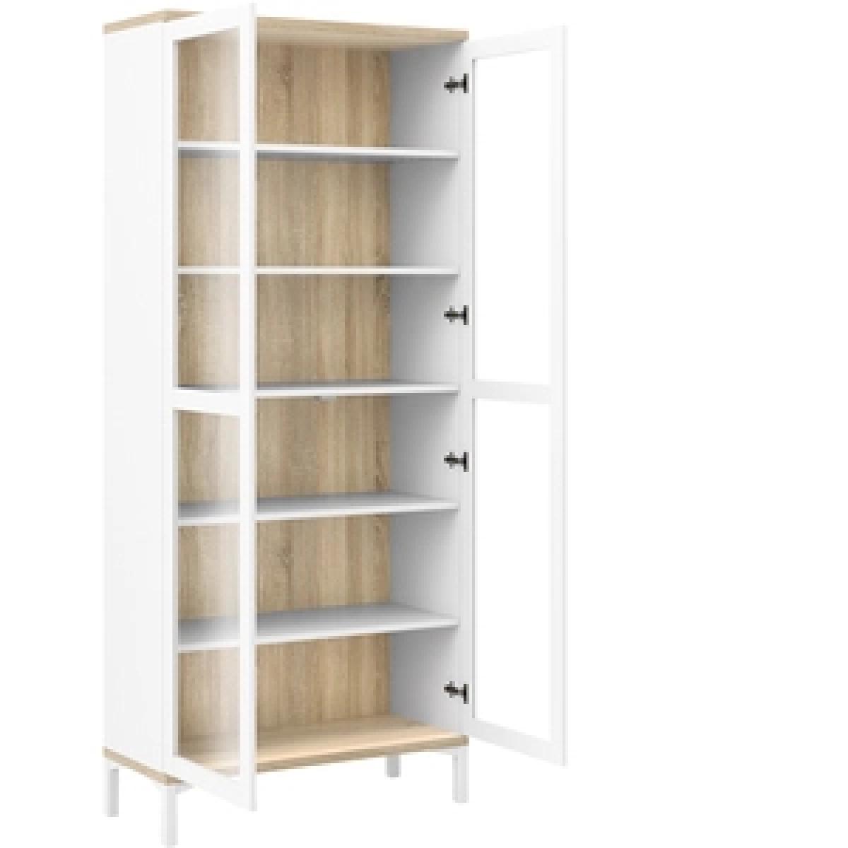 I’m a fan of this black-and-walnut glazed display cabinet for its clean lines and warm backing - it sits just as comfortably in an industrial-style loft as it does in a pared-back Scandi living room. The slender black frame keeps the look light, while the walnut back adds depth and a touch of natural contrast. For styling, group objects in threes or fives and vary their heights; leave a little negative space so your pieces don’t feel crowded. Consider discreet LED strip-lighting on each shelf to highlight glassware or ceramics, and use woven baskets or decorative boxes on lower shelves to keep everyday clutter out of sight.