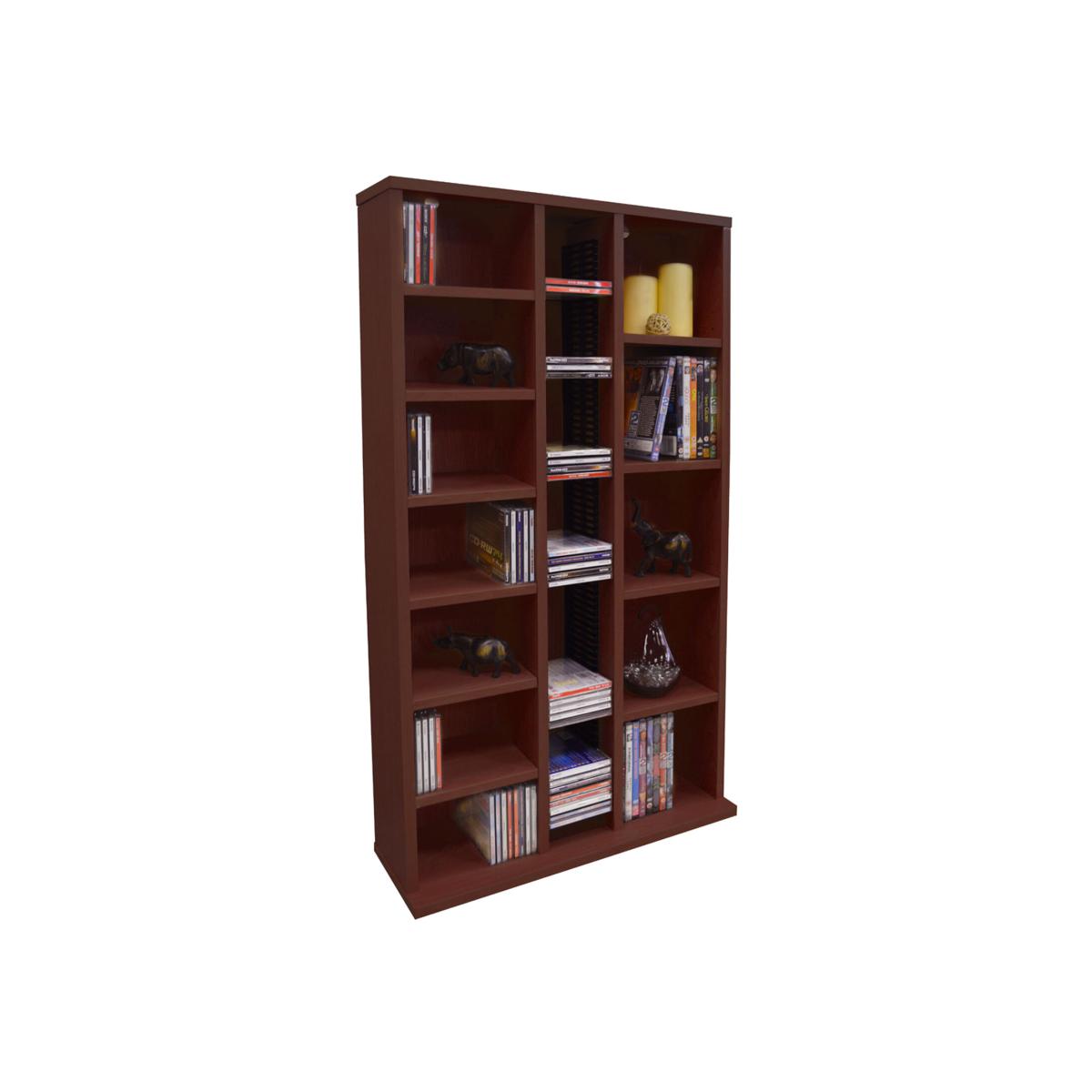 Combination mahogany effect finish multimedia tower, features twelve easy to adjust and two fixed shelves PLUS convenient slot system in the centre to accommodate CDs. CAPACITY 355 CDs or 79 CDs (in centre column) and 130 DVDs Blu-rays computer games (over the two outer columns) or a combination of various media. Wall safety kit included. Display items not included.