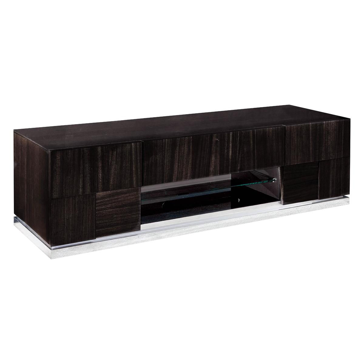 The St Moritz dining collection is as sleek, modern and elegant as you'd expect from prestigious Italian design house ALF. High gloss pedestal tables and cabinets are finished with unique dark grey koto veneers. High backed, luxuriously upholstered chairs with contemporary piping and buttoning detailing complete this glamorous dining collection. Strikingly modern, the St Moritz TV base is a beautiful and functional place to store and display all your media equipment. Stunning and sophisticated, it’s crafted from dark grey koto wood and veneers and takes full advantage of the lovely grain of the koto wood to create stunning geometric patterning. It’s finished with high-gloss lacquer and set on a chrome-effect base. Substantial enough to support even a large TV, this piece features two cupboards, each with a useful shelf, a roomy drawer that’s great for remotes and games’ consoles, and an open area with a clear tempered-glass shelf that’s perfect for media components. Made by Italian designer ALF, the St Moritz TV base is part of the gorgeous St Moritz living and dining range which also includes extending dining tables, a sideboard, and occasional tables.