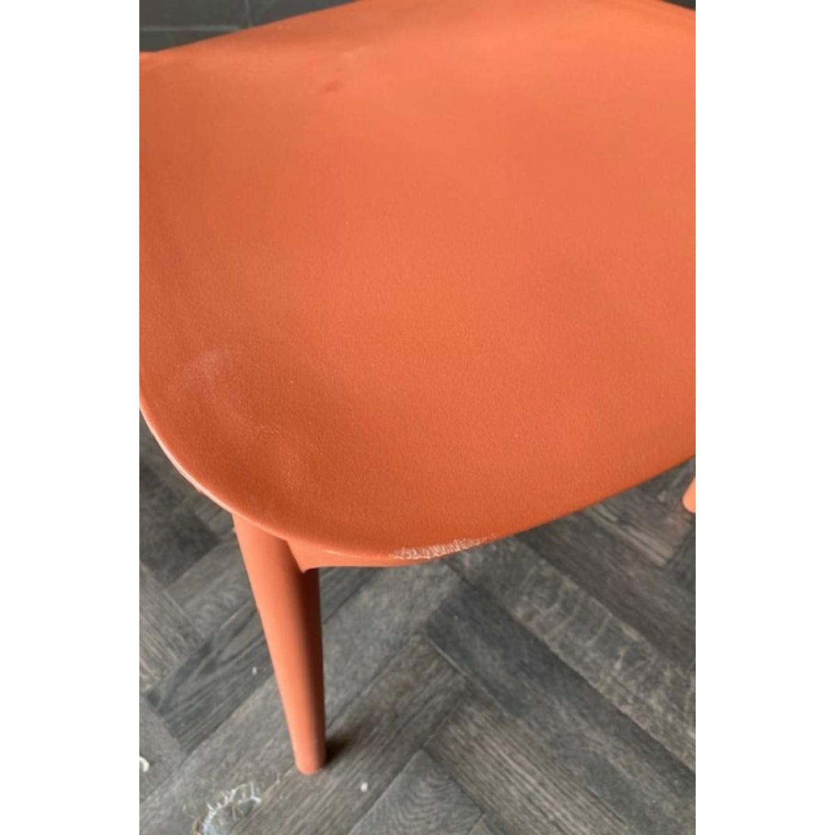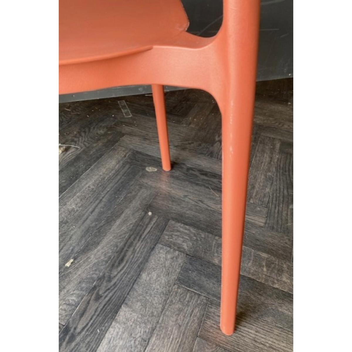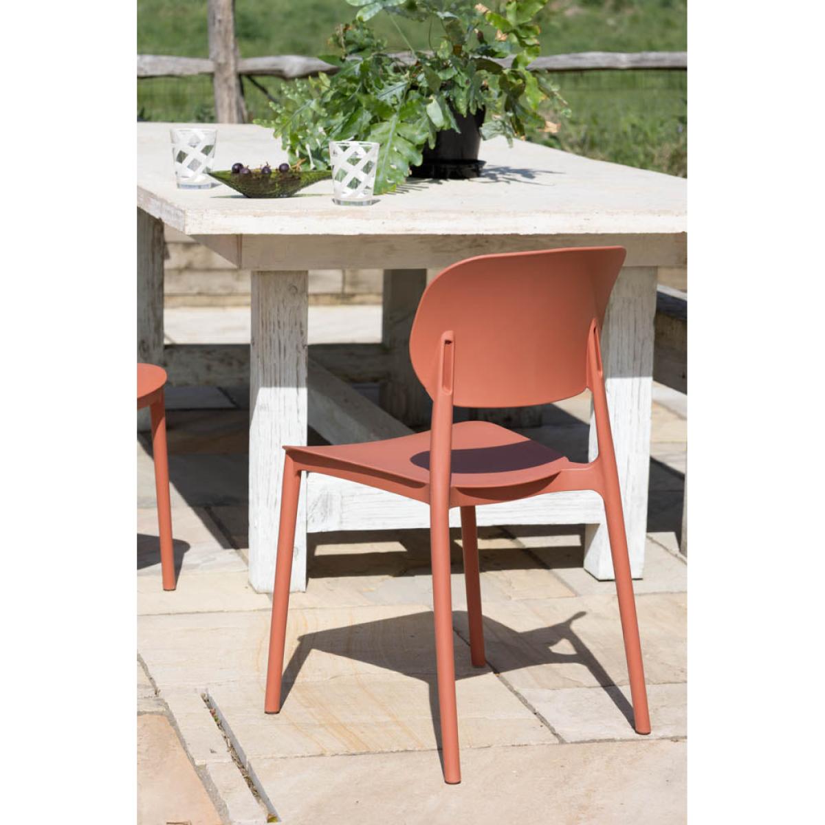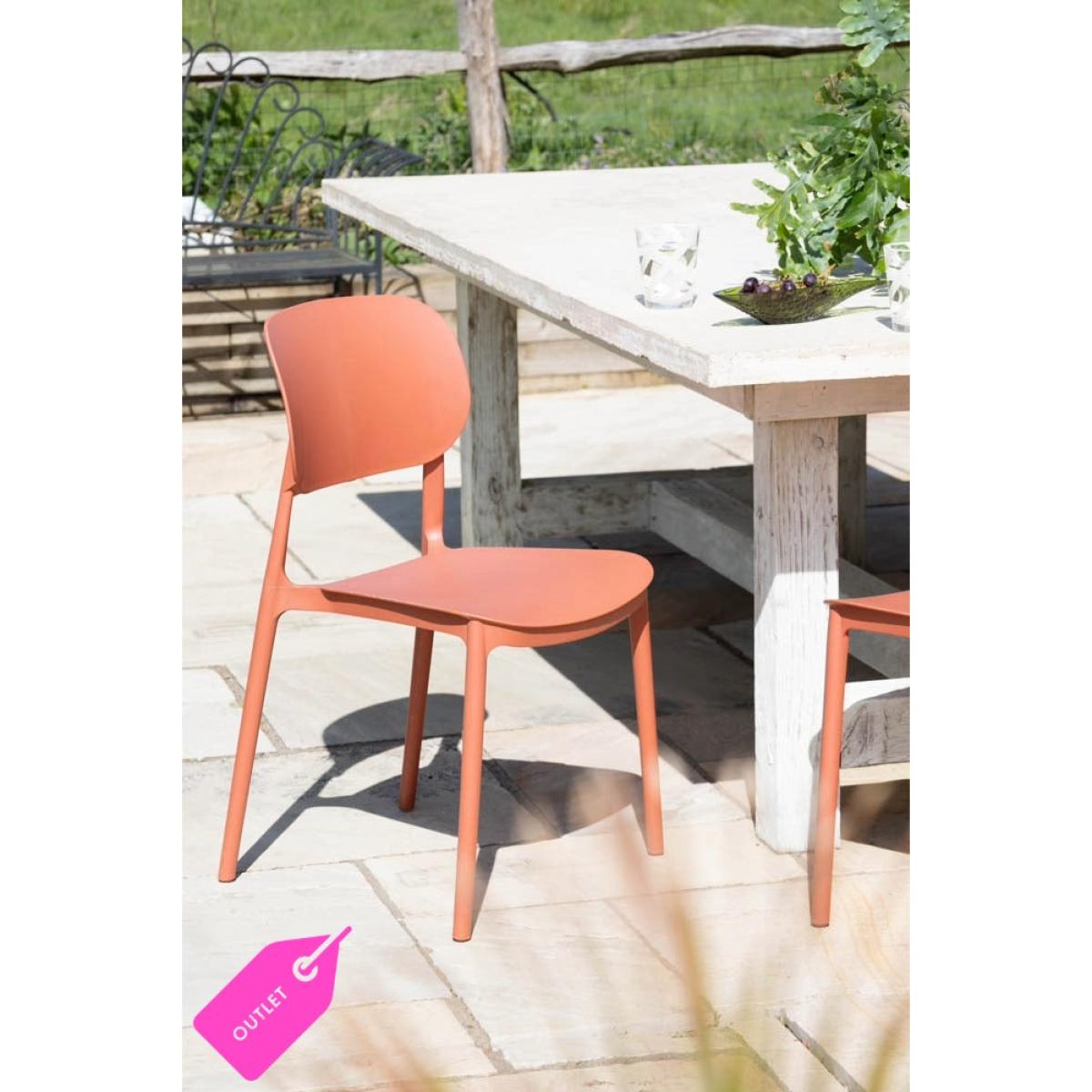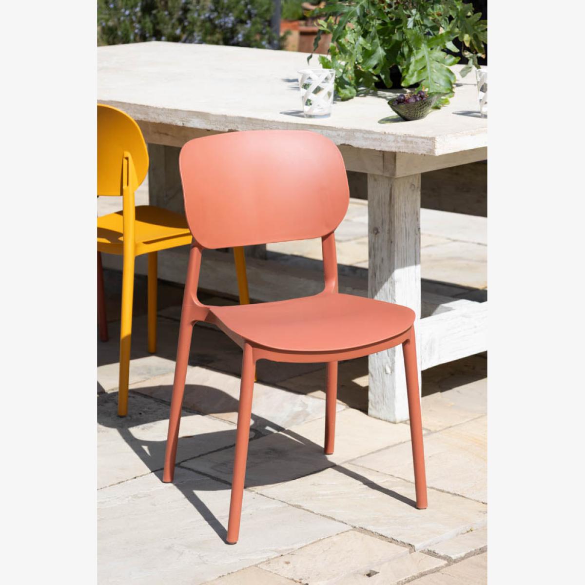 The Stackable Garden Chair in Burnt Orange is designed to bring instant good vibes to your outdoor space. As a SECONDS piece, there are scuffs on the edges of the backrest and seat with scratches to the legs but its sturdy plastic build ensures lasting practicality. The bold burnt orange hue contrasts beautifully with greenery, adding a fresh, uplifting touch to your garden or patio. With its modern design and cut-out backrest for comfort, this chair is perfect for stacking, perching, or lounging al fresco with a drink in hand.- Stackable Garden Chair in Burnt Orange - Measures: W42cm x H81.5cm x D49cm - Material: Polypropylene