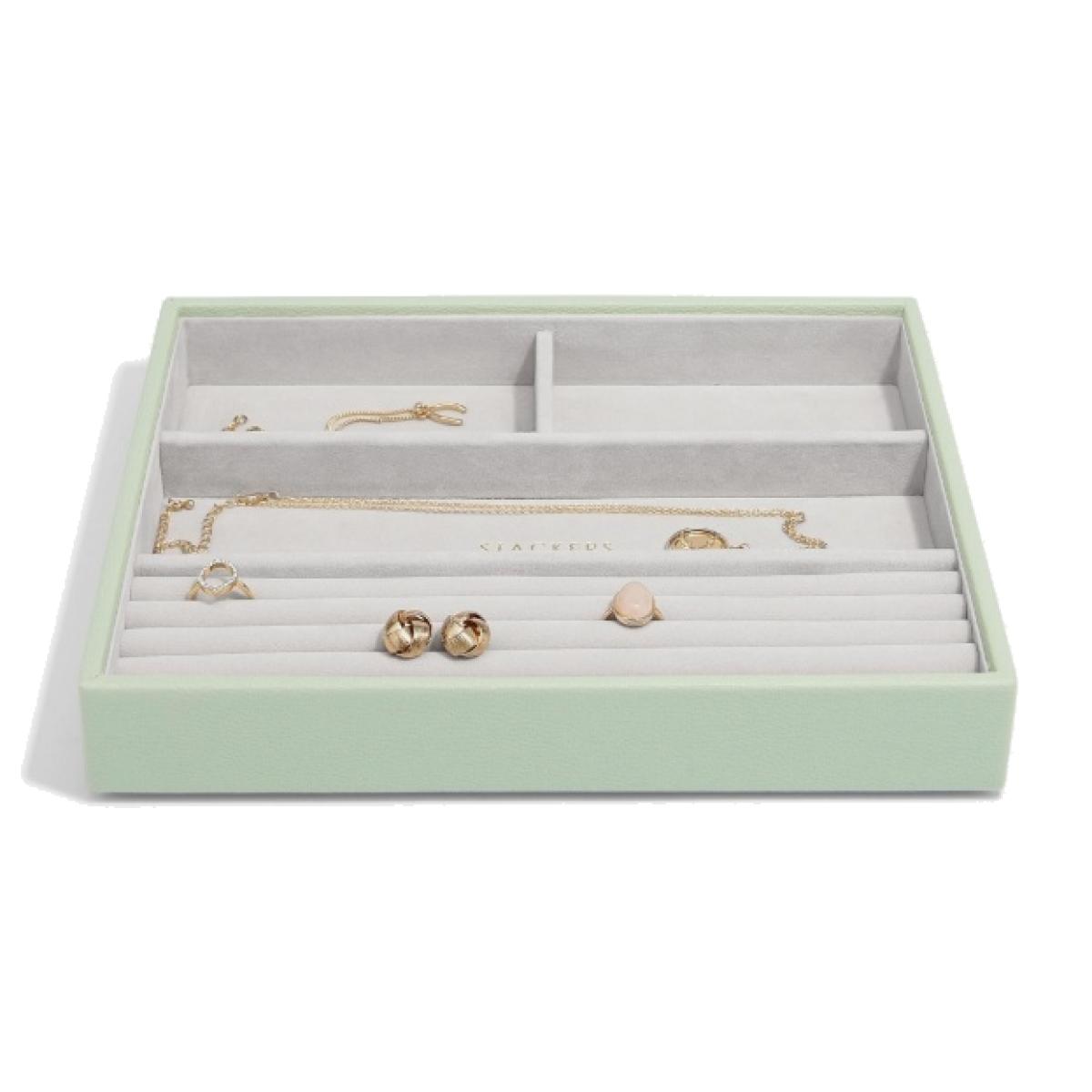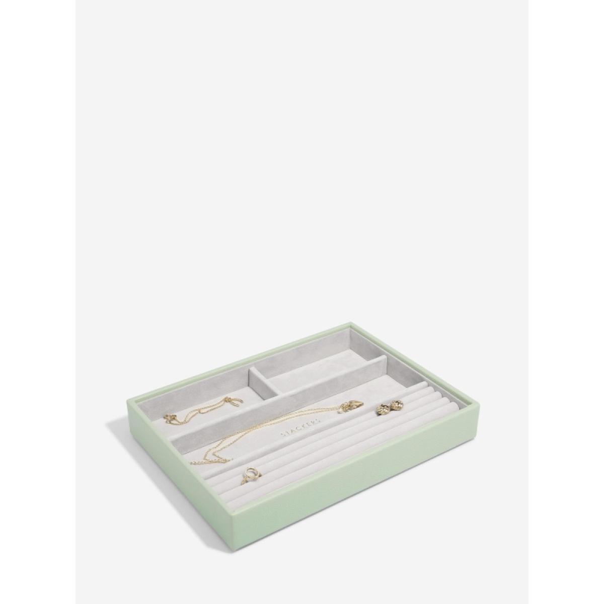 The Stackers Classic 4 Section Ring & Bracelet Layer - Sage Green is the perfect addition to your Stackers Jewellery Box. Designed to store rings, bracelets, and even a few necklaces or statement earrings, this layer helps you keep your collection beautifully organised and easily accessible. Stackers jewellery boxes are cleverly designed so you can build your own by selecting the layers and accessories that best suit your needs. Alternatively, each layer can be used on its own as elegant in-drawer storage — ideal for keeping your dressing table clear and clutter-free. Finished in a soft faux-leather Sage Green exterior with a luxurious velvet lining to protect your jewellery from scratches and damage. Dimensions: Width: 25 cm Height: 3.7 cm Depth: 18 cm
