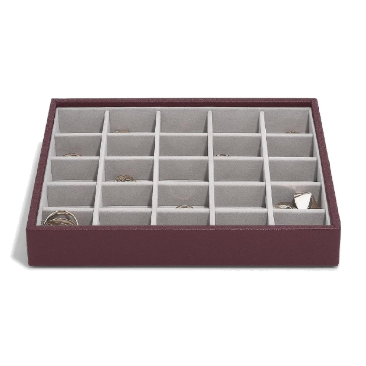 Keep your smaller jewellery pieces organised with the Stackers Classic Trinket Layer – Burgundy. Featuring multiple compartments, it’s perfect for earrings, rings, and delicate chains. This layer can be added to your existing Stackers jewellery box or used as a stand-alone organiser on a dresser or in a drawer. Stackers jewellery boxes are cleverly designed so you can build your own collection by choosing the layers and accessories that best suit your needs. Finished in a rich faux-leather Burgundy exterior and lined with a luxurious velvet interior, it protects your jewellery while adding a touch of elegance. Please note: The dividers in this section are not removable. Dimensions: Width: 25cms/9.8inches Height: 3.7cms/1.5inches Depth: 18cms/7.1inches