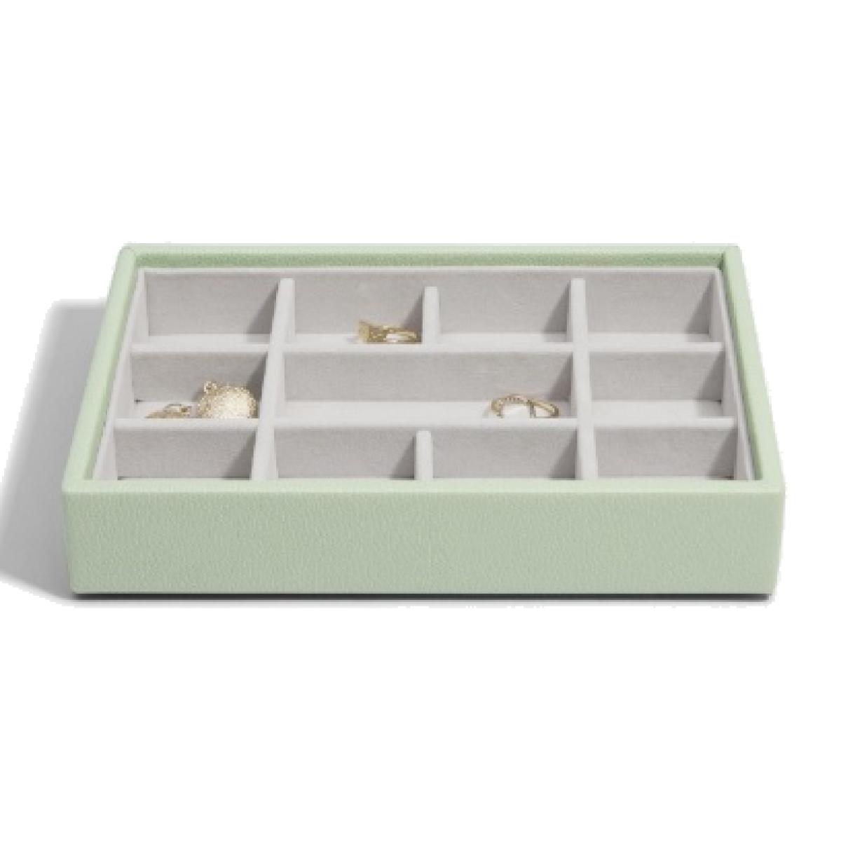 Keep your smaller jewellery pieces beautifully organised with the Stackers Mini Trinket Layer – Sage Green. Designed with multiple sections, it’s perfect for storing earrings, rings and delicate chains. Use it as part of your Stackers Mini Jewellery Box or as a stand-alone storage piece on a dresser or in a drawer. The signature Stackers design lets you build and customise your jewellery box to suit your collection. Lined with a soft velvet interior to protect your jewellery, and finished in elegant faux-leather for a timeless look. Please note: The dividers in this section are not removable. Dimensions: Width: 18cm Height: 3.7cm Depth: 12.5cm