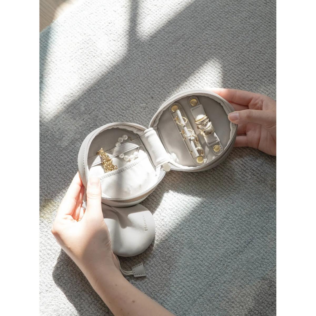 Keep your sparkle close wherever you are with the Stackers Round Jewellery Roll in Limestone. This elegant piece combines a sleek faux leather exterior with a soft velvet lining, offering both sophistication and protection for your treasured jewellery. Perfect for travel or displaying on your dressing table, it features thoughtfully designed interior pockets to store and safeguard your rings, necklaces, earrings, and other precious pieces. Features: Timeless limestone faux leather exterior Luxurious velvet-lined interior for gentle protection Multiple compartments for easy organisation Compact, stylish, and ideal for travel Dimensions: Width: 11.5 cm Depth: 11.8 cm Height: 5.5 cm A chic and practical essential, the Stackers Round Jewellery Roll keeps your favourite accessories beautifully organised—whether at home or on the move. Please note, all screens vary in colour reproduction and whilst every effort has been made to display the colour as accurately as possible it is for guidance only.