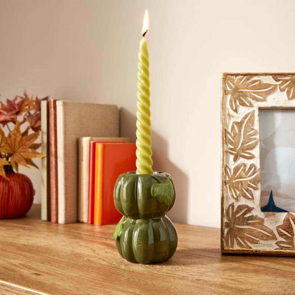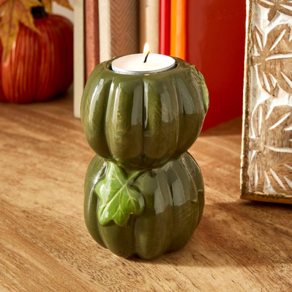 * Autumnal-Inspired Pumpkin Design * Beautiful Green Colourway * Made from Ceramic Add autumnal-inspired charm to your home with this pumpkin candle holder. Made from ceramic, it's dressed in an eye-catching green colourway and is sure to make a statement.