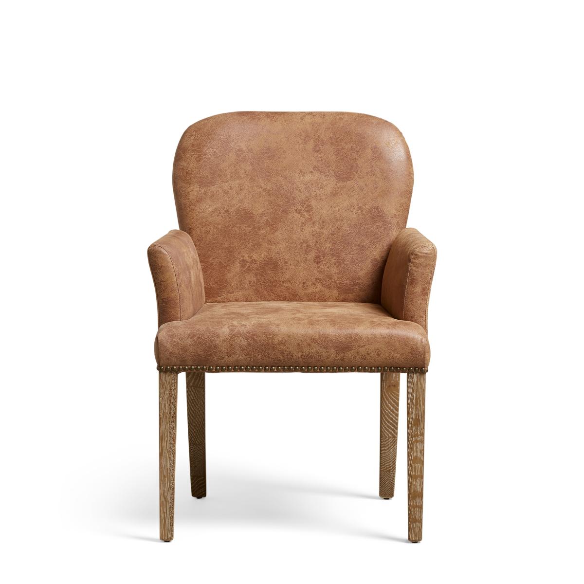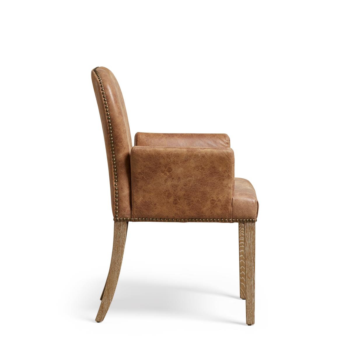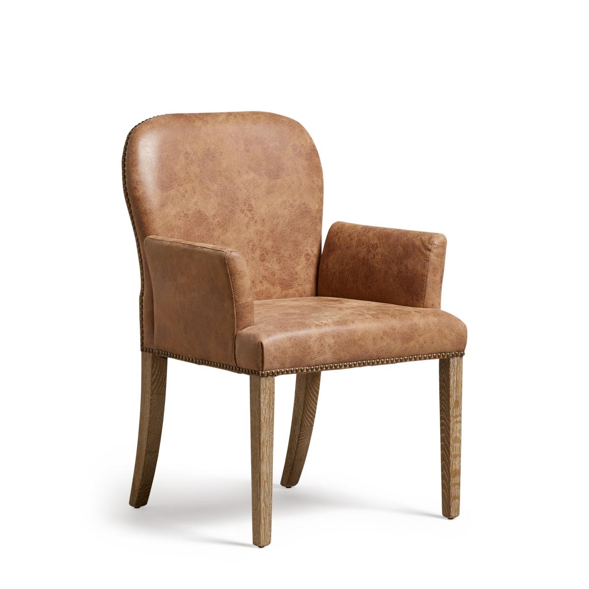 Pair your classic Stafford Dining Chairs with this matching seat, in Aged Tobacco leather. An adaptation of the original popular design, this chair features gently curved arms that lend additional comfort to long, languorous mealtimes. As with the rest of the Stafford Range, this armchair is finished with studding and has a handle crafted into the back to make it easy to move and manoeuvre around the dining table.